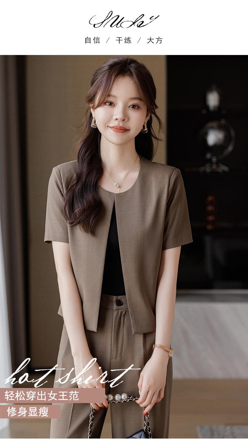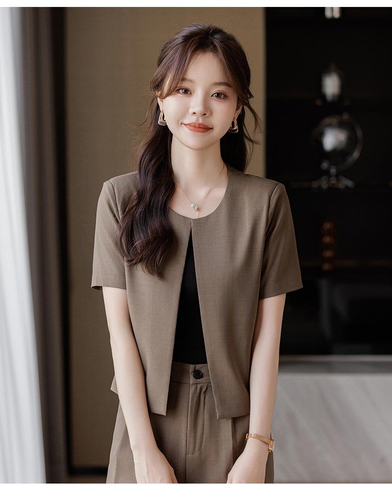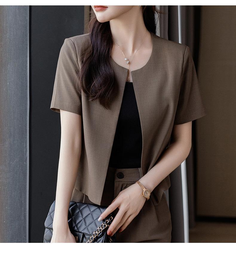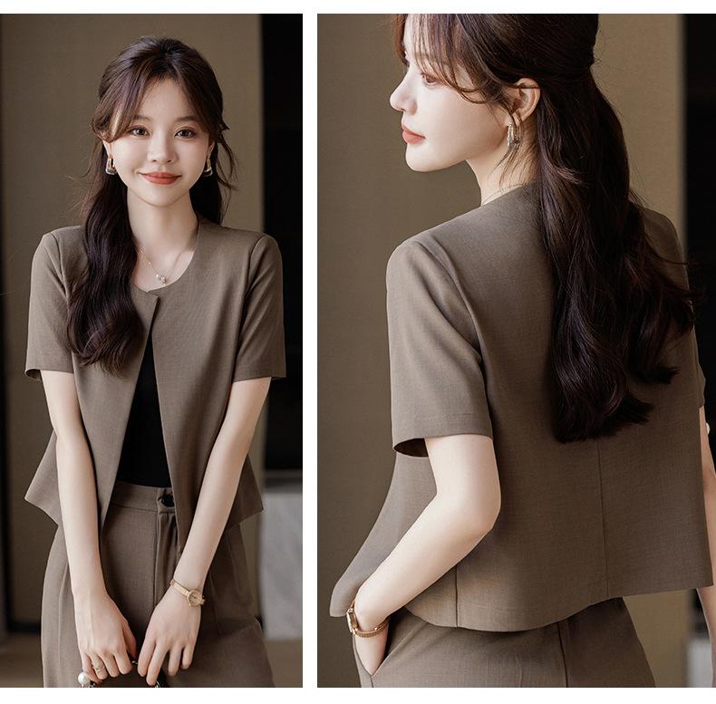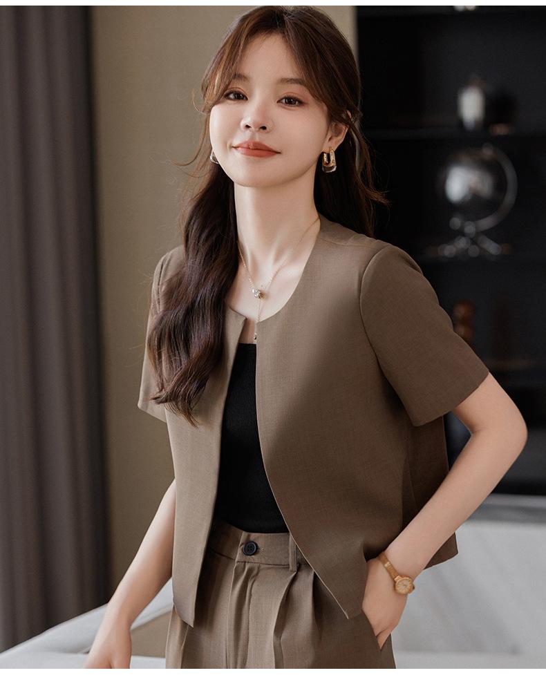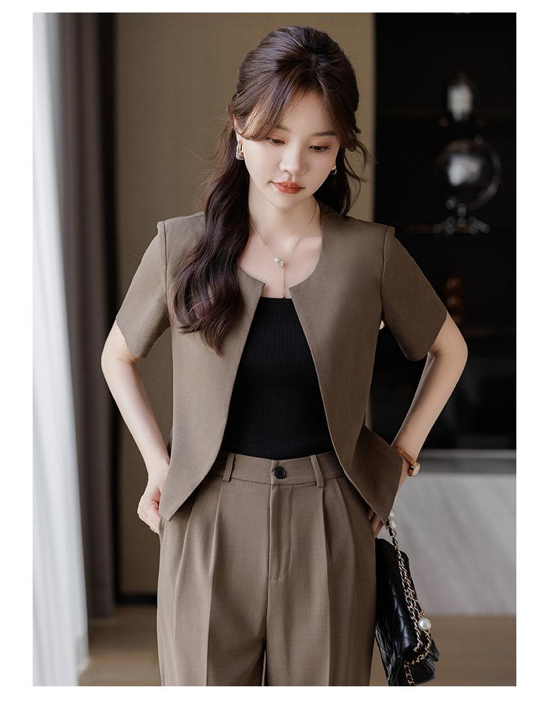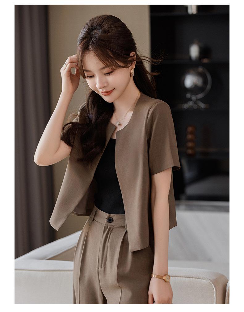 Verano 2024 Nuevo abrigo corto marrón de manga corta sin cuello, pantalones de mujer, traje de dos piezas, moda sencilla.