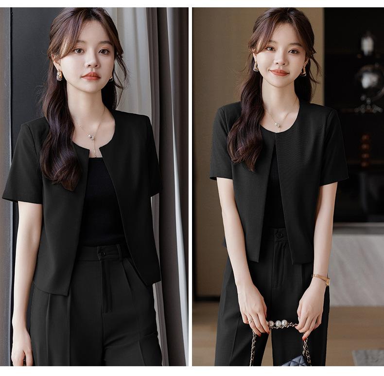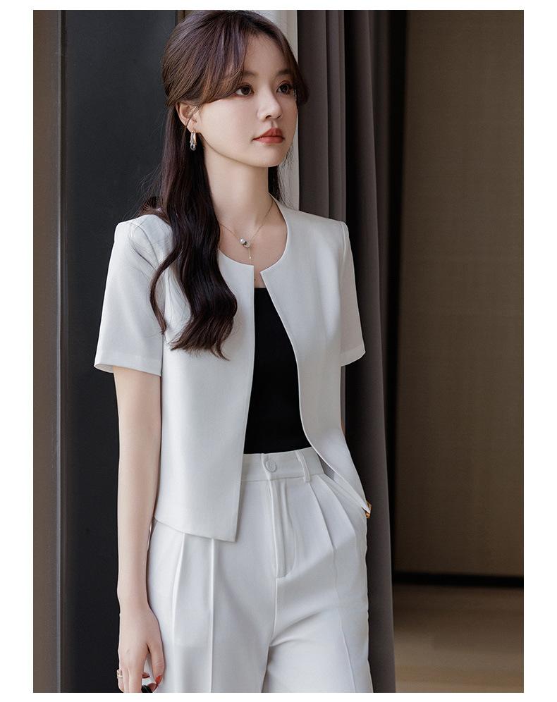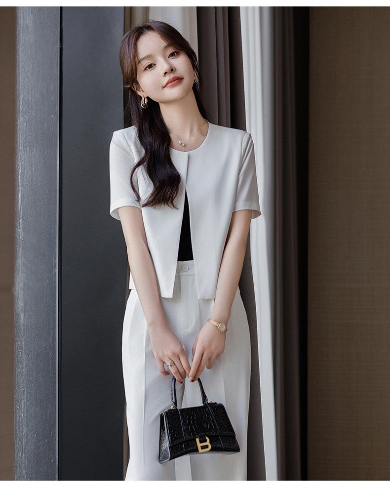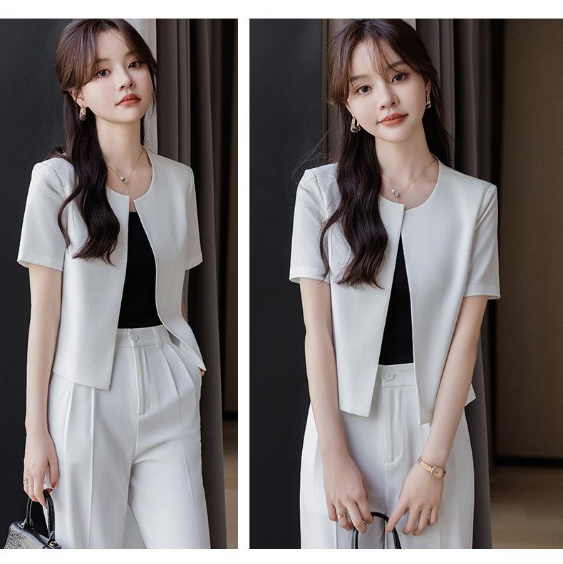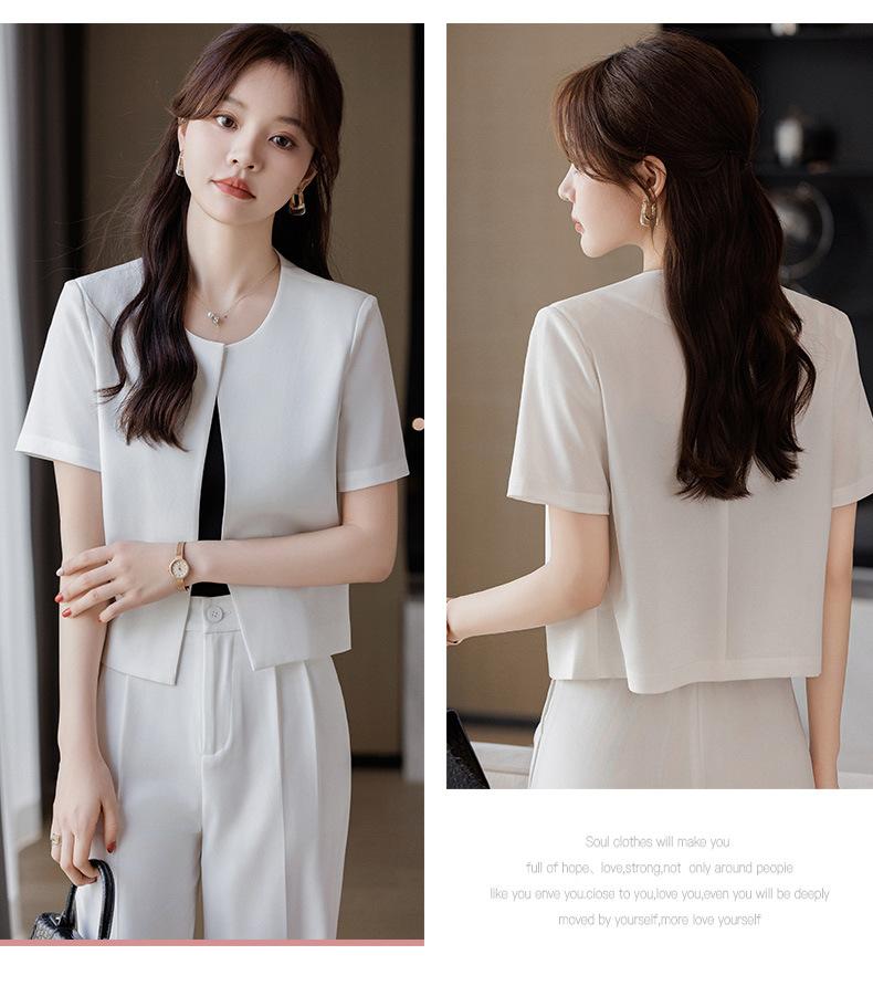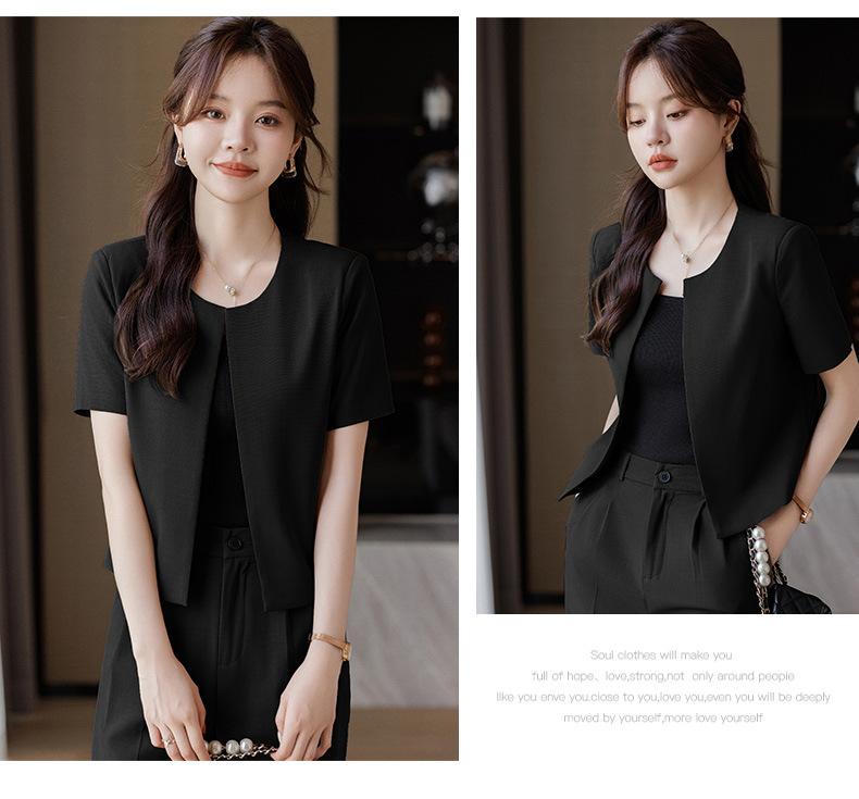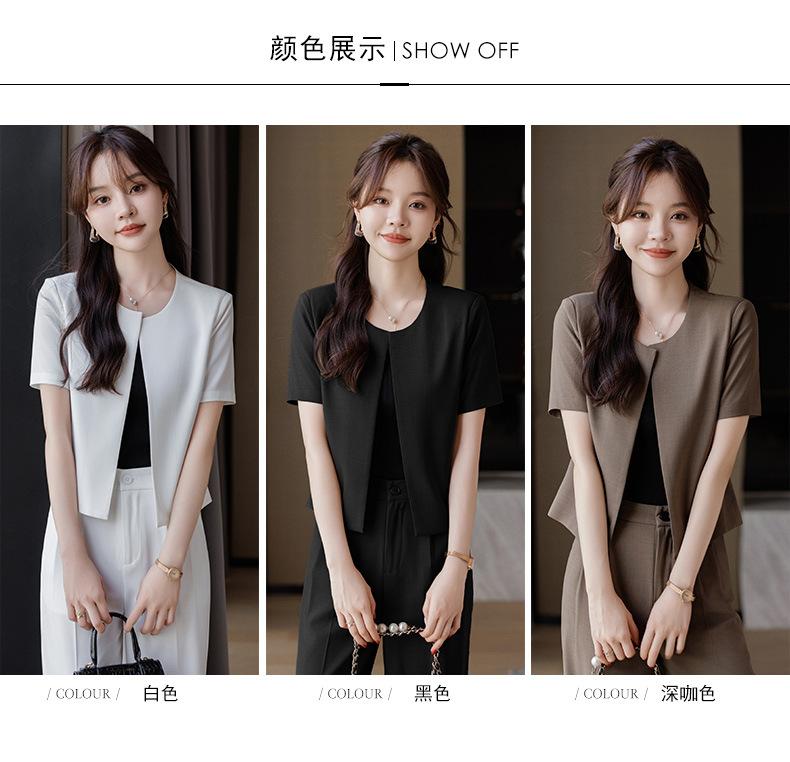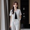 Verano 2024 Nuevo abrigo corto marrón de manga corta sin cuello, pantalones de mujer, traje de dos piezas, moda sencilla.