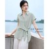 Camisa Azul de Solapa con Pliegues y Manga Corta para Mujer 2025 Verano Nueva Look Adelgazante Nicho Chic Top Camiseta