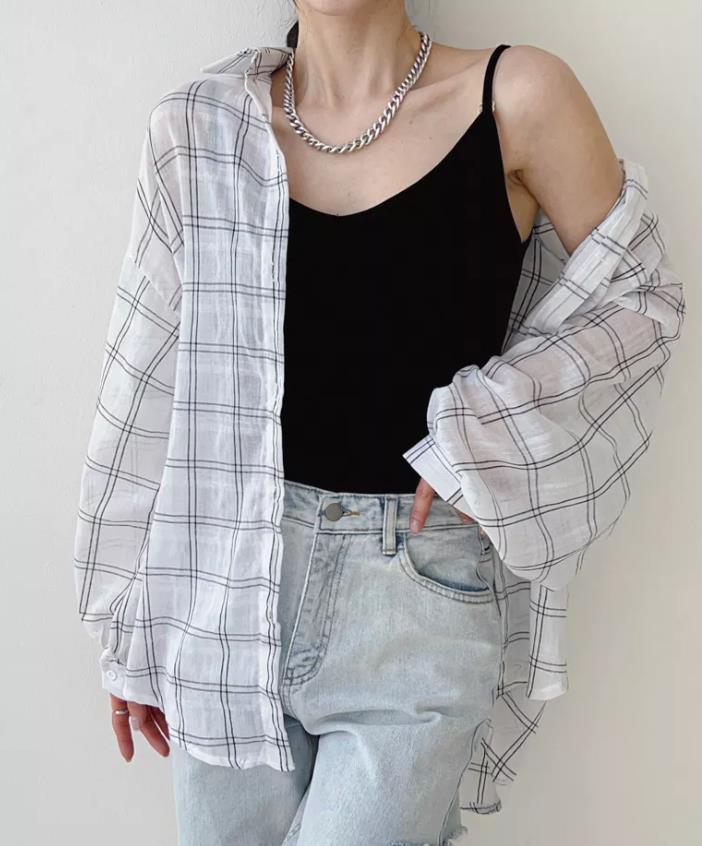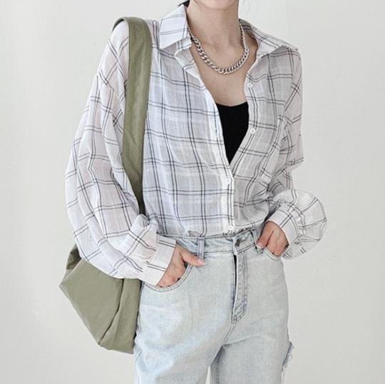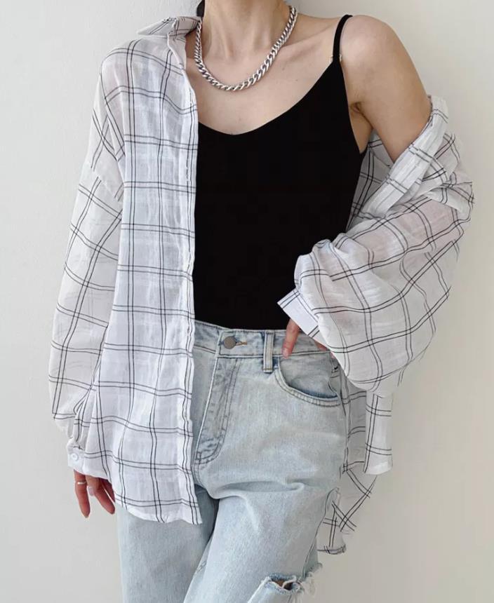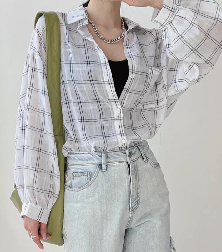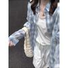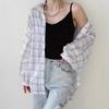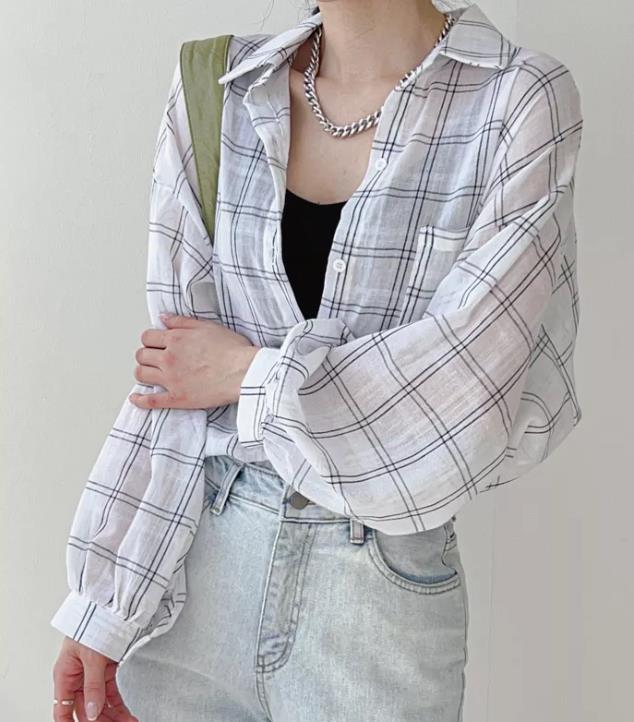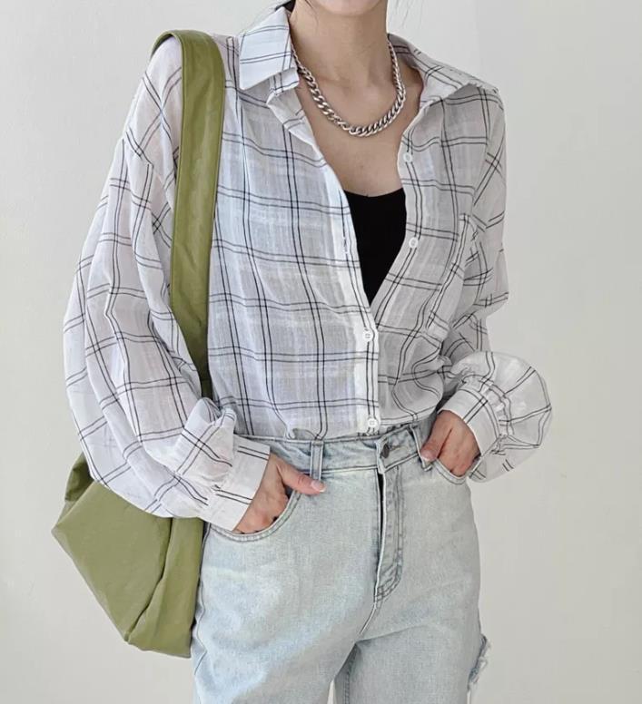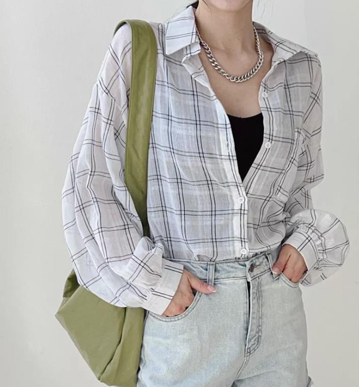 Camisa a cuadros estilo coreano de primavera y otoño, holgada, de manga larga, moda nicho, bloqueador solar, top para mujer