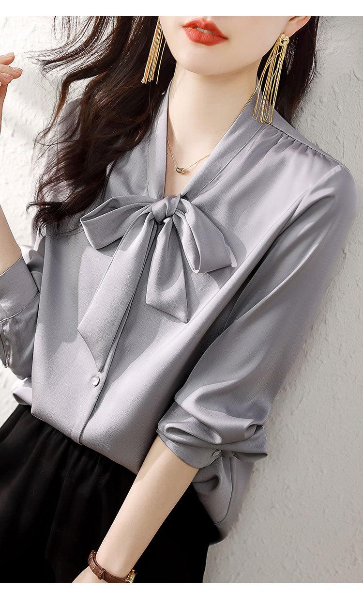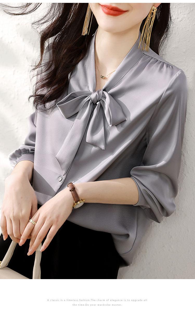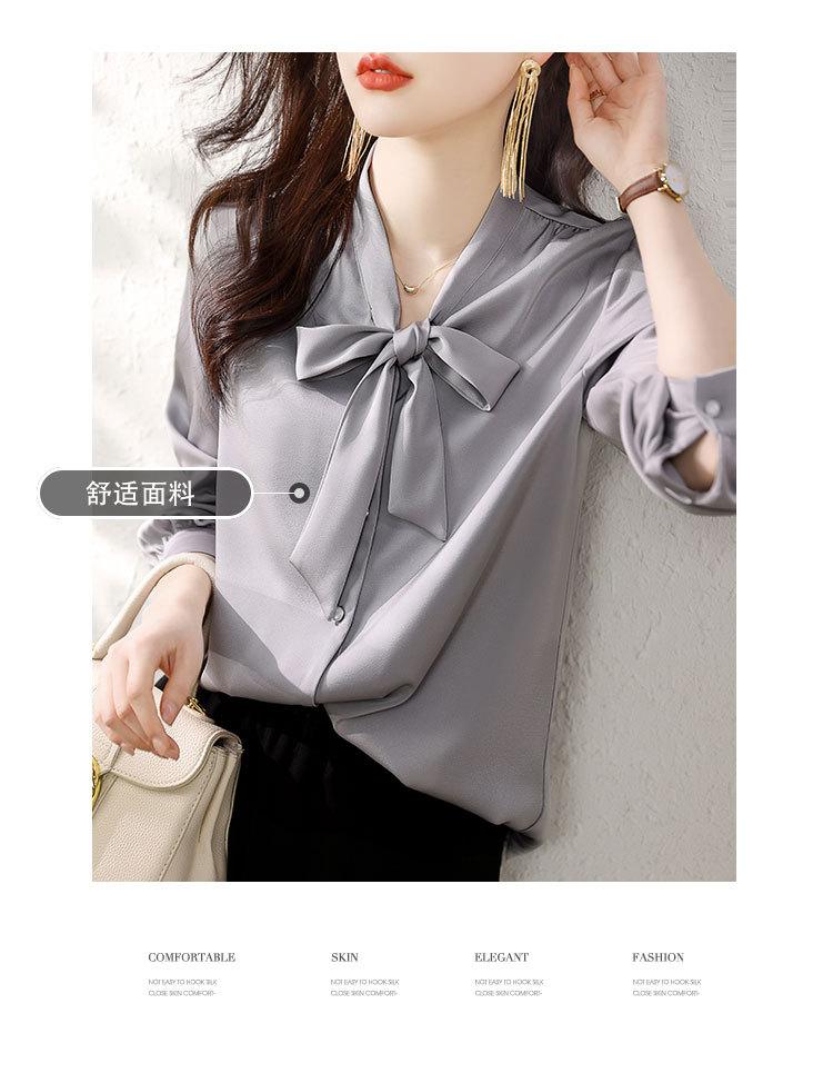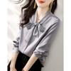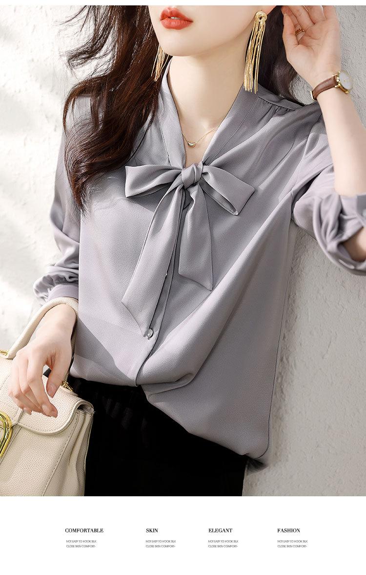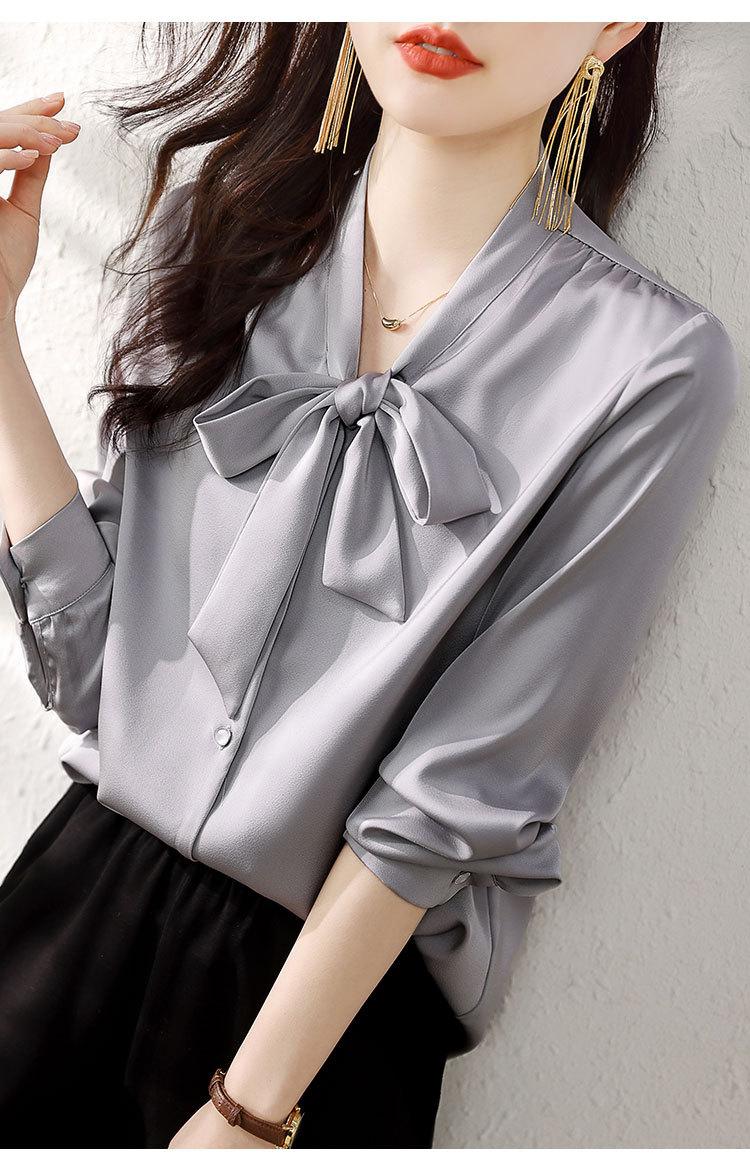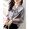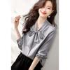 Camisa de mujer nueva de satén con cuello en V de alta gama, nueva base decorativa con lazo de otoño 2024