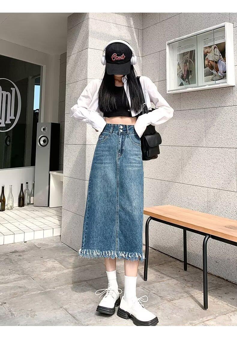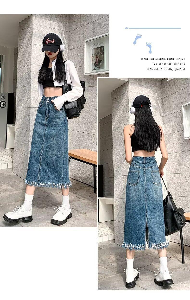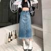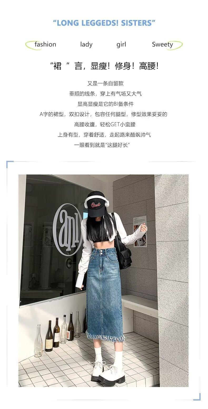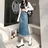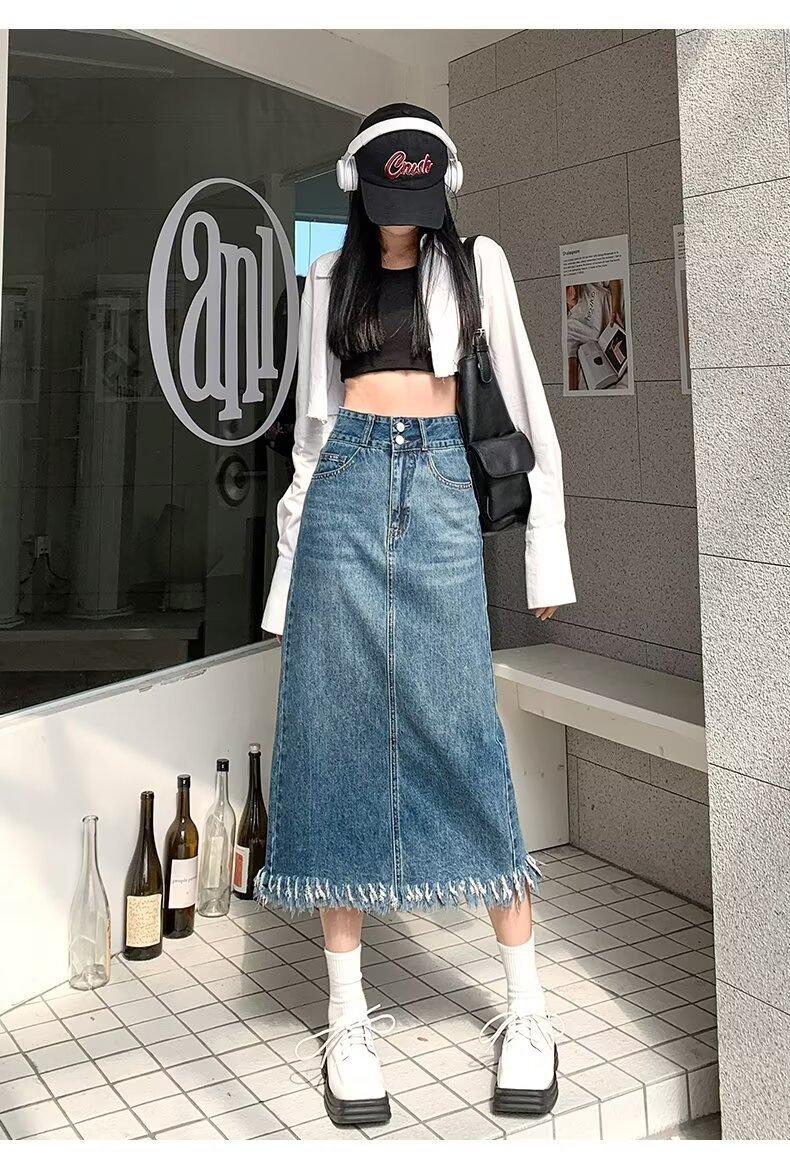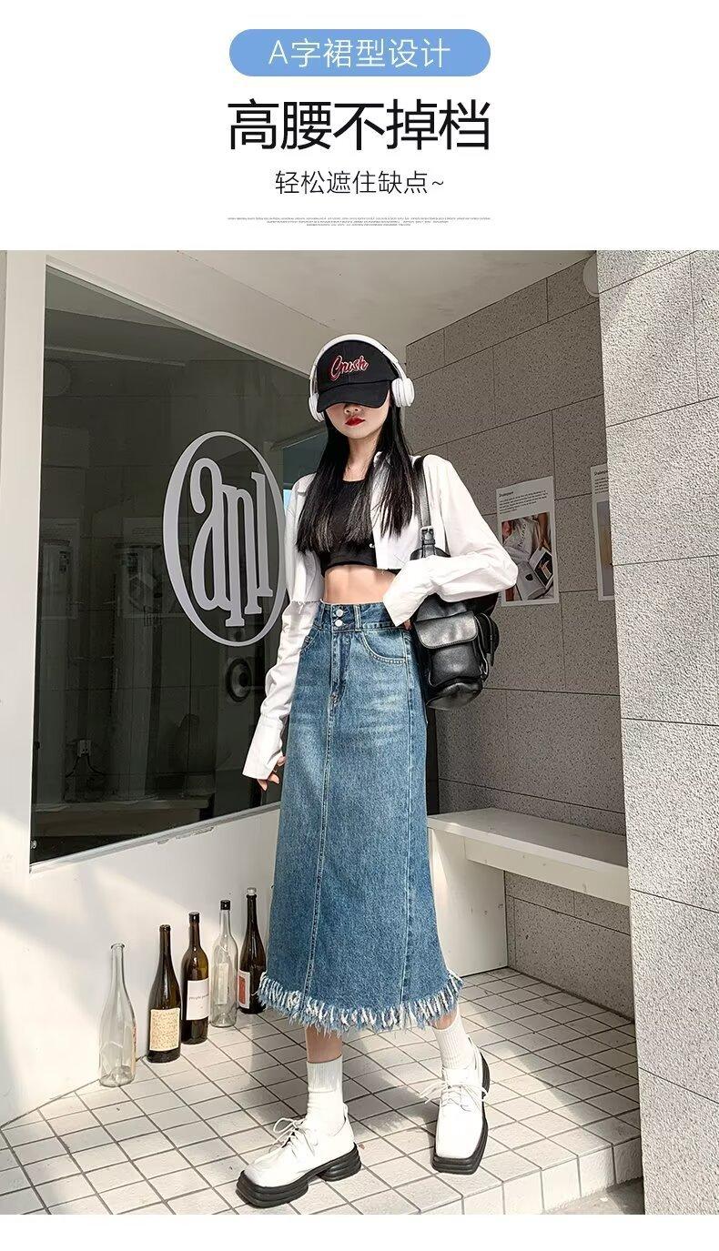 Falda de Mezclilla con Abertura Media para Mujer Otoño Nuevo Estilo Coreano Cubre Caderas Look Adelgazante Cintura Alta Retro Flecos Falda A