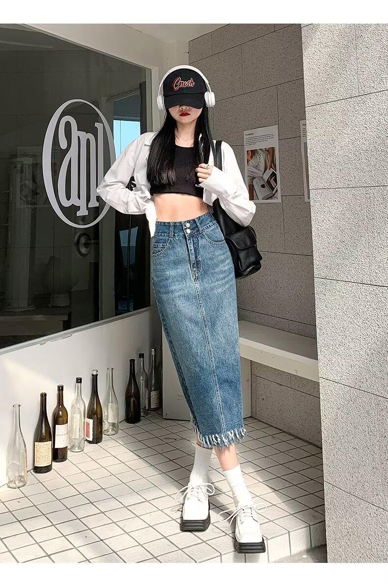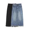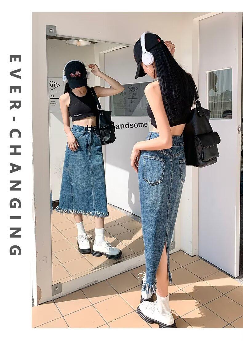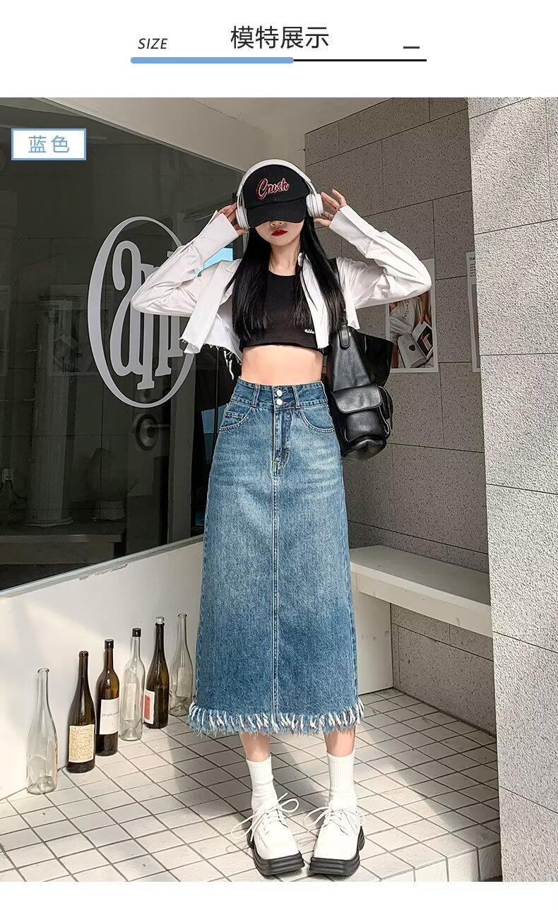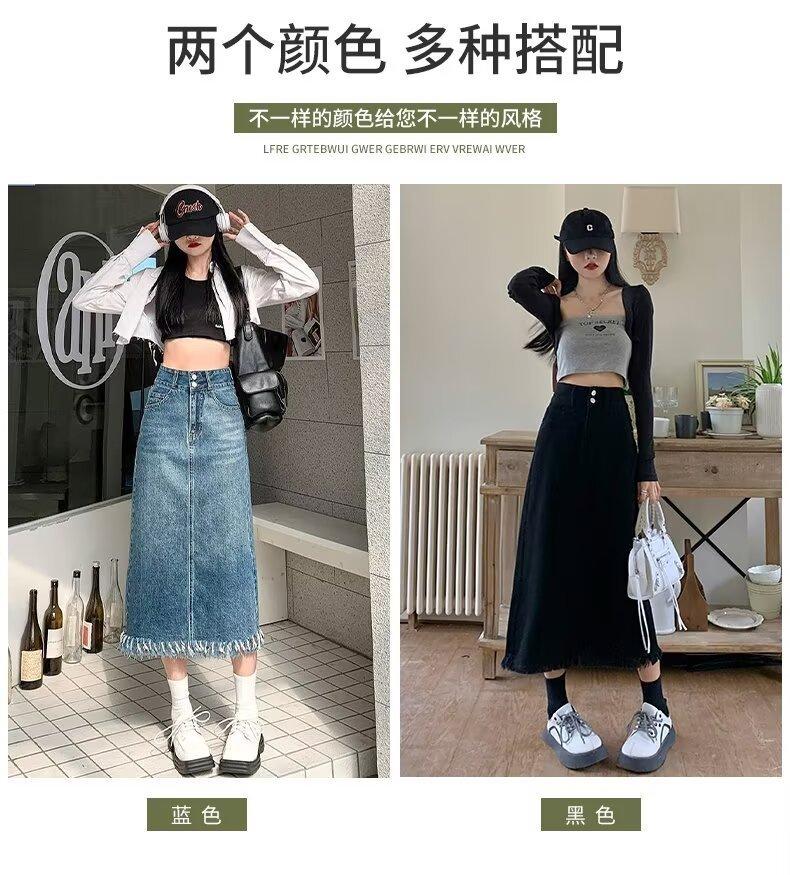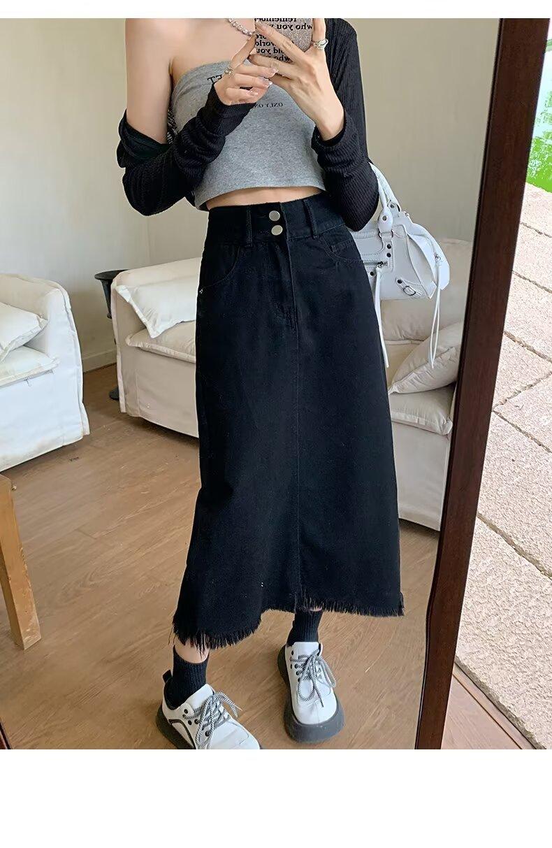 Falda de Mezclilla con Abertura Media para Mujer Otoño Nuevo Estilo Coreano Cubre Caderas Look Adelgazante Cintura Alta Retro Flecos Falda A