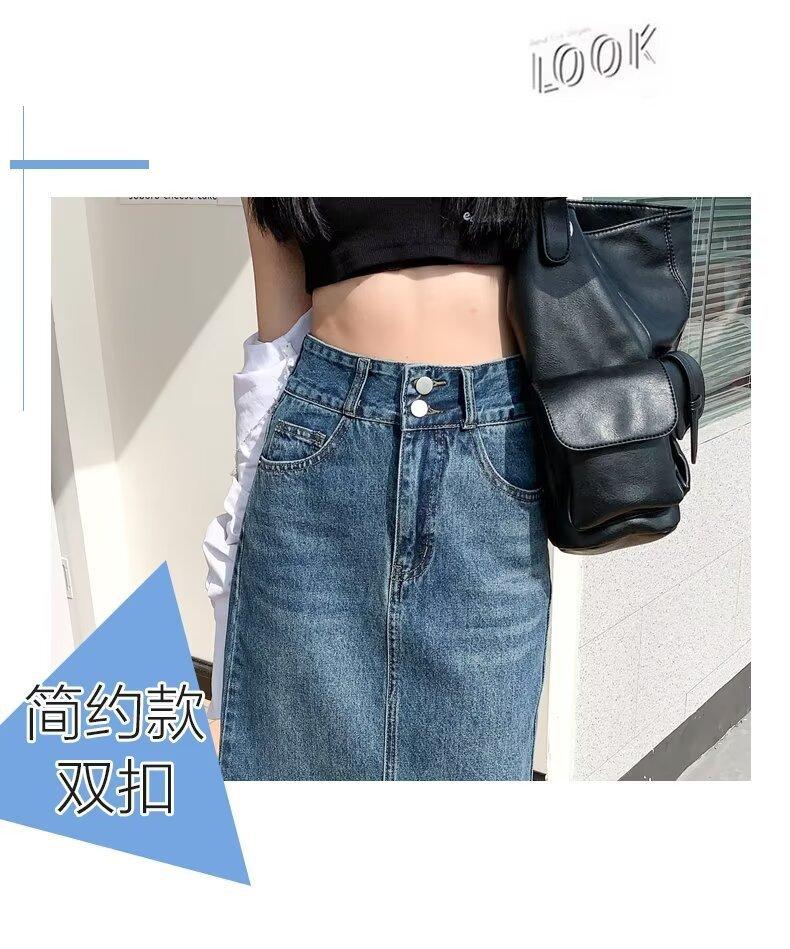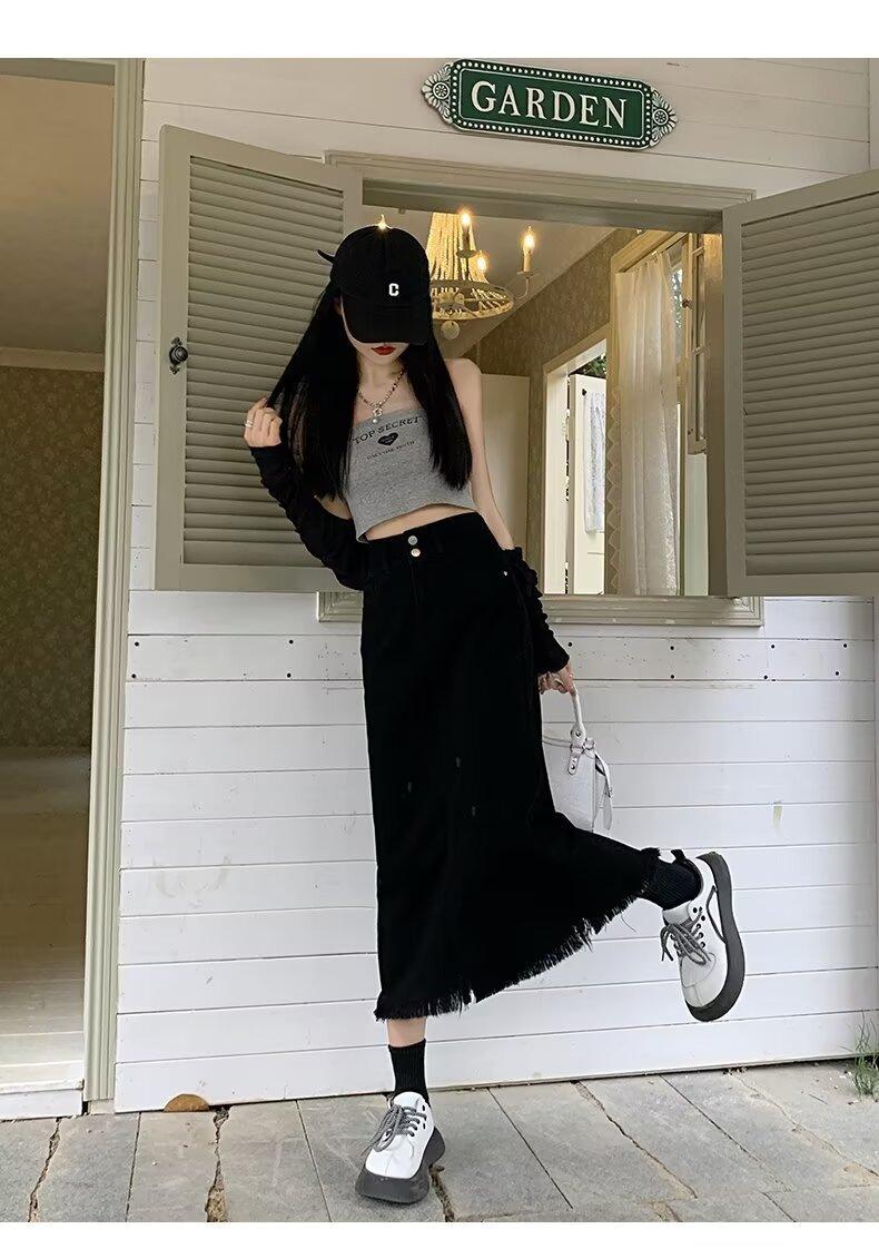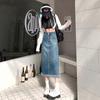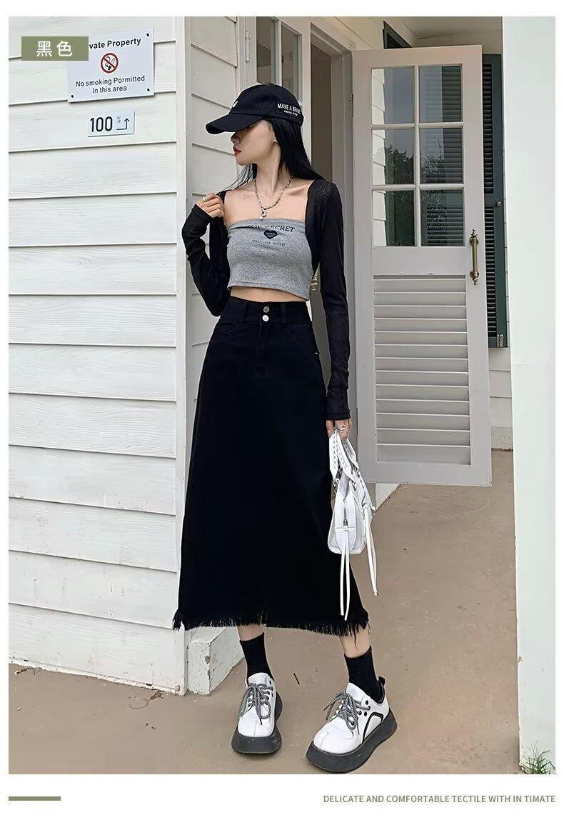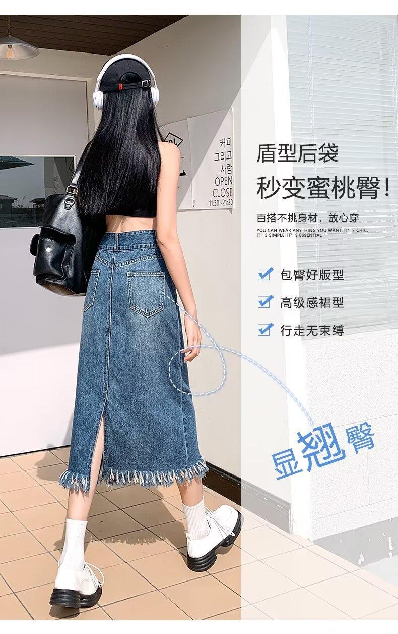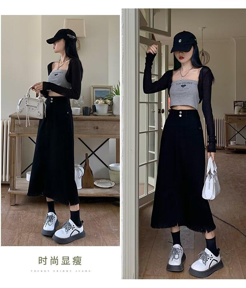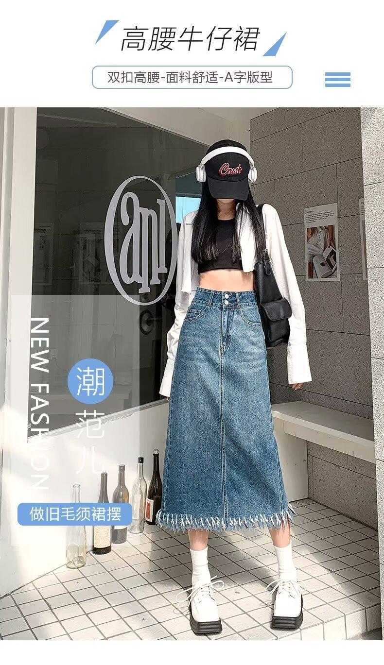Falda de Mezclilla con Abertura Media para Mujer Otoño Nuevo Estilo Coreano Cubre Caderas Look Adelgazante Cintura Alta Retro Flecos Falda A