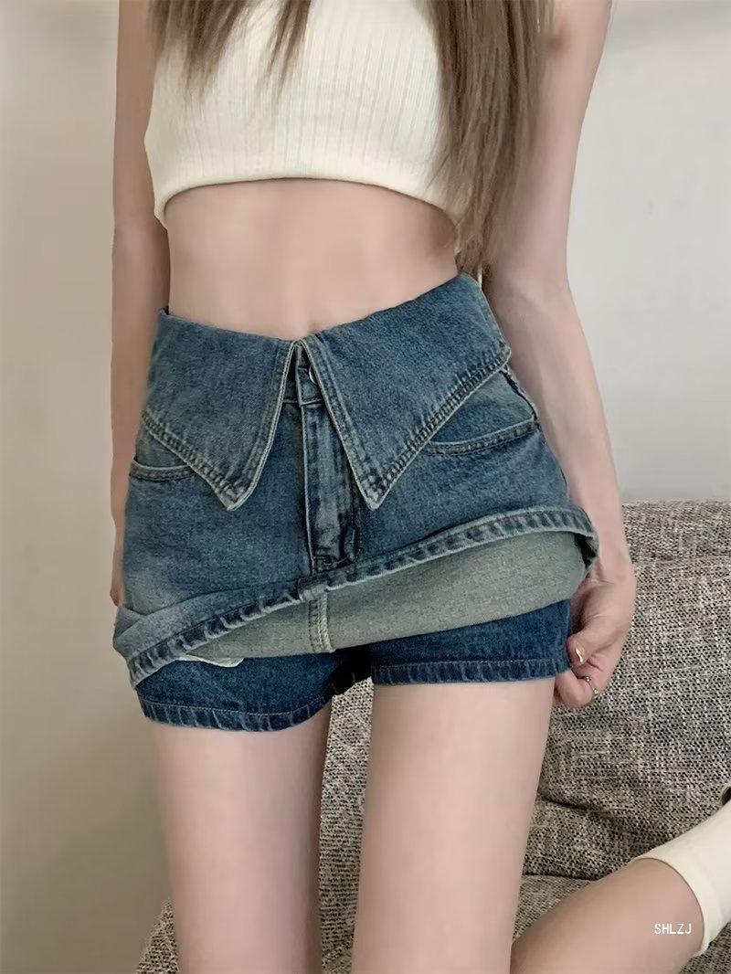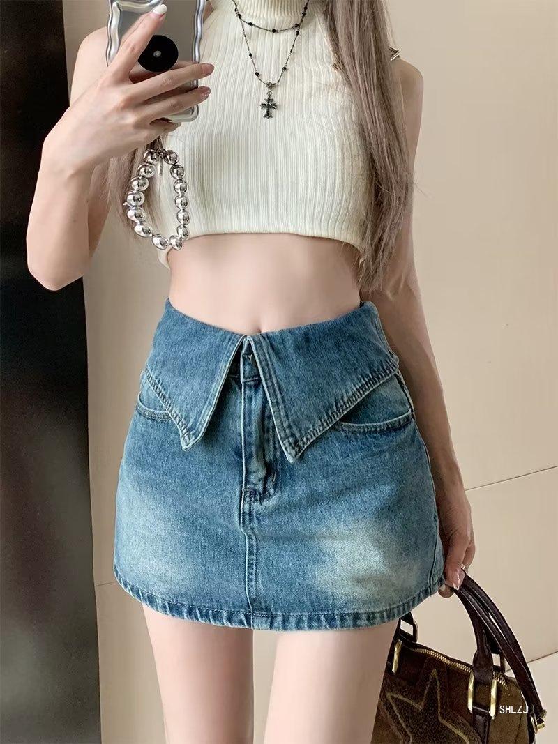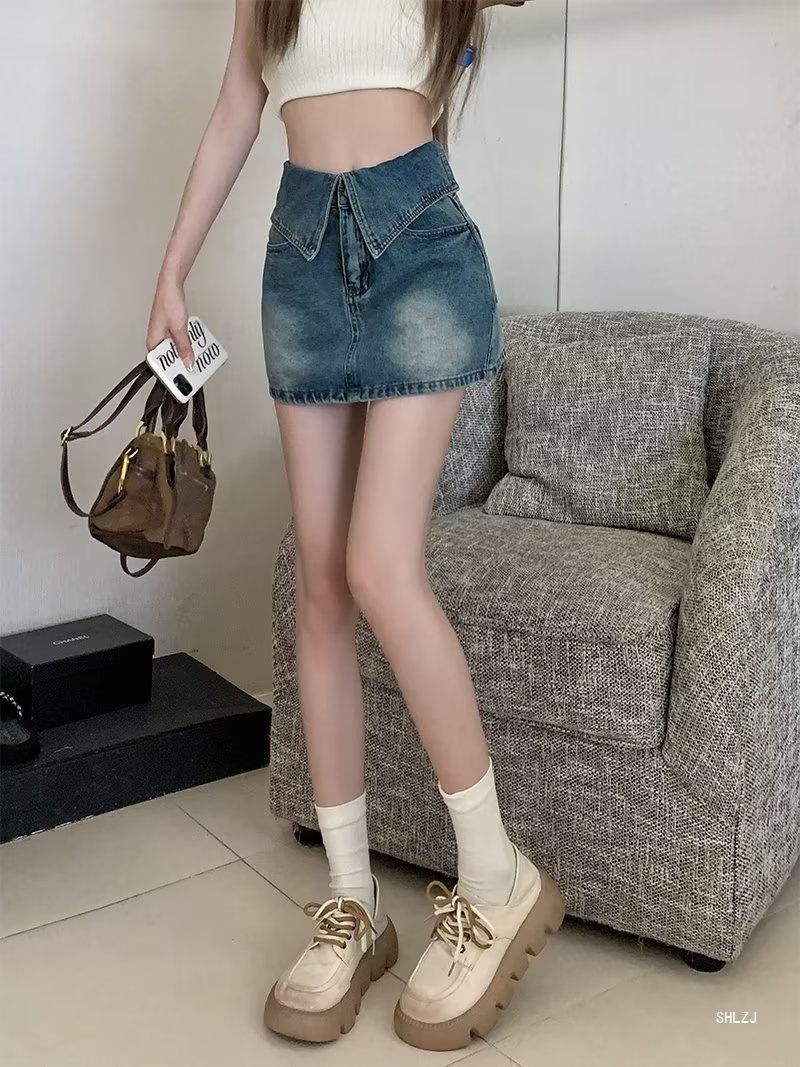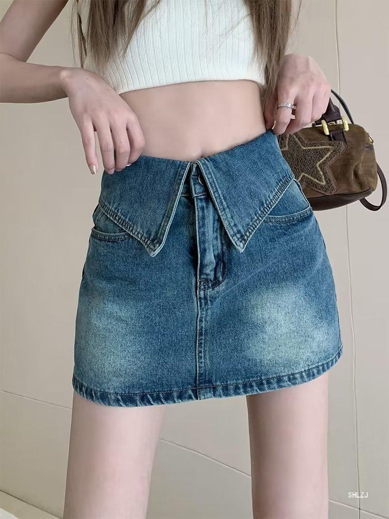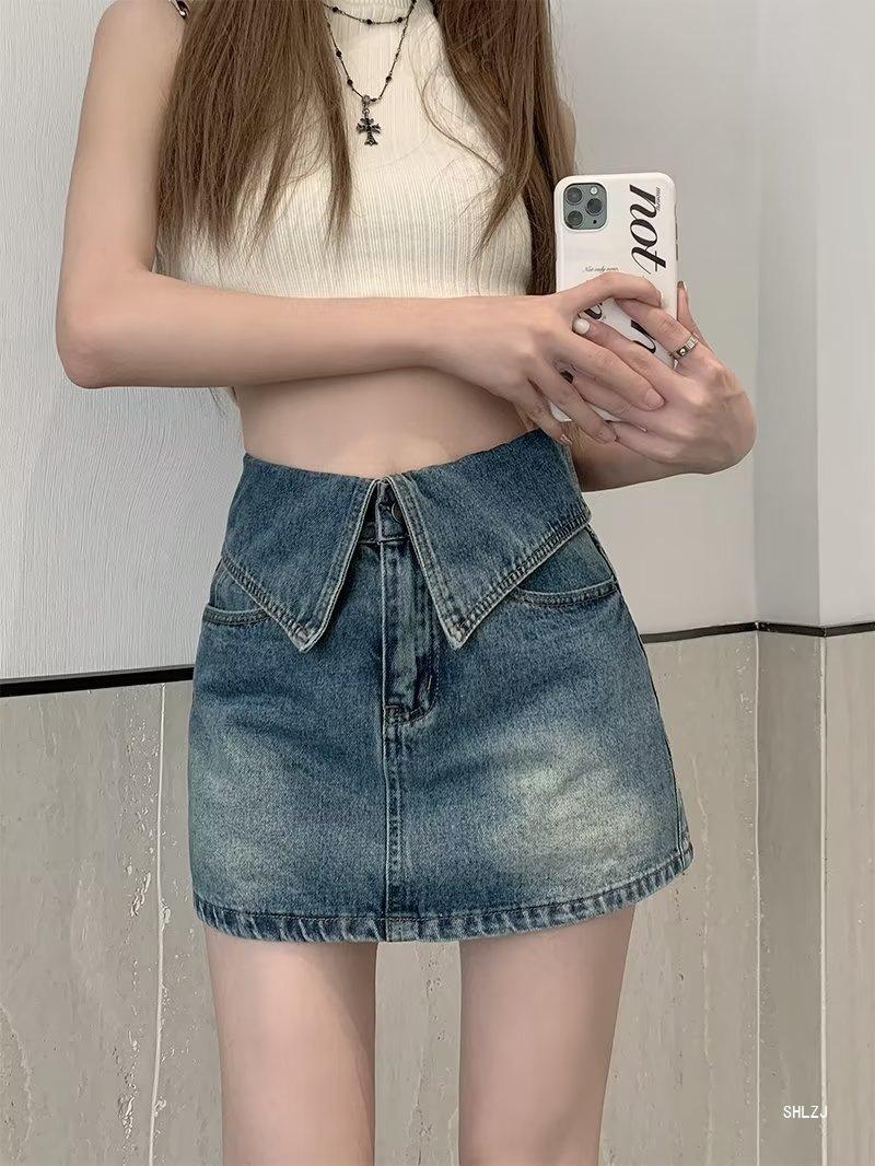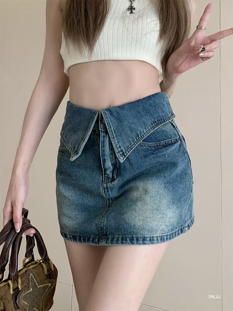 Falda corta de verano a la moda para mujer, de cintura alta, estilo retro, adelgazante, antideslumbrante, de mezclilla, de media longitud a la cadera.