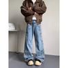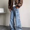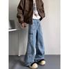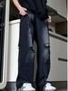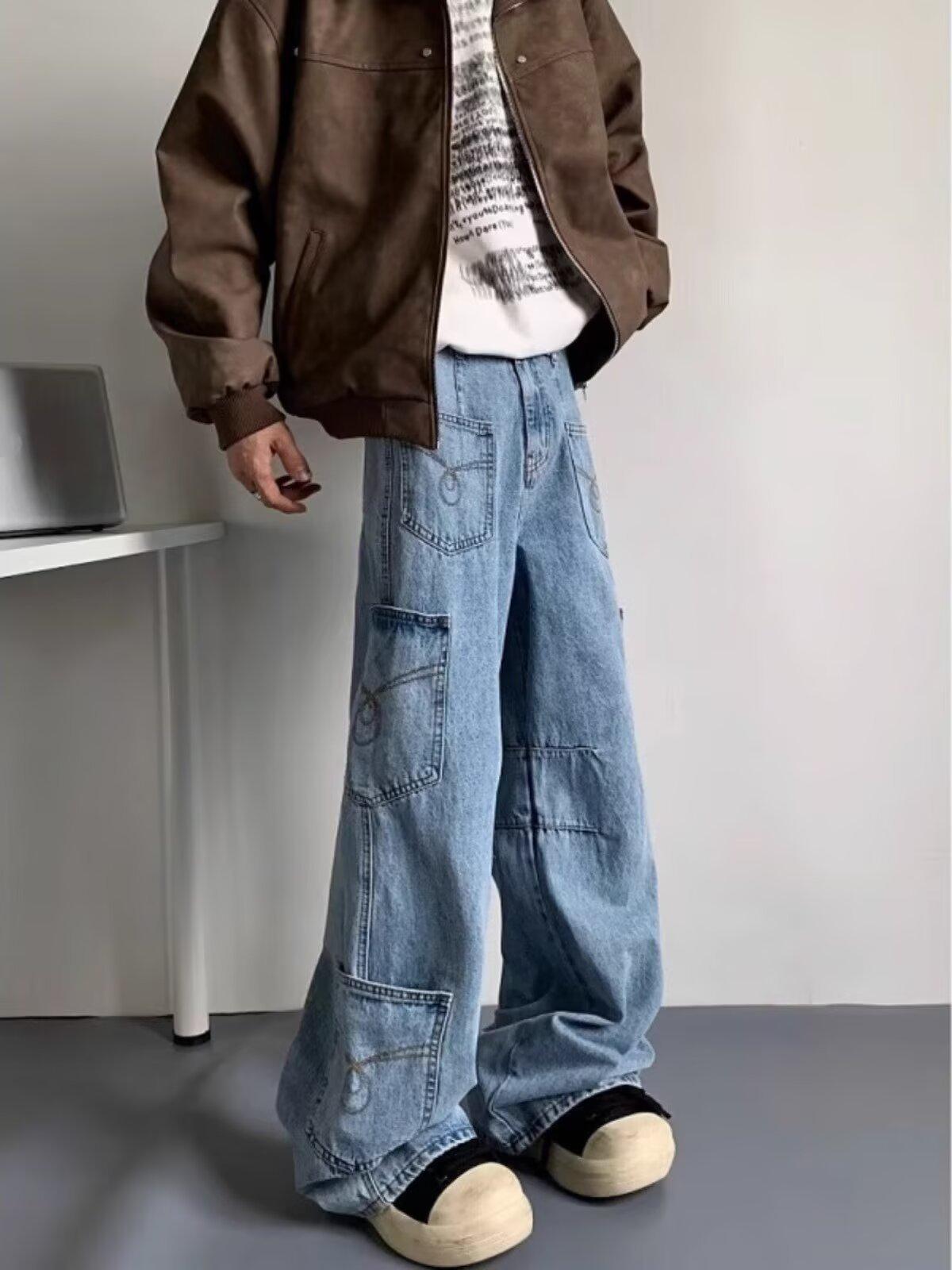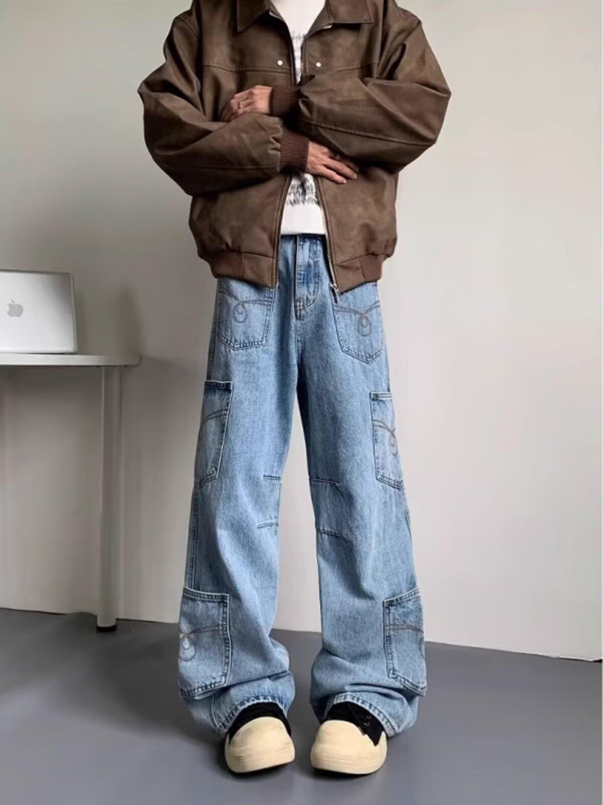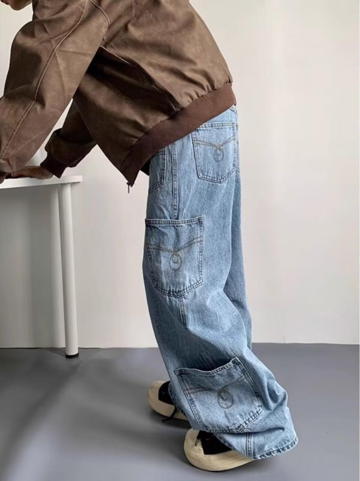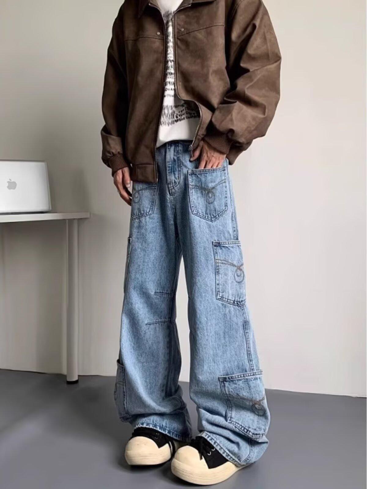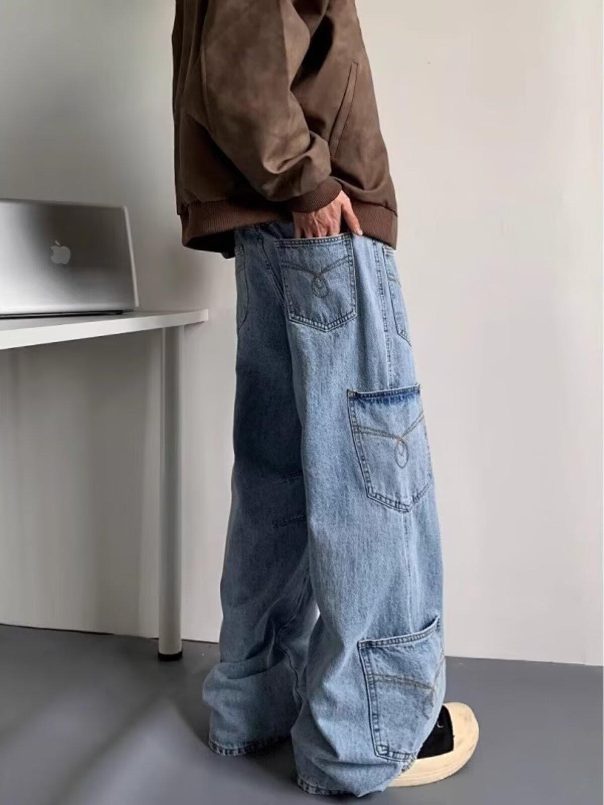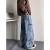 Jeans Americanos Retro Lavados con Diseño Multibolsillos para Hombre y Mujer Ins Marca de Moda High Street Pantalones Rectos Holgados de Pierna Ancha