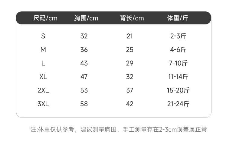 XS-Chest 25 Back Length 18 [Suggested 0.50 kg-1.25 kg]], S-Chest 32 Back Length 23 [Suggested 1.50 kg-2.50 kg]...