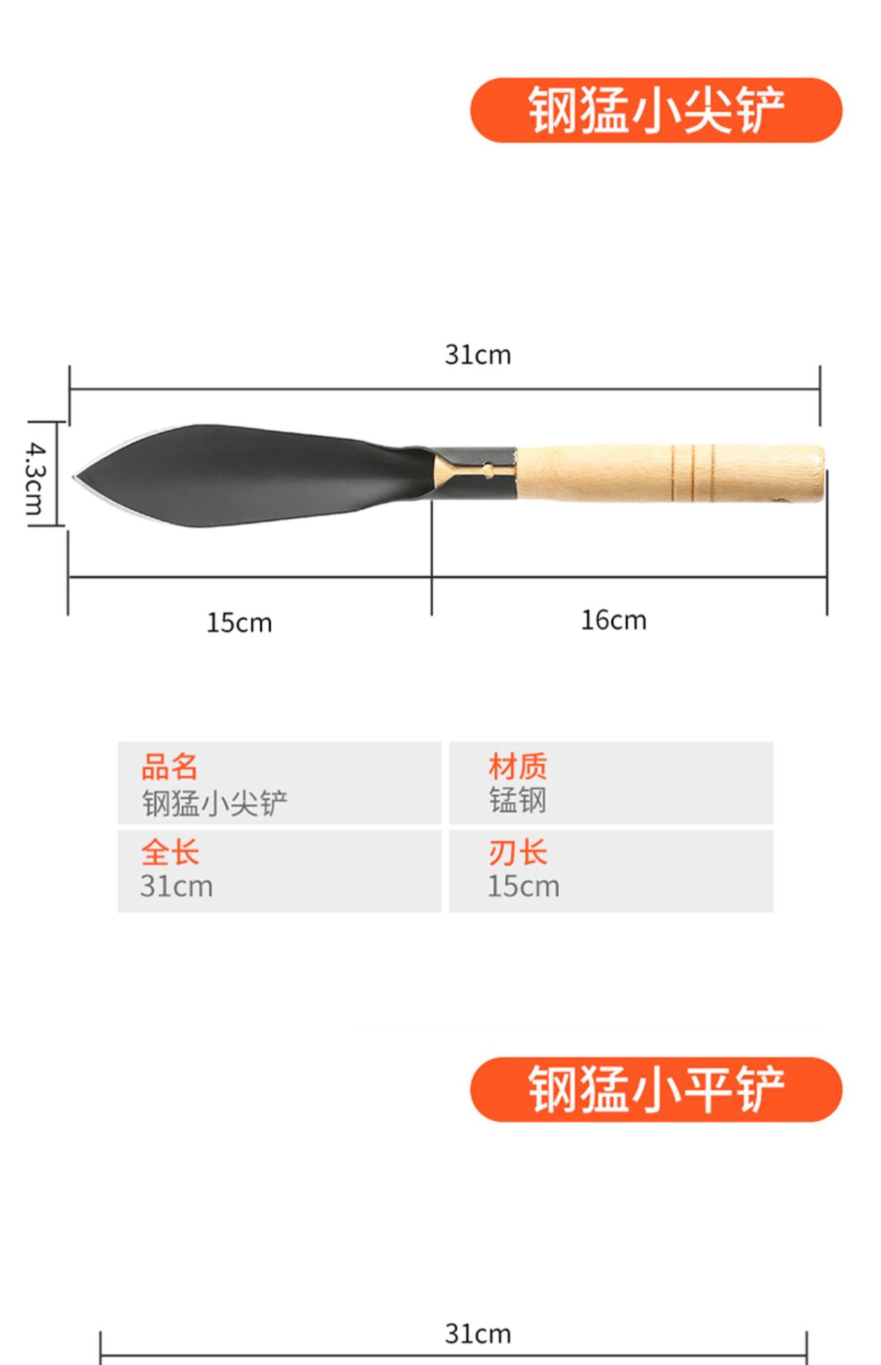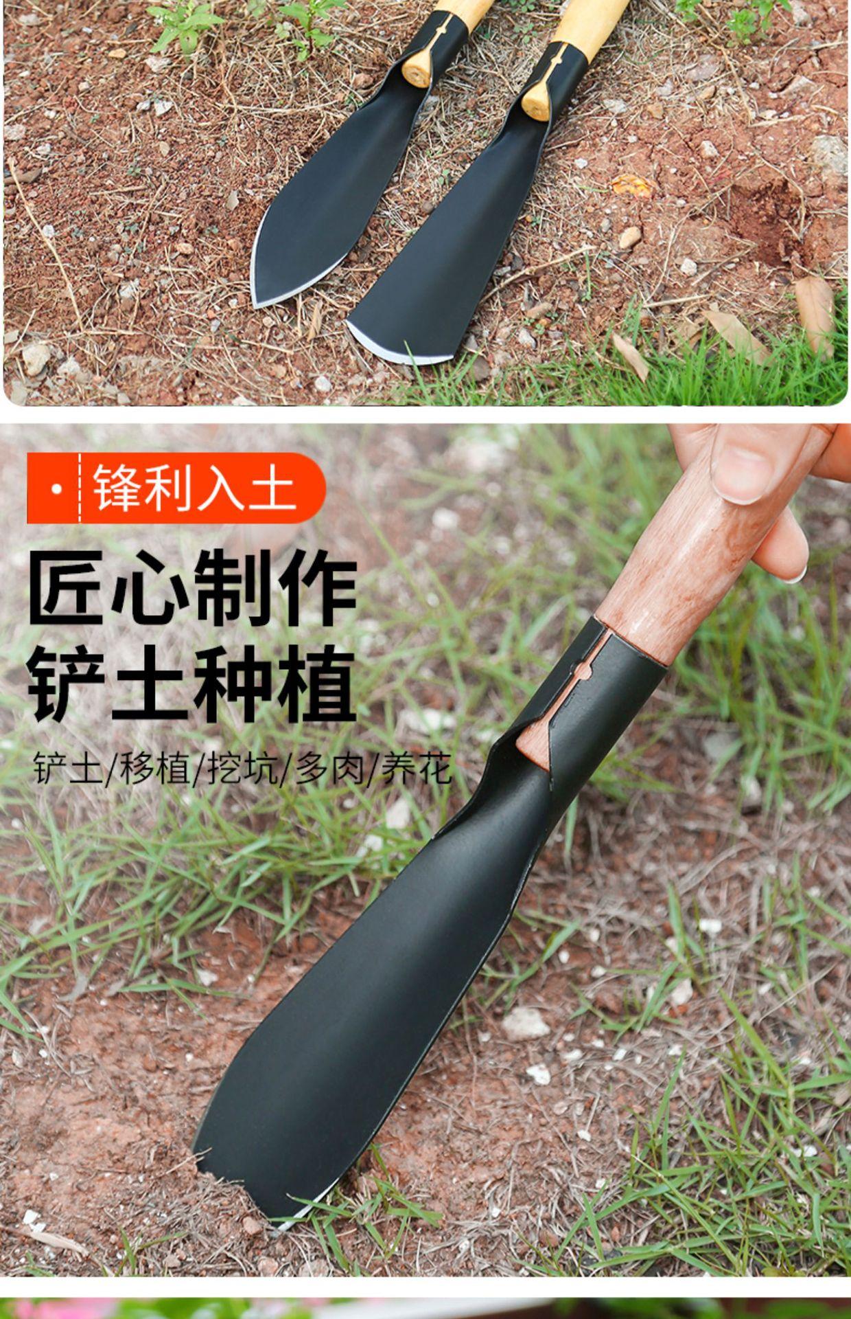 Small pointed shovel with wooden handle and manganese steel [1 piece], Small flat shovel with wooden handle an...