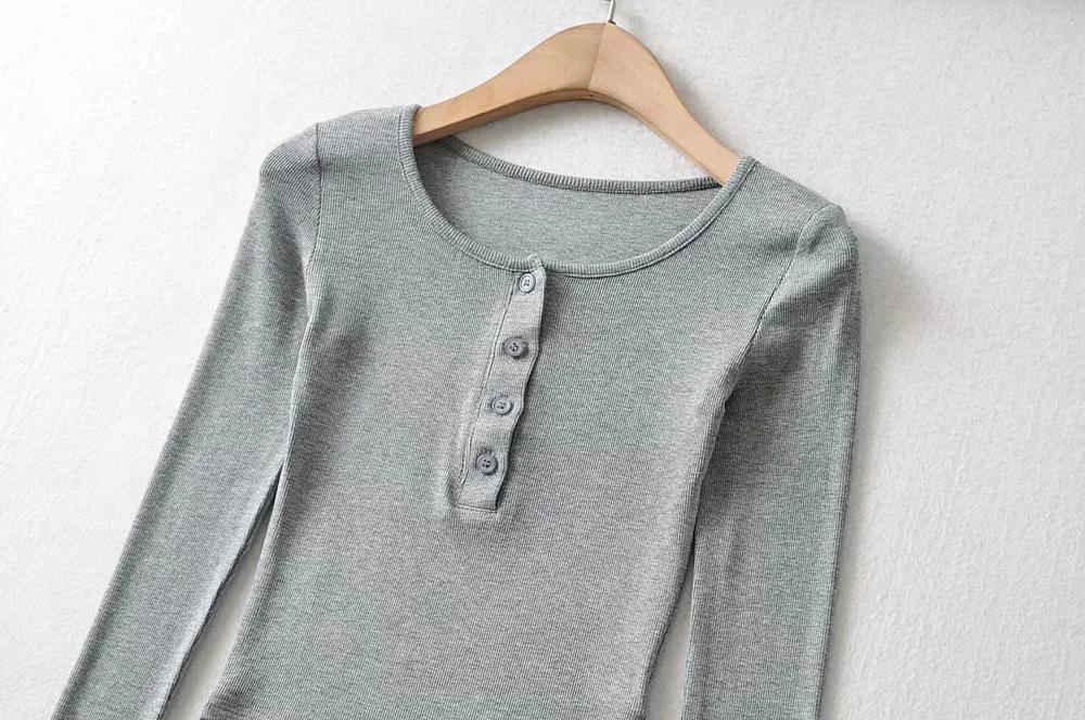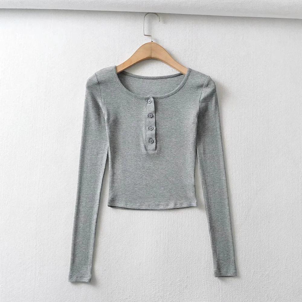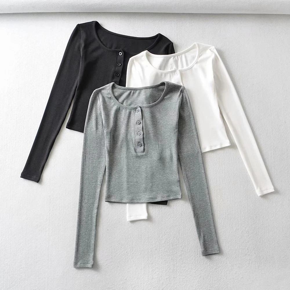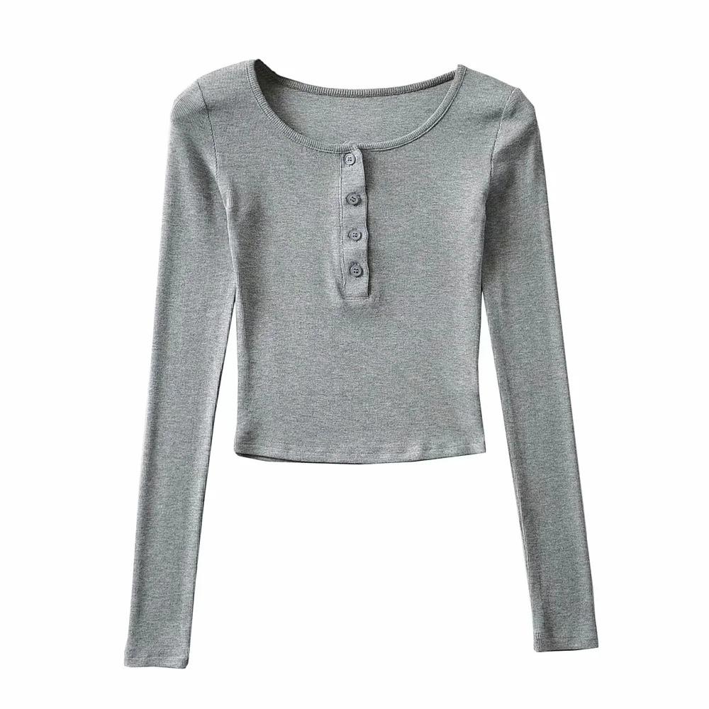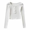 Camiseta de manga larga con cuello redondo y botones para mujer, estilo europeo y americano, ajustada, corta, con hebilla, sexy.