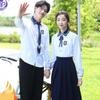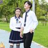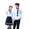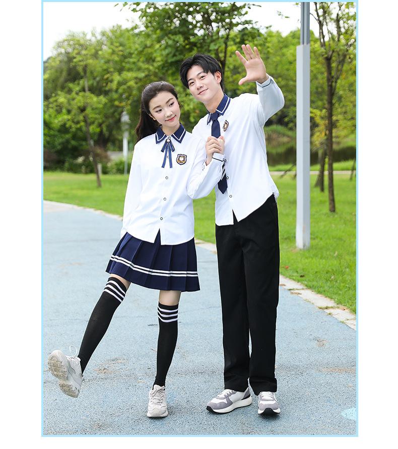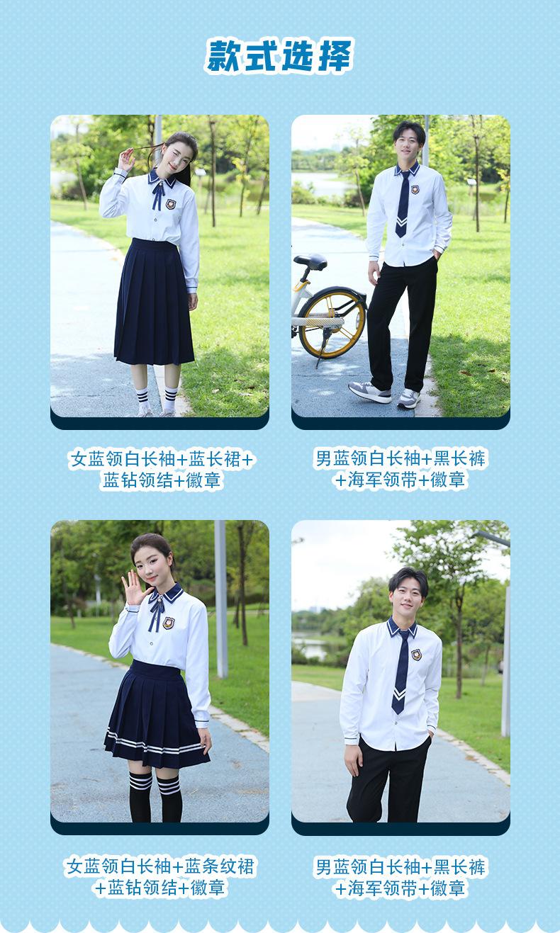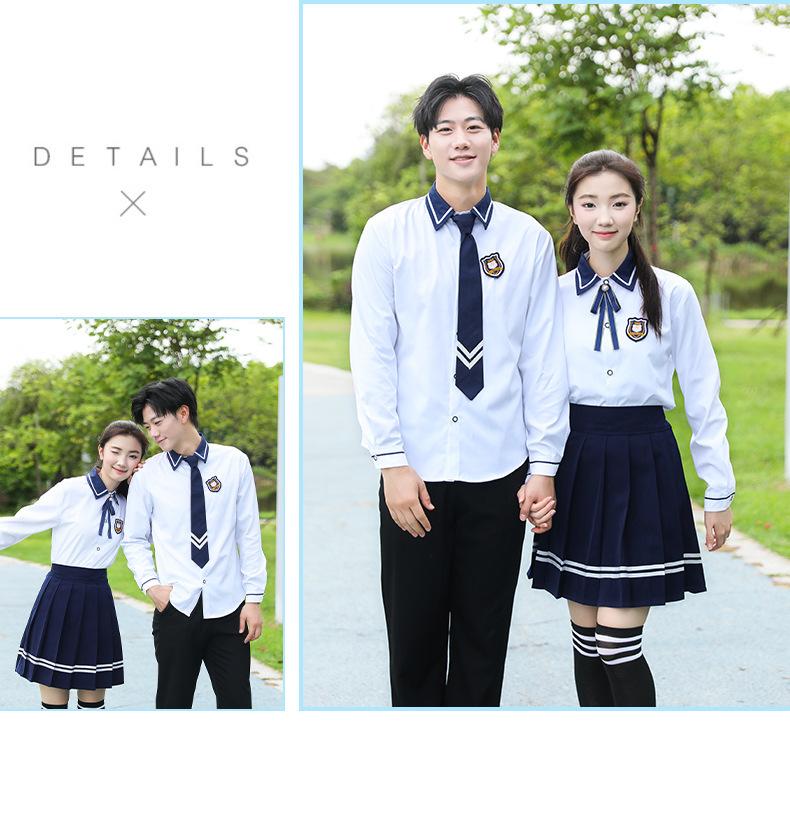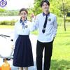 Women's blue collar white long sleeves + blue long skirt + blue diamond bow tie + badge, Men's blue collar whi...