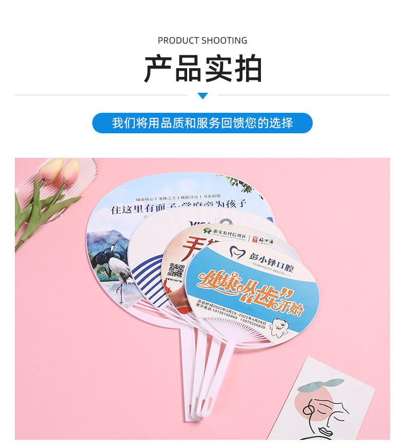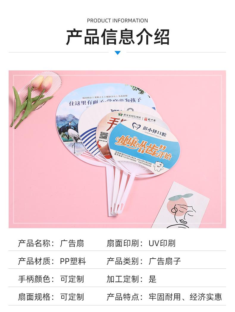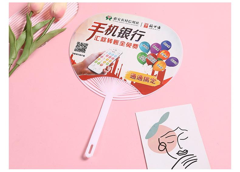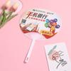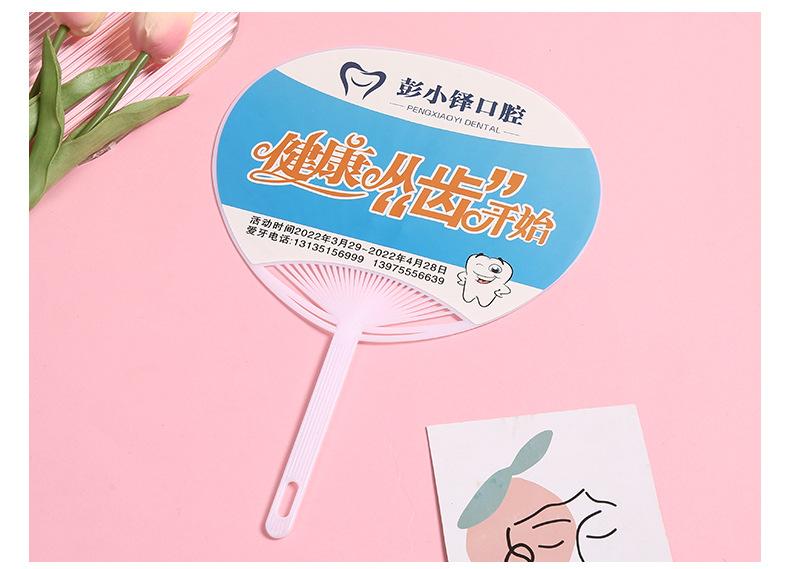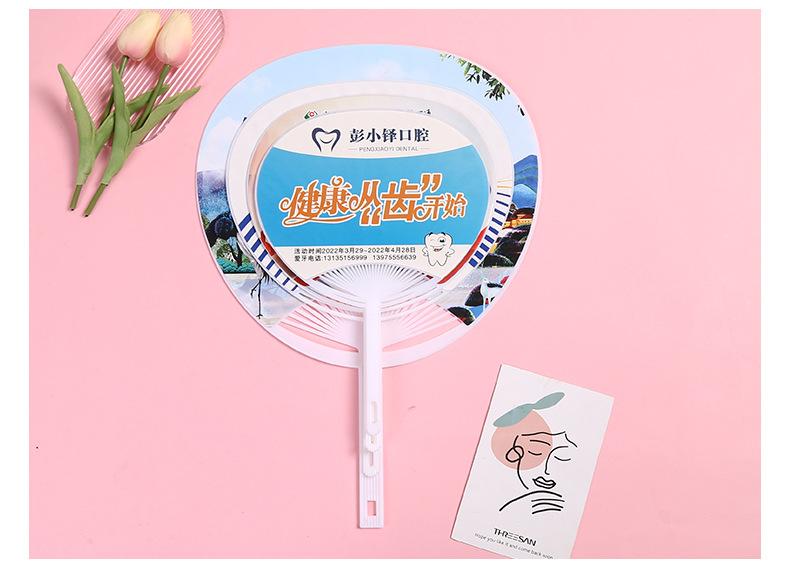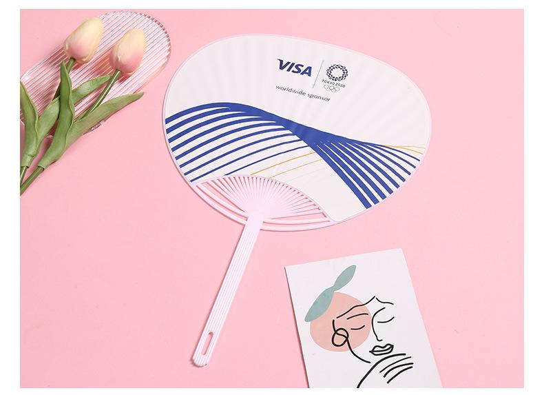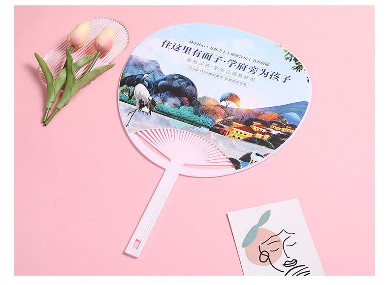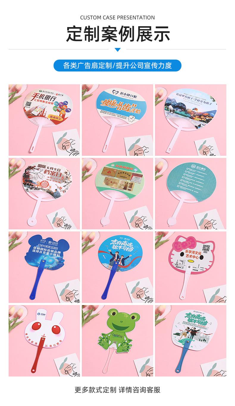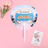 Abanico publicitario al por mayor, abanico de pegamento PP, abanico de inscripción de dibujos animados, abanico con mango de plástico, abanico publicitario