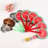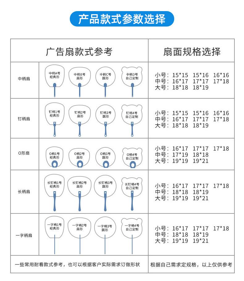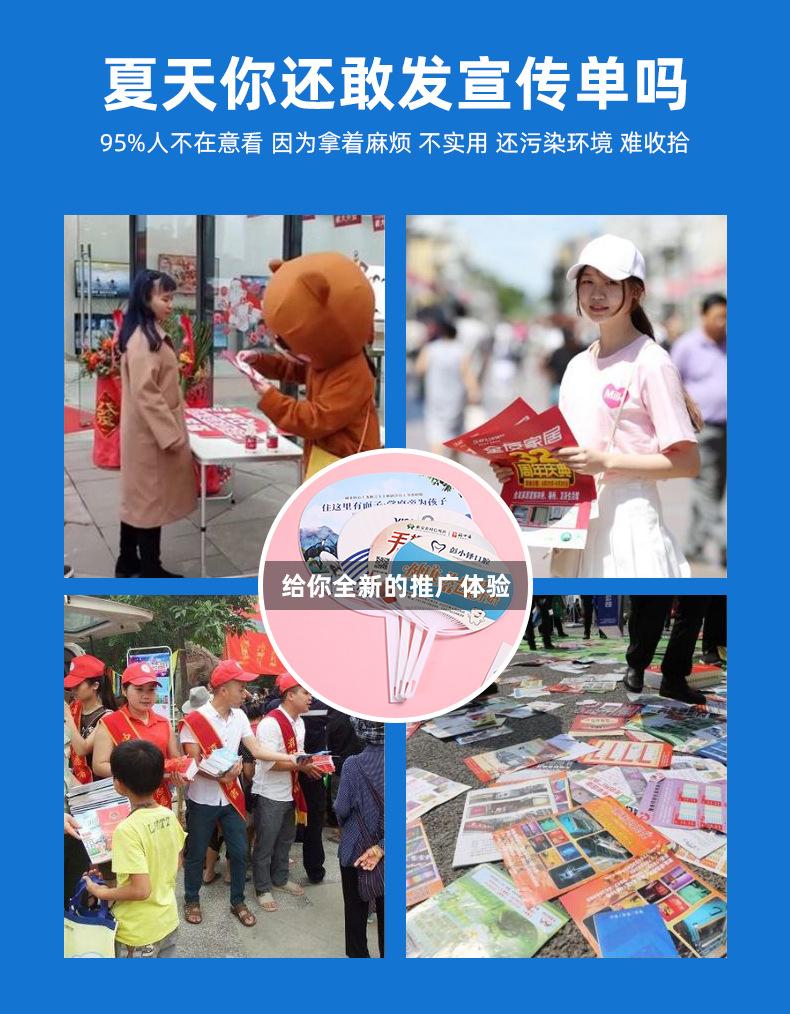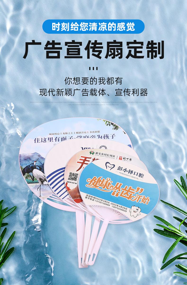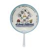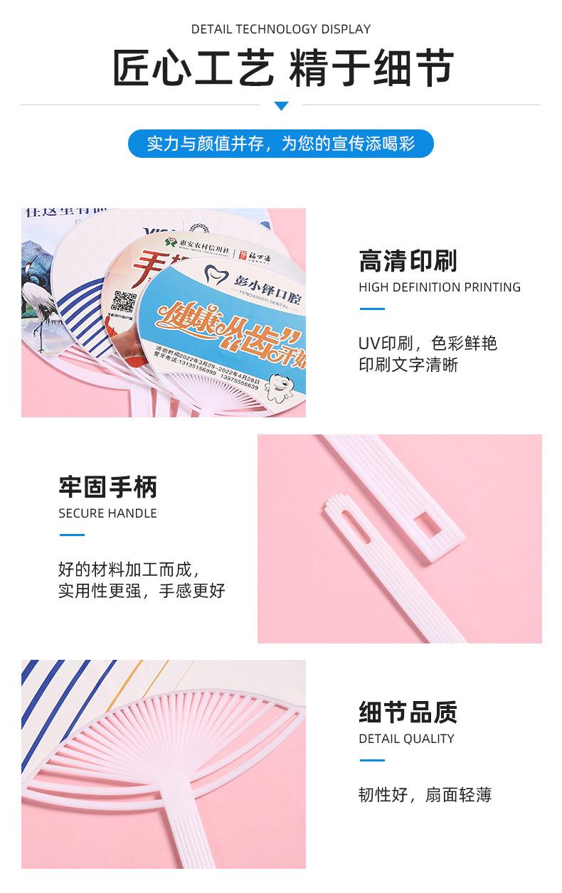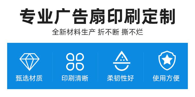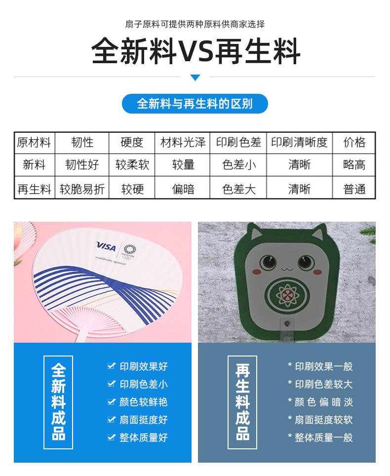 Abanico publicitario al por mayor, abanico de pegamento PP, abanico de inscripción de dibujos animados, abanico con mango de plástico, abanico publicitario
