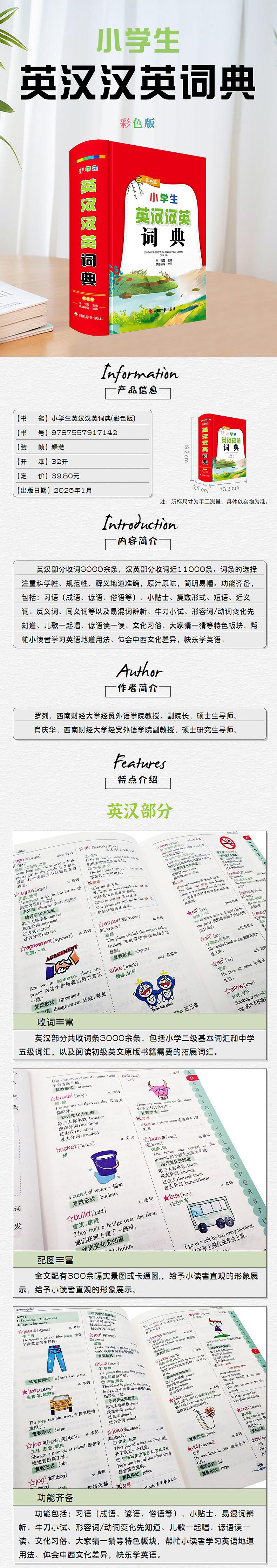 Sección inglés-chino: 1. Rico en vocabulario, con más de 3000 entradas, incluyendo el vocabulario básico de segundo grado de primaria y quinto grado de secundaria, así como el vocabulario ampliado necesario para leer los libros originales de inglés de primaria. 2. Rico en ilustraciones, con más de 300 imágenes de la vida real o caricaturas en el texto completo. 3. Funciones completas y novedosas, incluyendo: modismos (modismos, proverbios, refranes, etc.), consejos, formas plurales, frases, sinónimos, antónimos, sinónimos, etc., así como secciones especiales como análisis de palabras fáciles de confundir, una pequeña prueba, cambios de adjetivo/verbo primero, cantar canciones infantiles juntos, leer proverbios, costumbres culturales y adivinar, etc., para ayudar a los lectores jóvenes a aprender el uso auténtico del inglés, experimentar las diferencias entre las culturas china y occidental y aprender inglés felizmente. Sección chino-inglés: 1. Amplio vocabulario. La sección chino-inglés de este diccionario contiene casi 11 000 palabras. Además de vocabulario general y una gran cantidad de palabras nuevas, también incluye dialectos, modismos, proverbios y palabras comunes en ciencias naturales. El vocabulario chino recopilado abarca una amplia gama de áreas y se usa con frecuencia en la vida cotidiana, el estudio y las actividades sociales, y puede ser utilizado por los lectores tanto en la comunicación oral como en la expresión escrita. 2. La selección de entradas se centra en la cientificidad y la estandarización, y las explicaciones en inglés son auténticas, precisas, originales, concisas y fáciles de entender. Apéndice: El apéndice es rico y variado. Ayuda a los jóvenes lectores a ampliar sus conocimientos, etc.