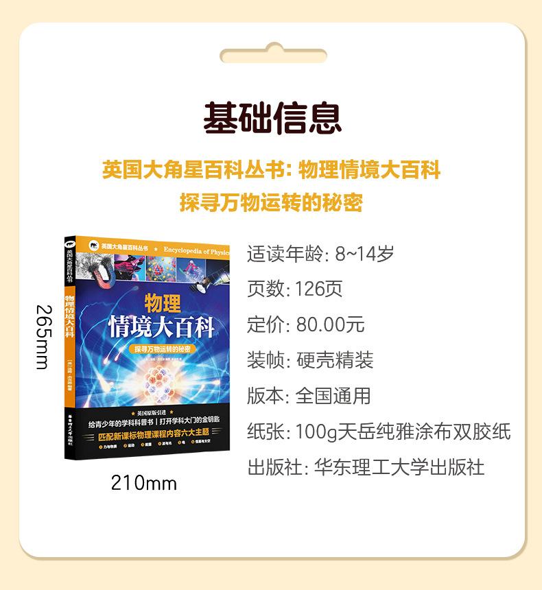 "Enciclopedia de Física en Situaciones" es un libro de divulgación científica sobre física, ideal para adolescentes. Nos lleva a un maravilloso viaje de exploración del mundo físico a través de ilustraciones de gran tamaño y exquisitas, estilo documental, un análisis de fenómenos asombroso y un lenguaje narrativo fácil de entender. El libro abarca seis temas principales: fuerza y materia, movimiento, energía, ondas y luz, electricidad, estrellas y espacio. Desde partículas microscópicas hasta la inmensidad del espacio, todo se nos presentará uno a uno. ¡Sigamos los pasos del autor para explorar los secretos del funcionamiento de todas las cosas y sentir el poder mágico de la física!