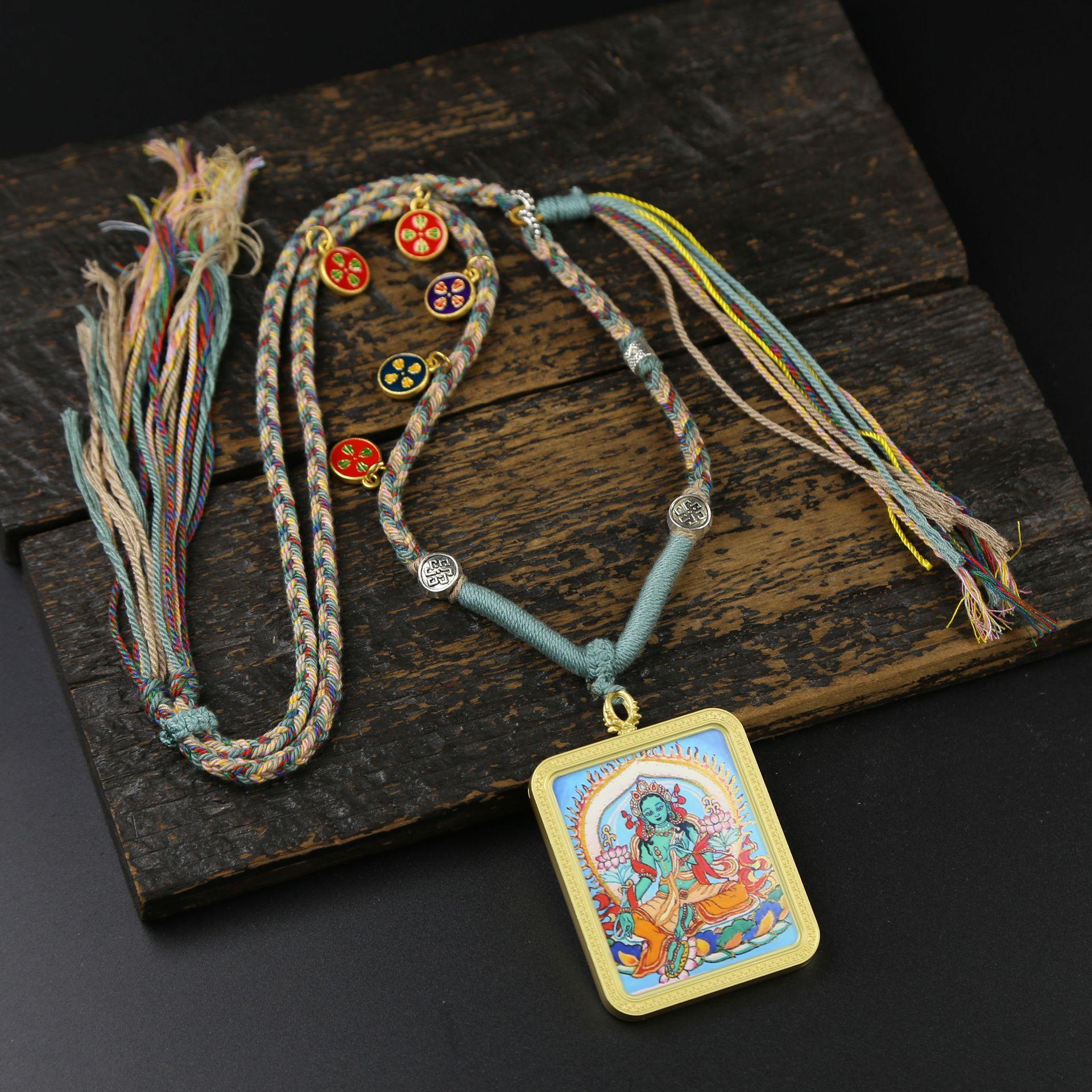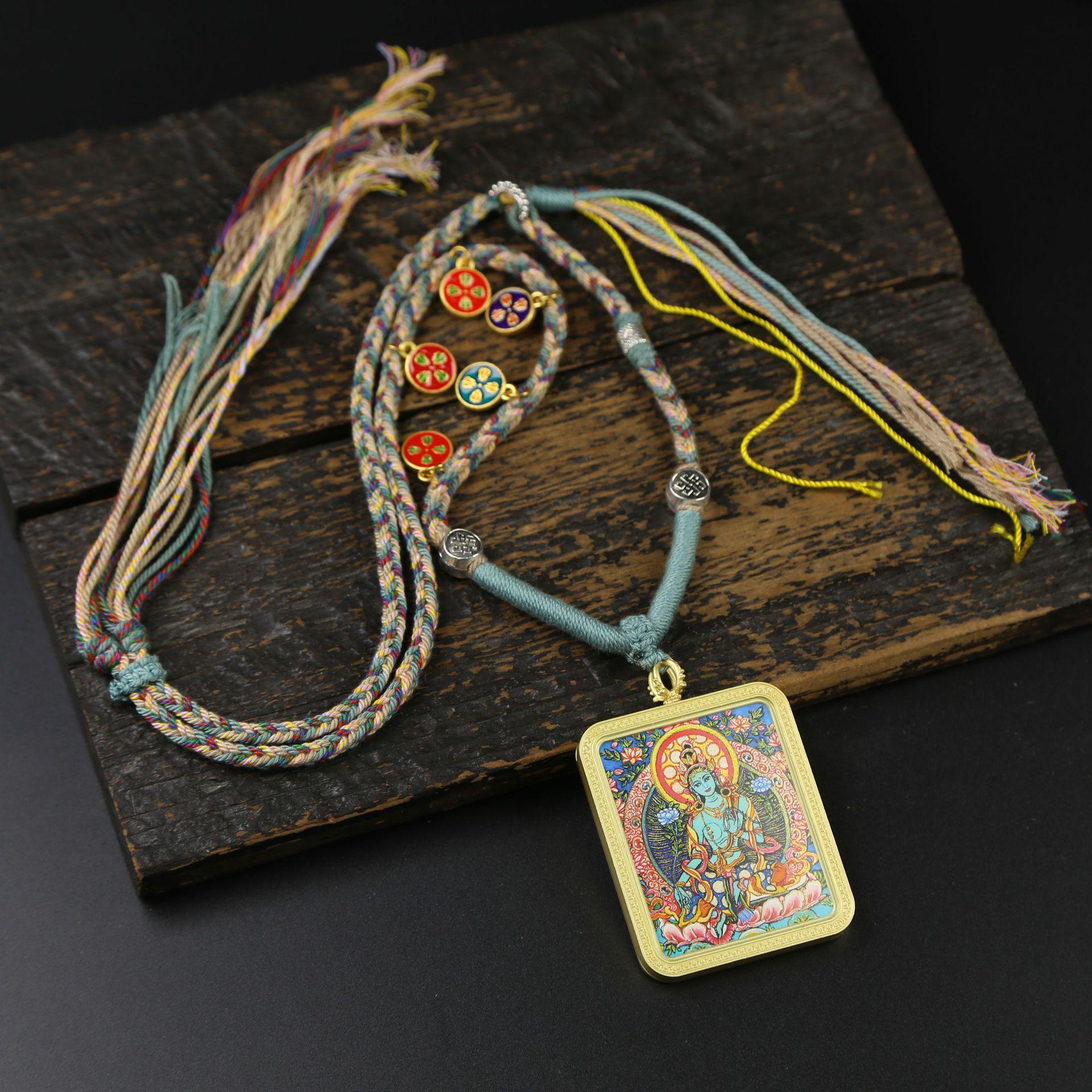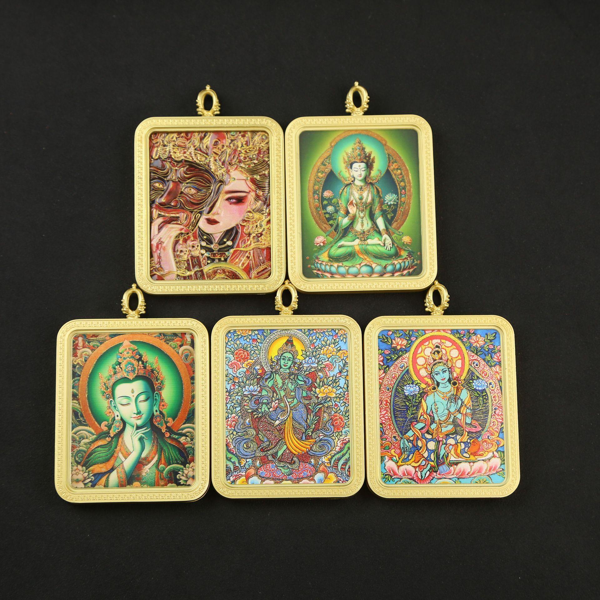 Colgante Thangka Dorado Pintado a Mano Estilo Xizang Tara Verde Tara Blanca Colgante Thangka Portátil Amuleto Budista Xizang Collar Colgante