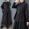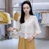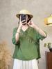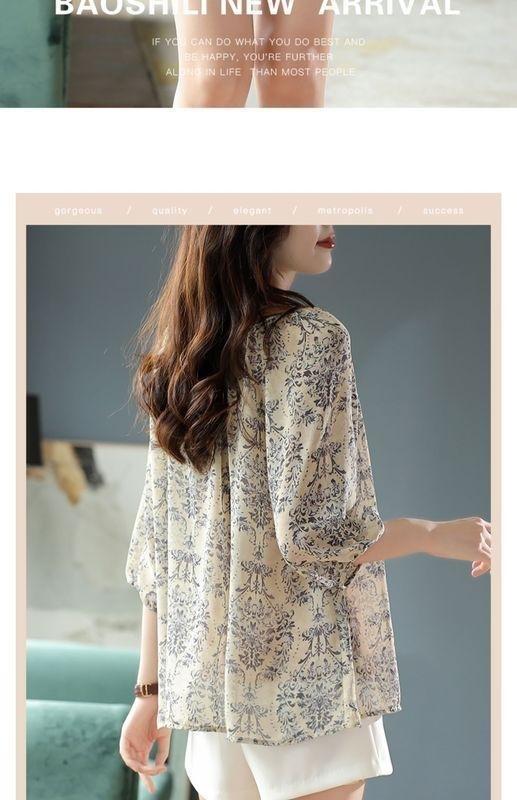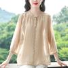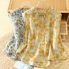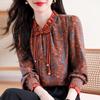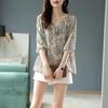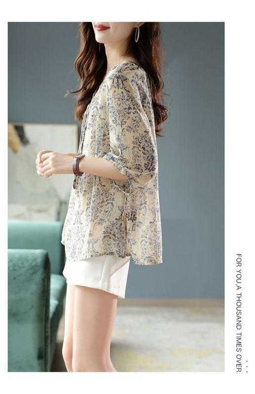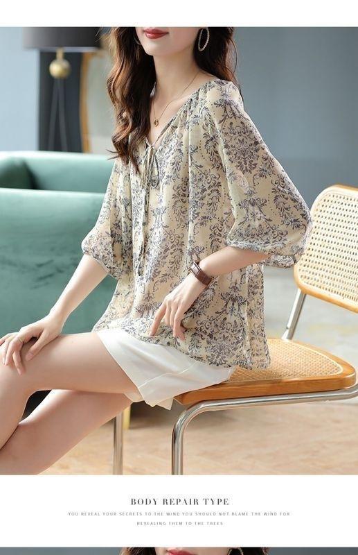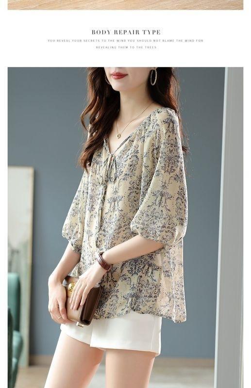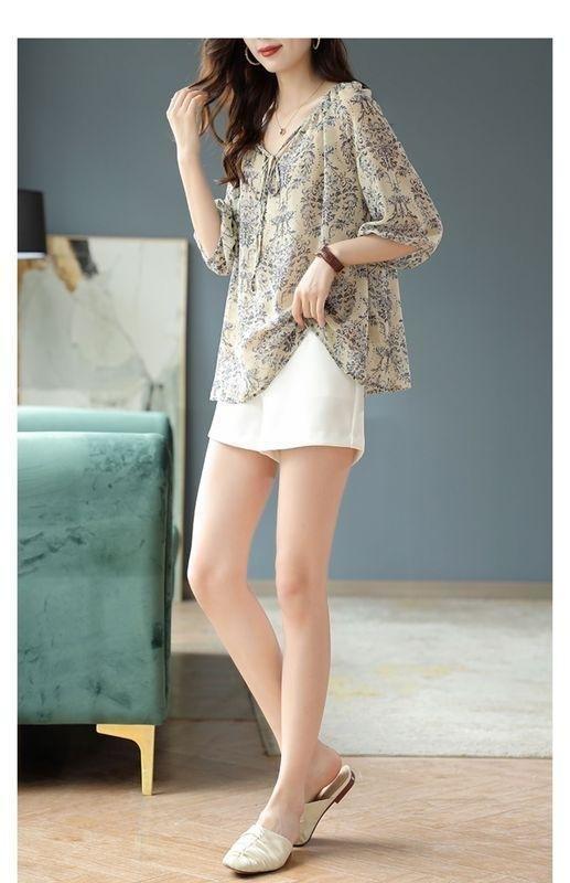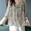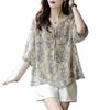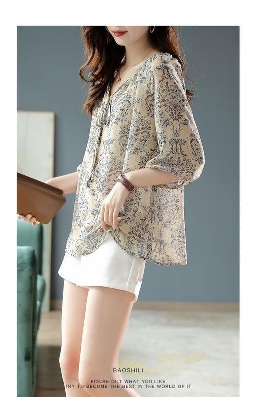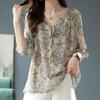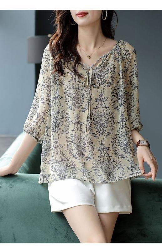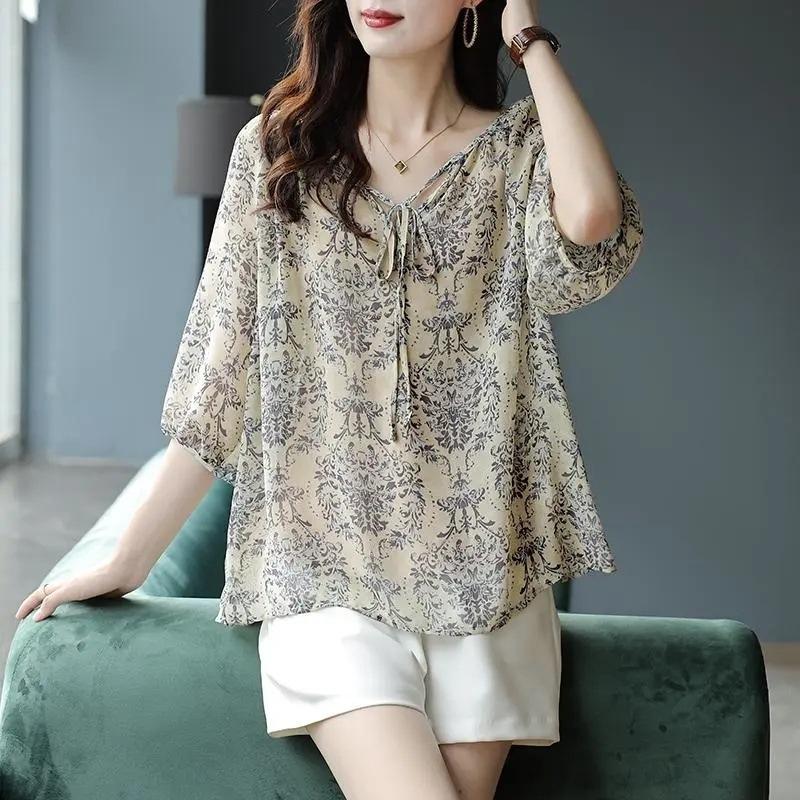 [Estilo versátil de moda] Camisa de gasa estampada vintage con cuello en V y cordones, novedad de verano 2024, manga holgada de siete puntos