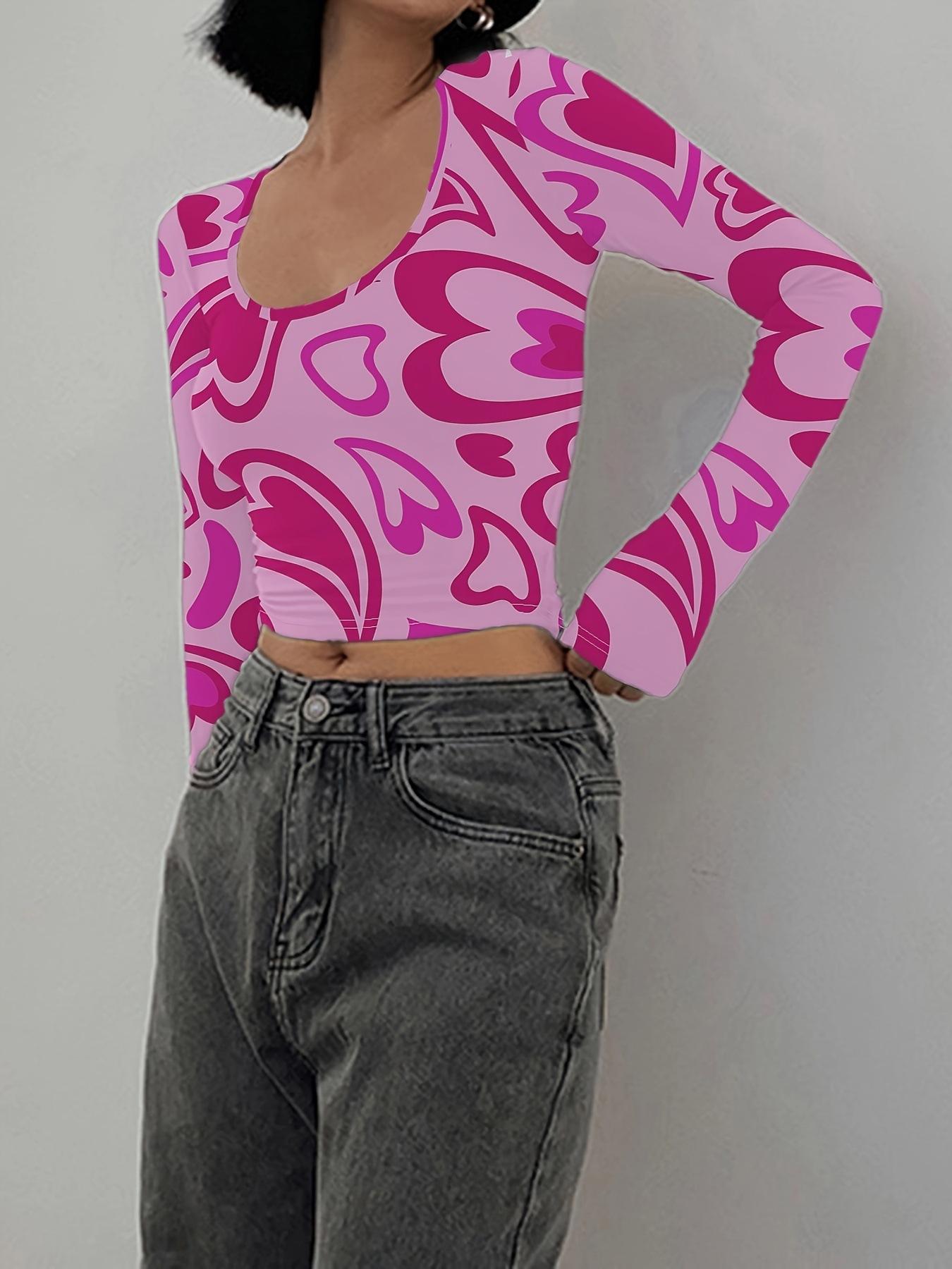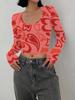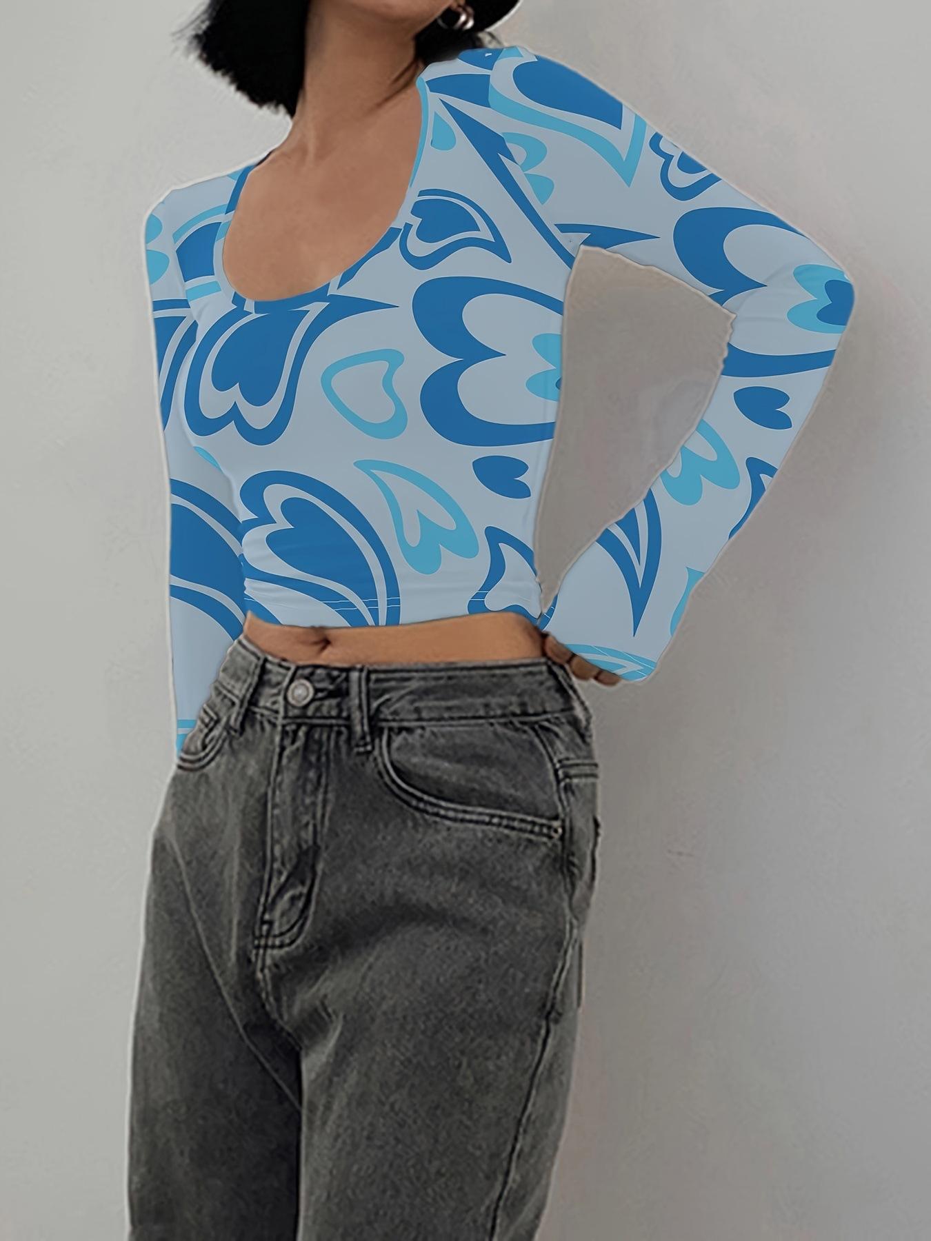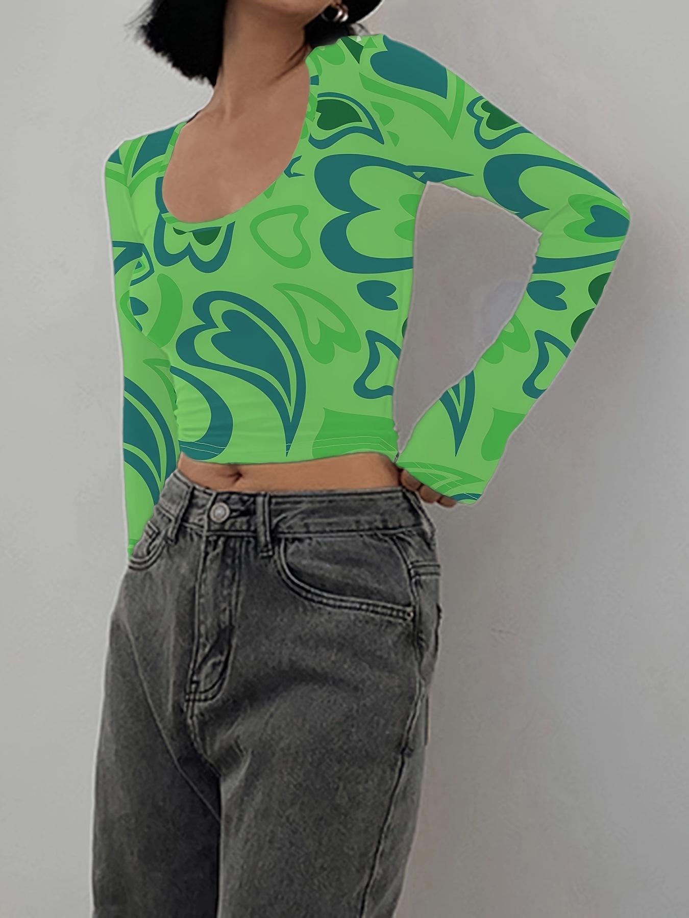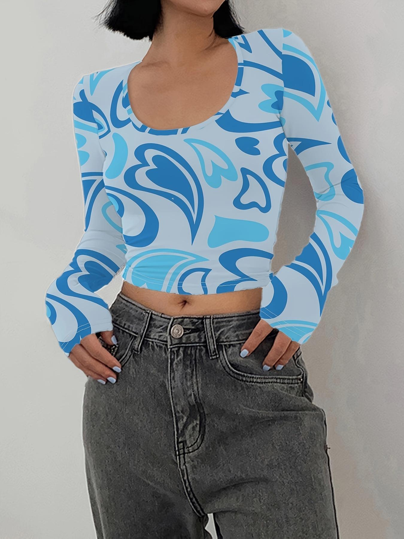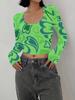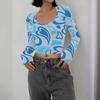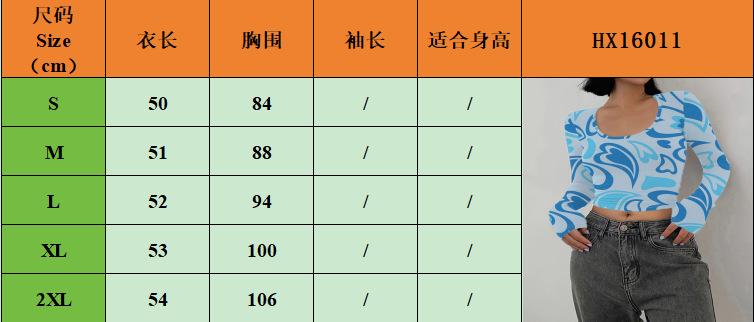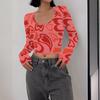 Top de verano europeo y americano de estilo transfronterizo de Amazon, sexy, con cuello en U grande, estampado, de manga larga, ajustado y corto, para mujer