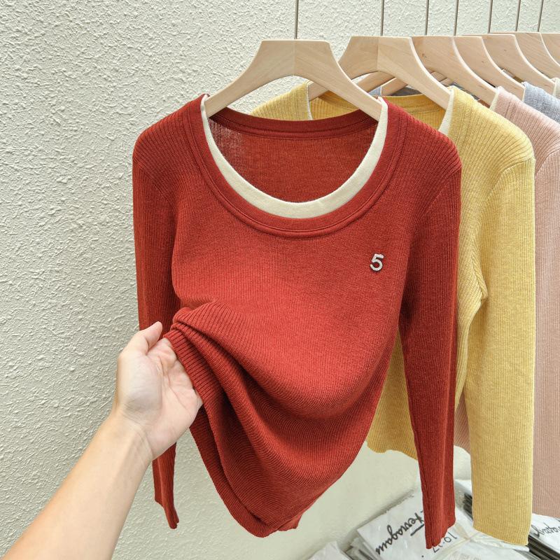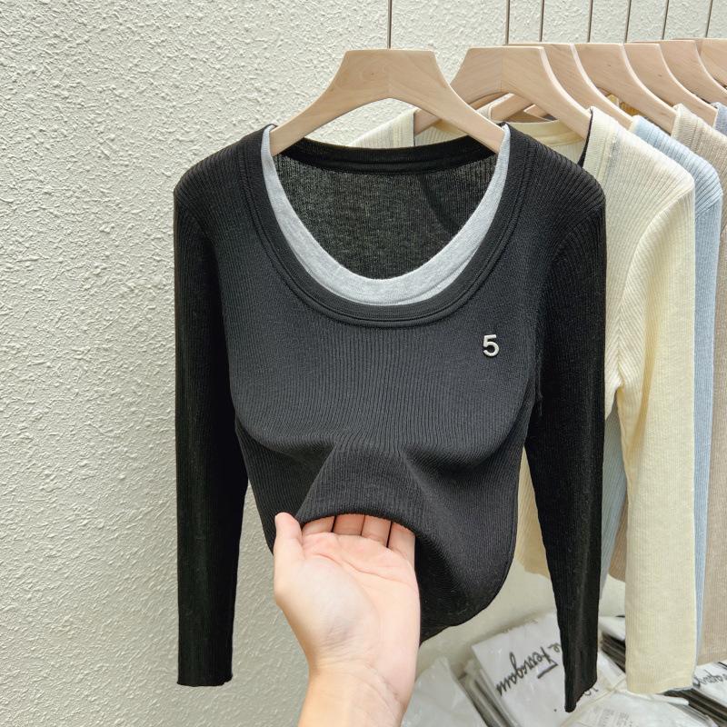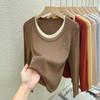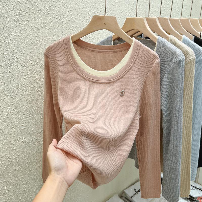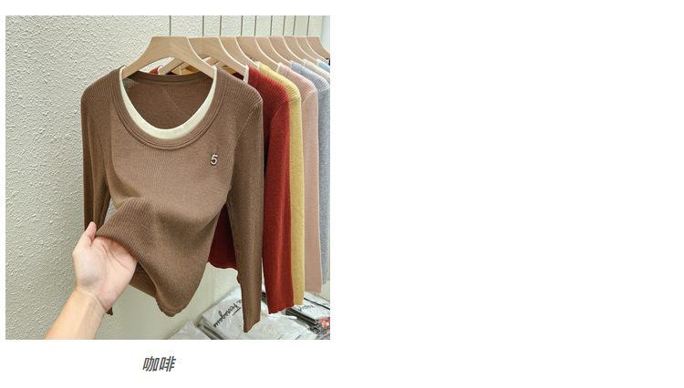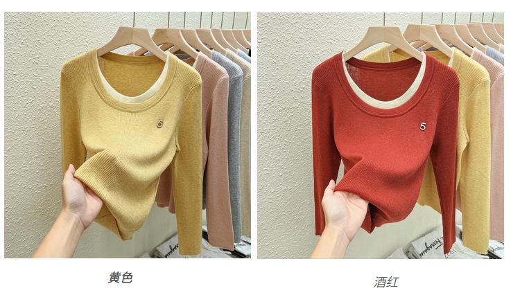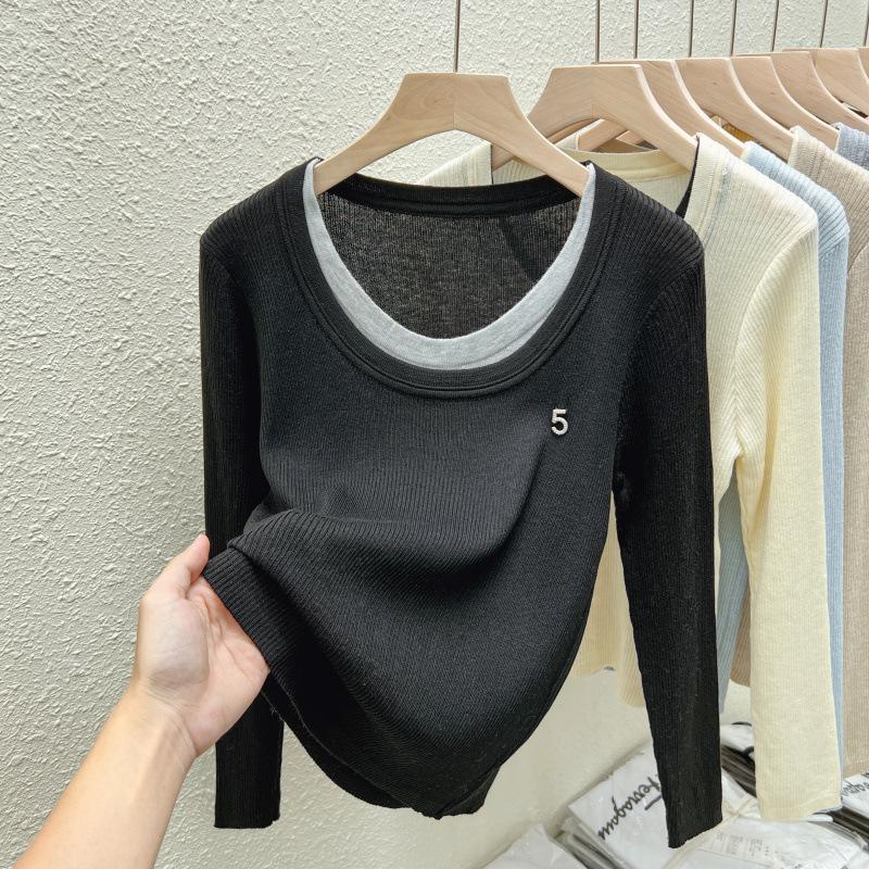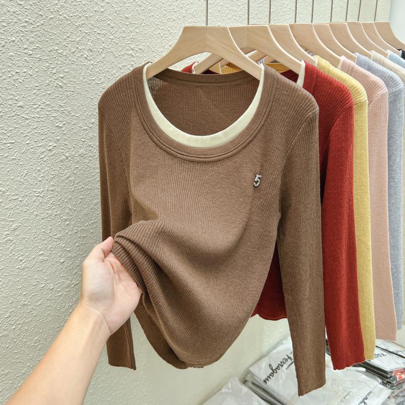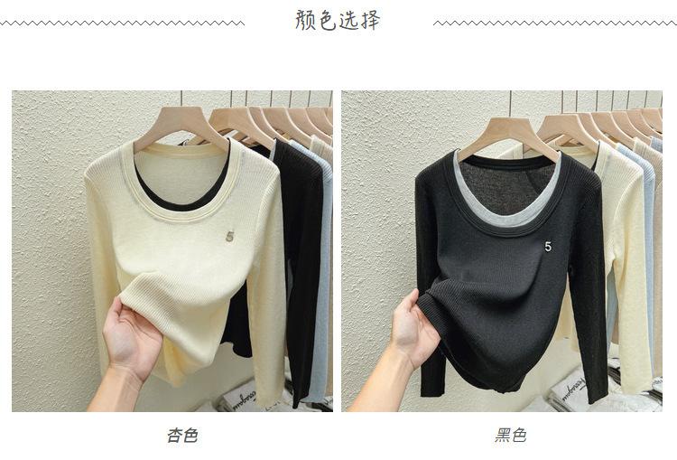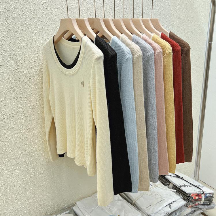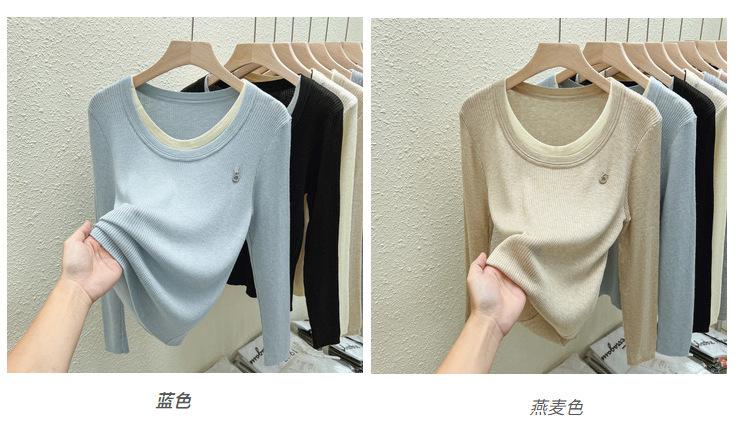 Cuello Redondo Color Contrastante Falso Dos Piezas Tejido de Punto Tejido de Punto para Mujer Otoño Nuevo Estilo Coreano Versátil Look Adelgazante Camiseta Base