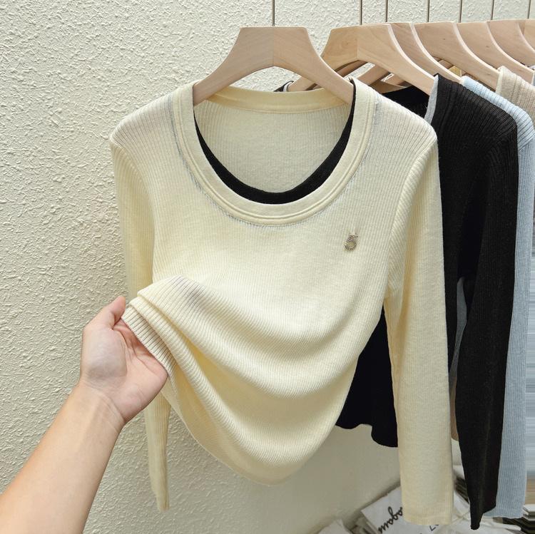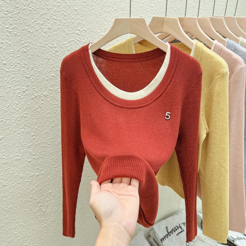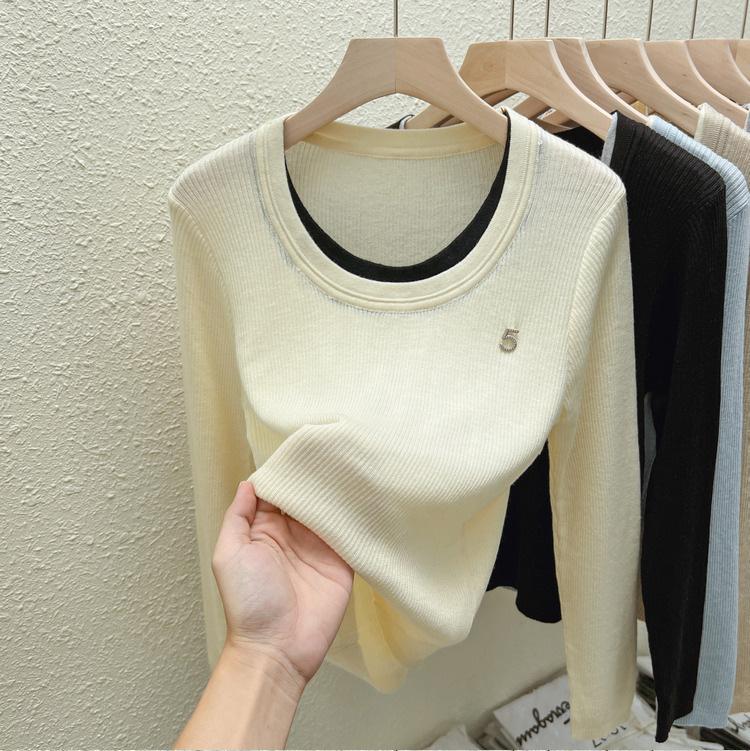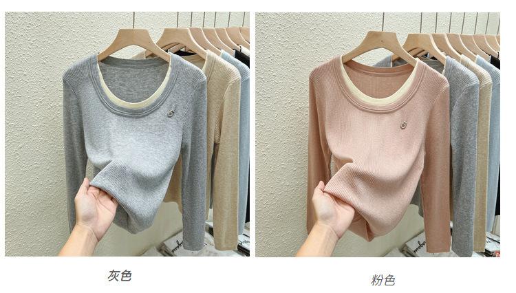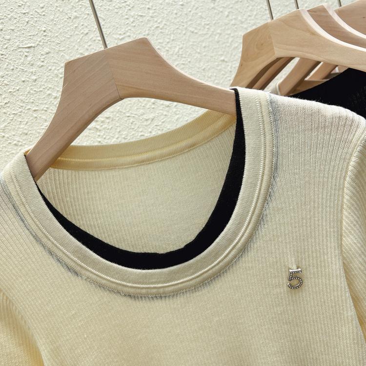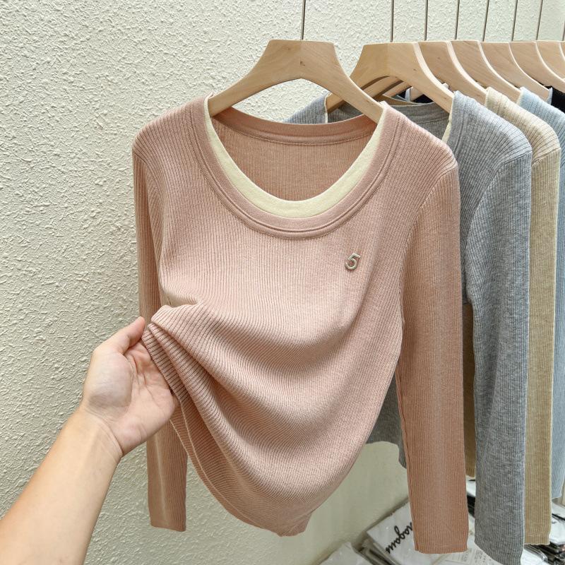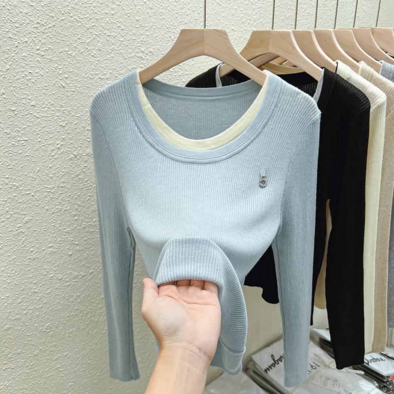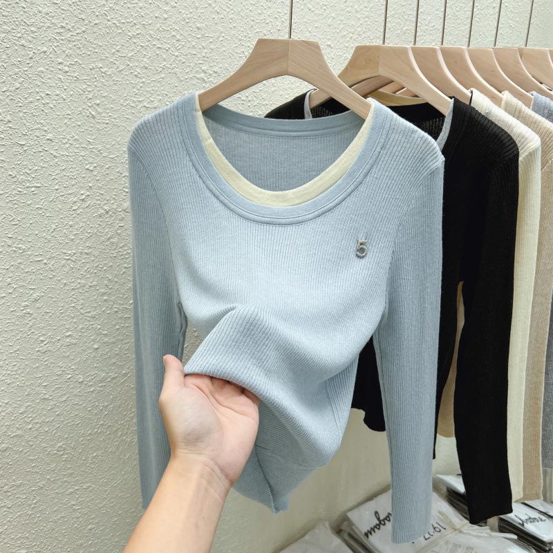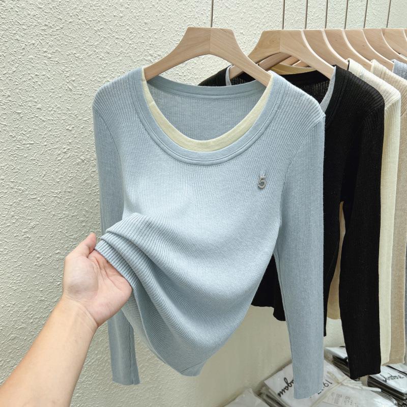 Cuello Redondo Color Contrastante Falso Dos Piezas Tejido de Punto Tejido de Punto para Mujer Otoño Nuevo Estilo Coreano Versátil Look Adelgazante Camiseta Base