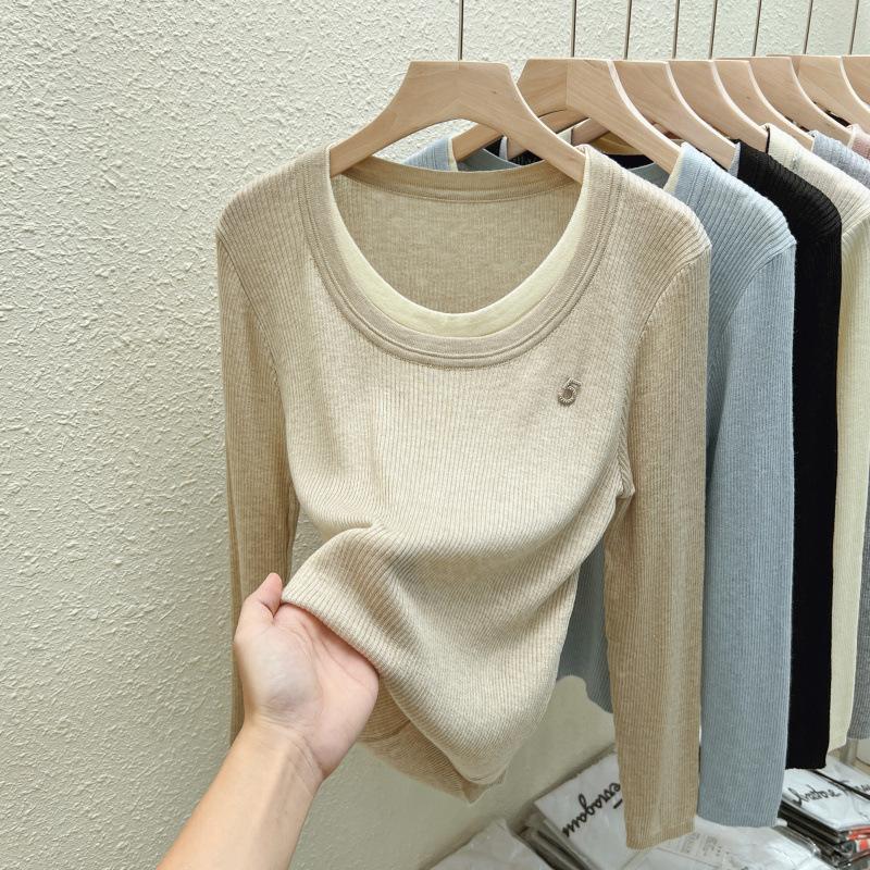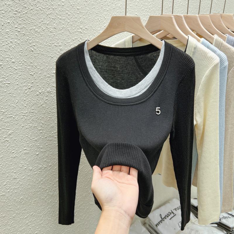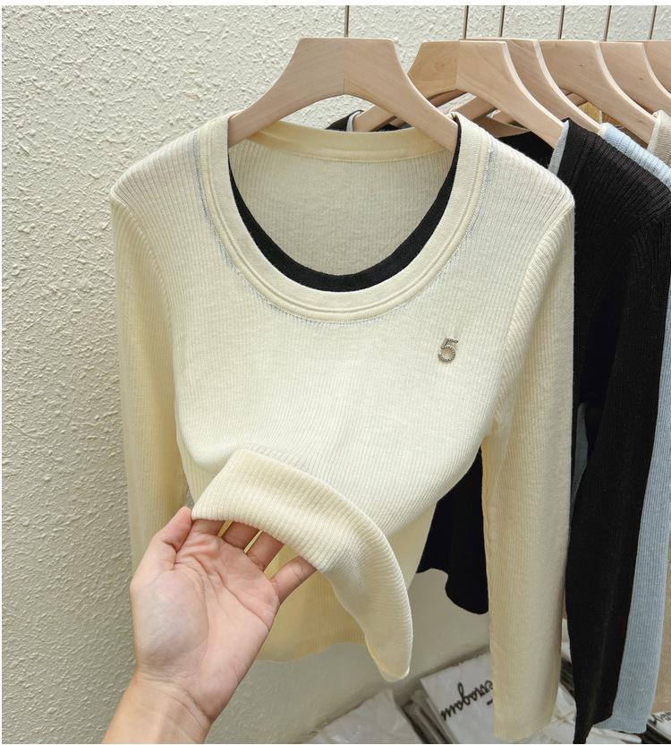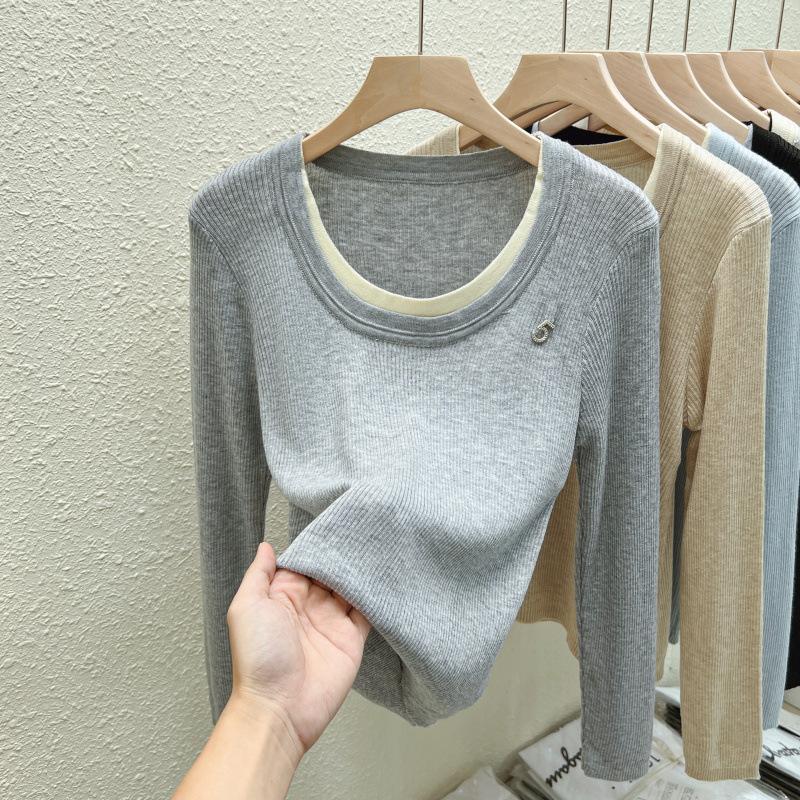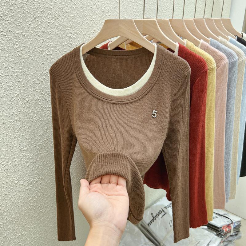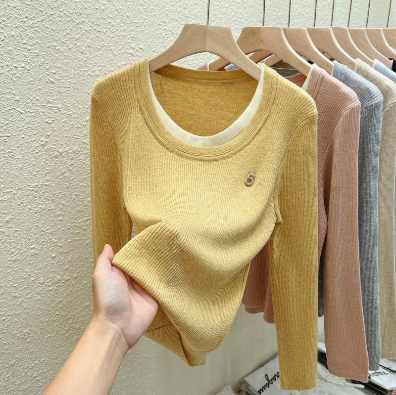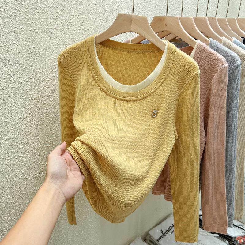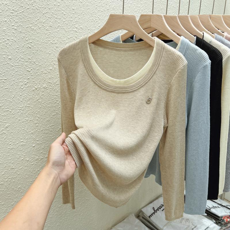 Cuello Redondo Color Contrastante Falso Dos Piezas Tejido de Punto Tejido de Punto para Mujer Otoño Nuevo Estilo Coreano Versátil Look Adelgazante Camiseta Base