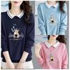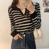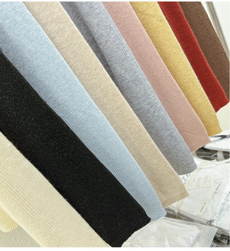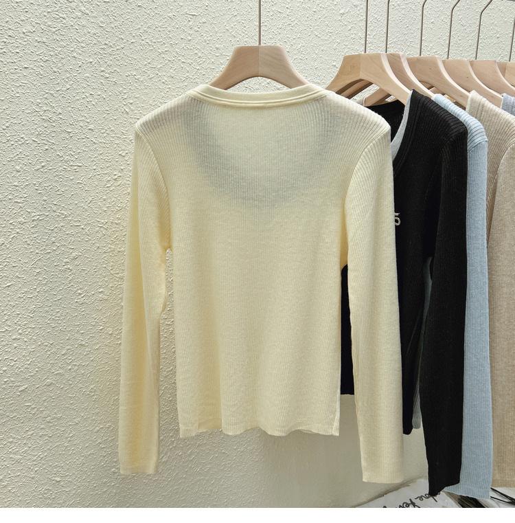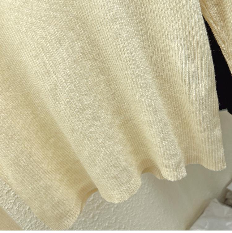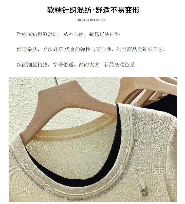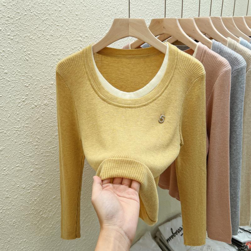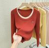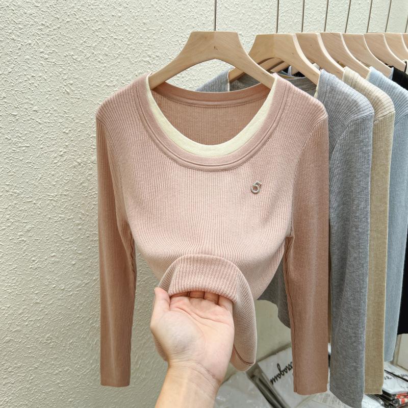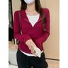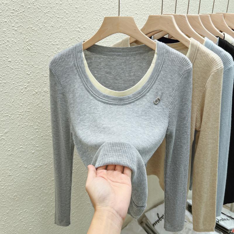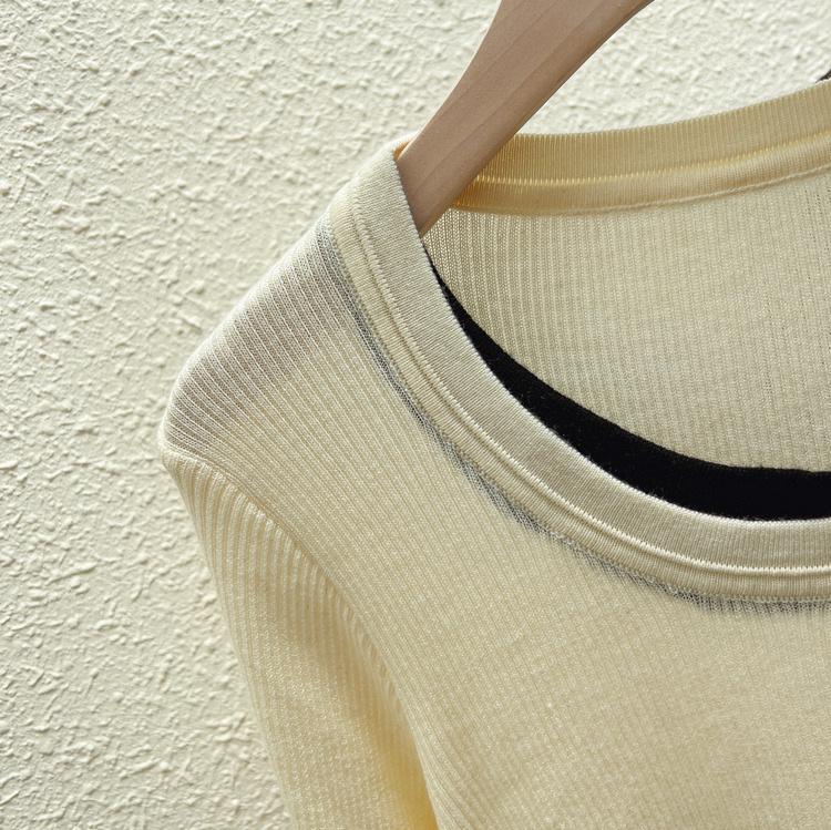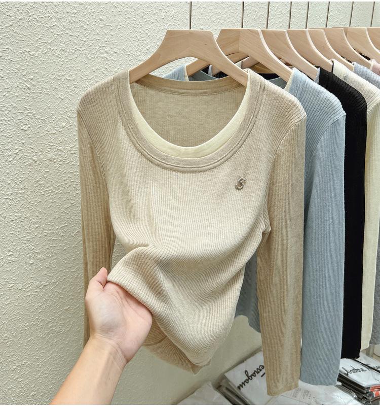 Cuello Redondo Color Contrastante Falso Dos Piezas Tejido de Punto Tejido de Punto para Mujer Otoño Nuevo Estilo Coreano Versátil Look Adelgazante Camiseta Base