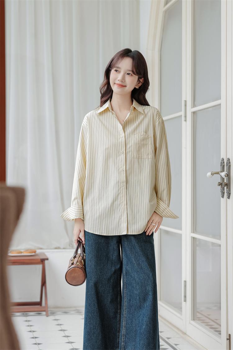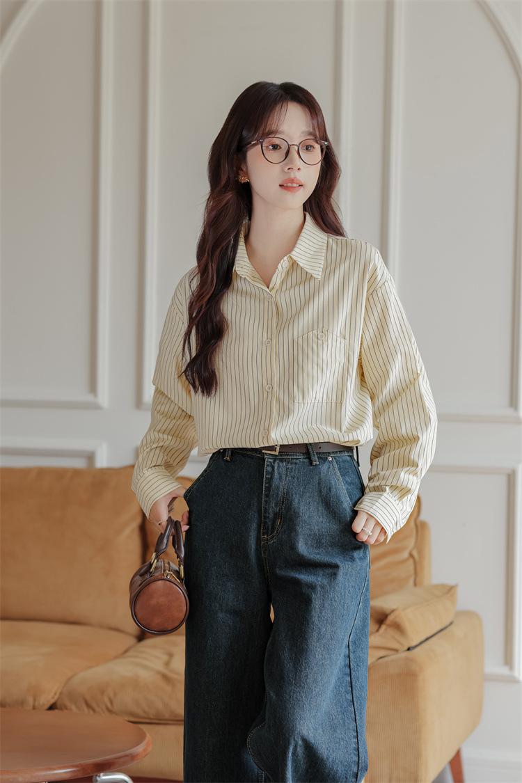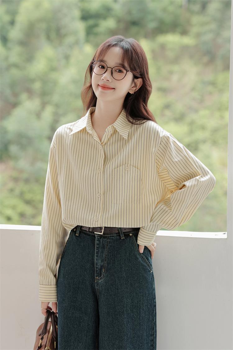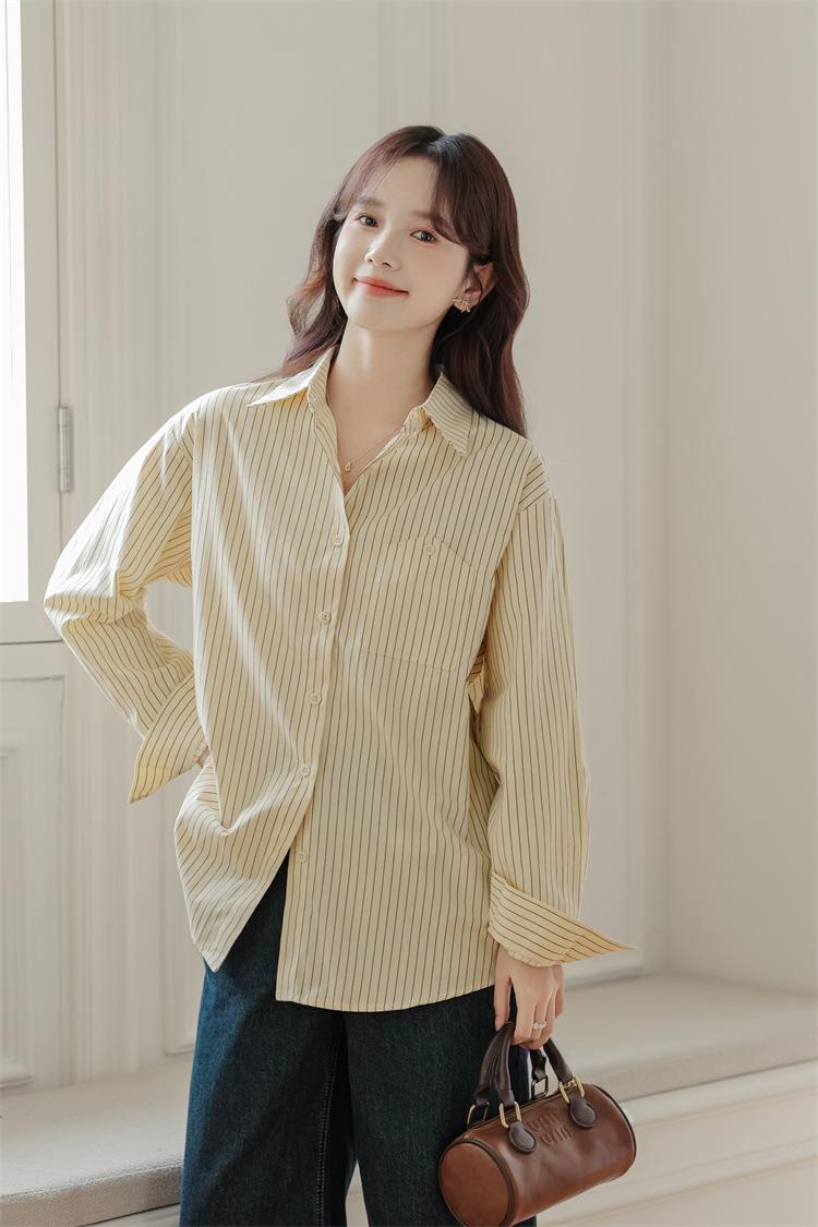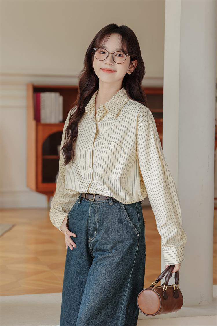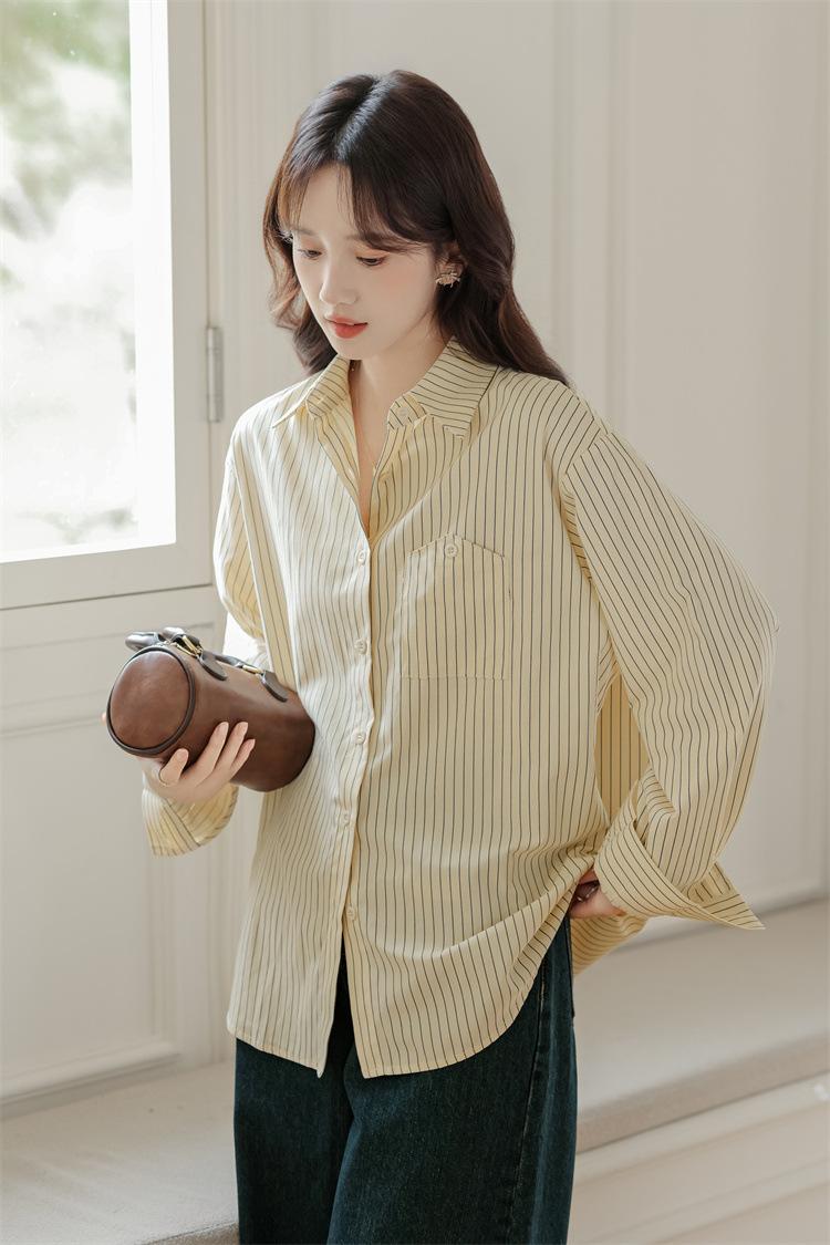 Otoño 2024 Nuevo Estilo Coreano Rayado Casual Relajado Combinable Solapa Bolsillo Diseño Sensación Manga Larga Camisa Top para Mujer