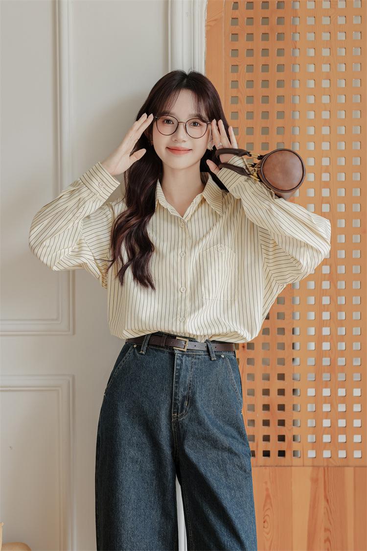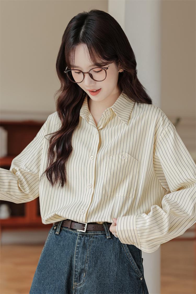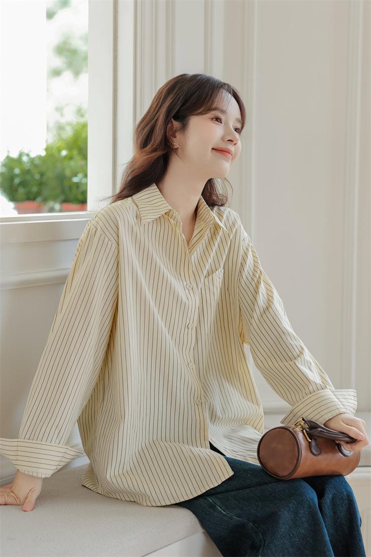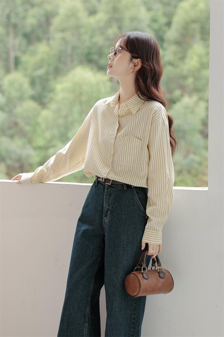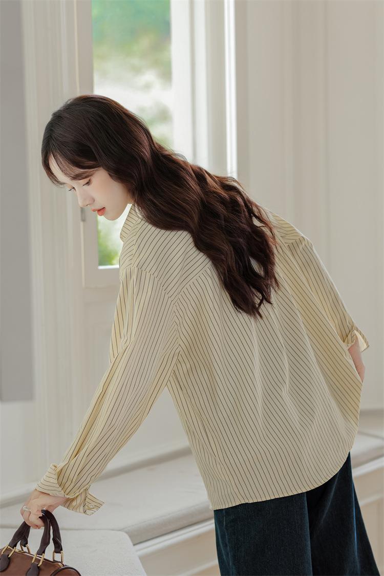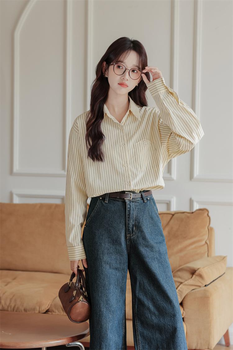 Otoño 2024 Nuevo Estilo Coreano Rayado Casual Relajado Combinable Solapa Bolsillo Diseño Sensación Manga Larga Camisa Top para Mujer