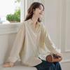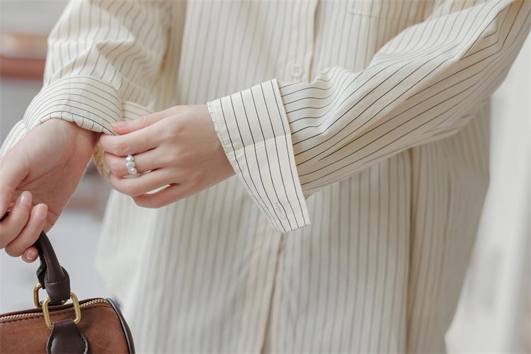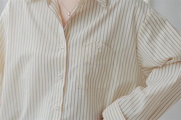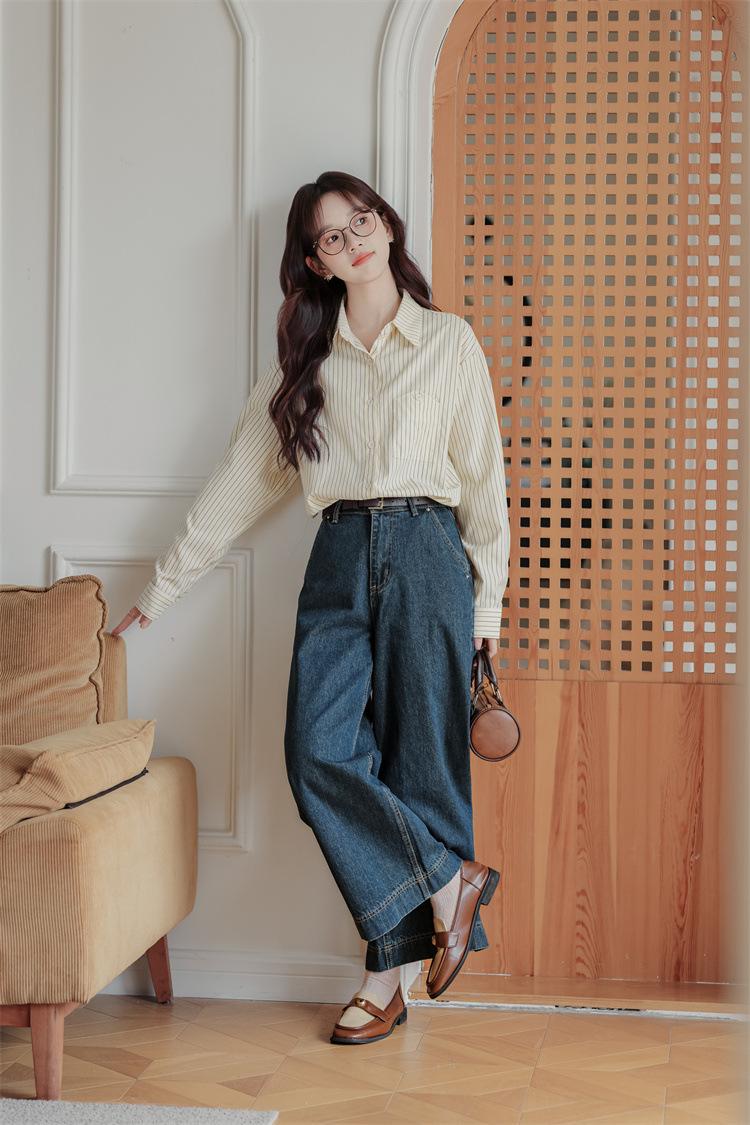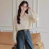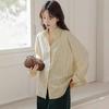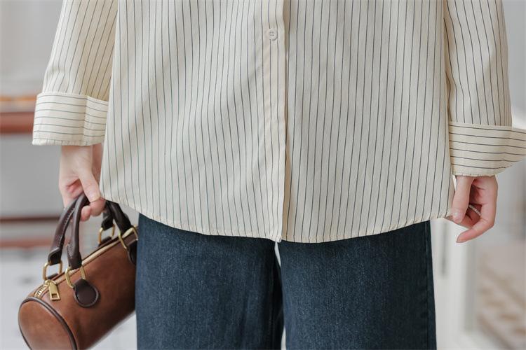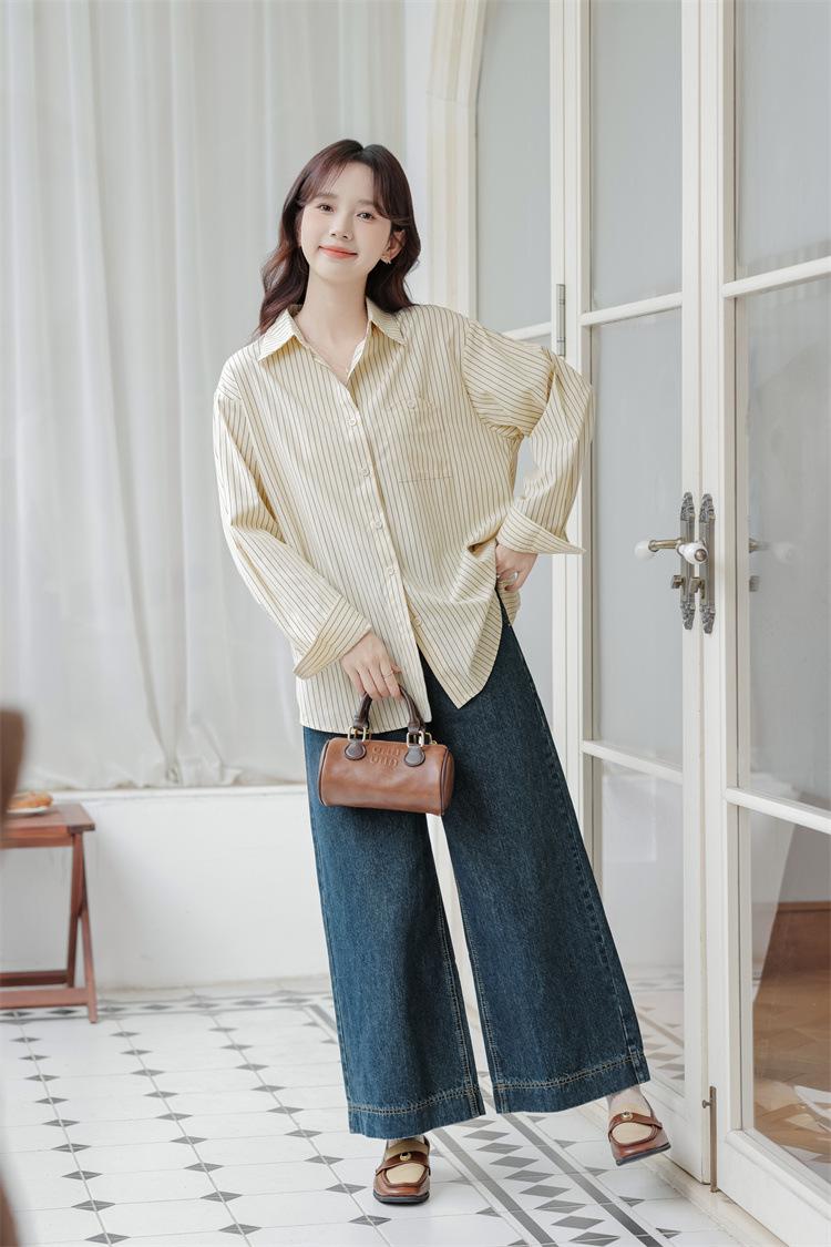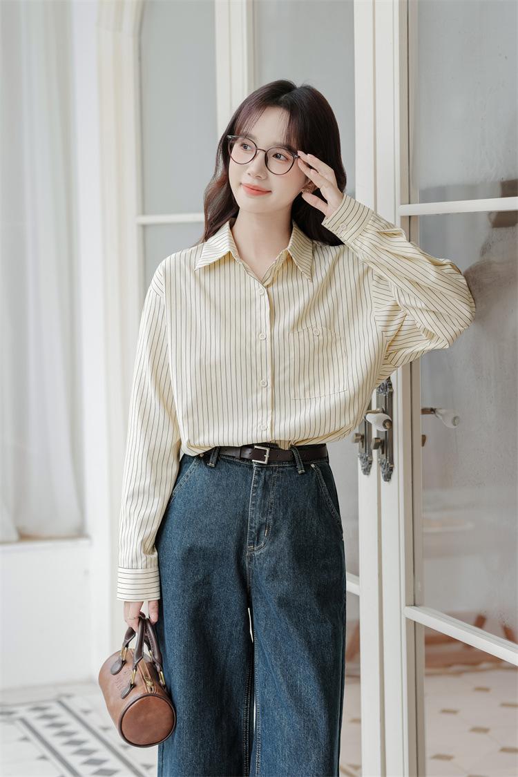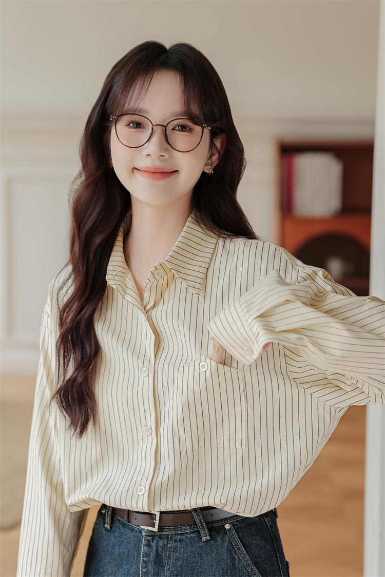 Otoño 2024 Nuevo Estilo Coreano Rayado Casual Relajado Combinable Solapa Bolsillo Diseño Sensación Manga Larga Camisa Top para Mujer