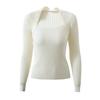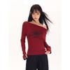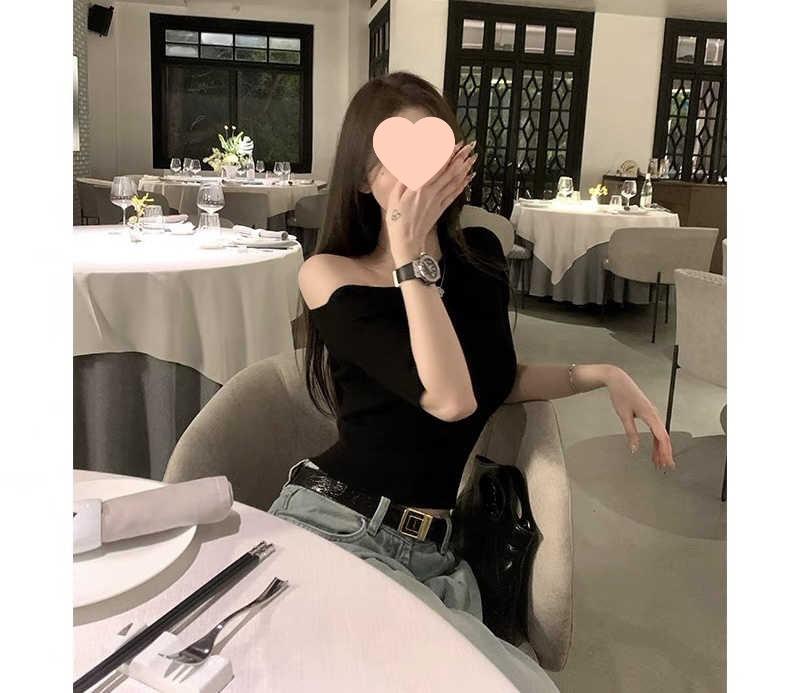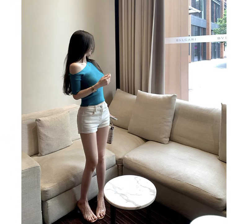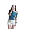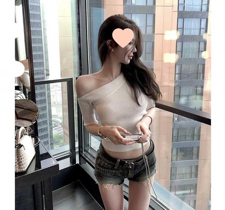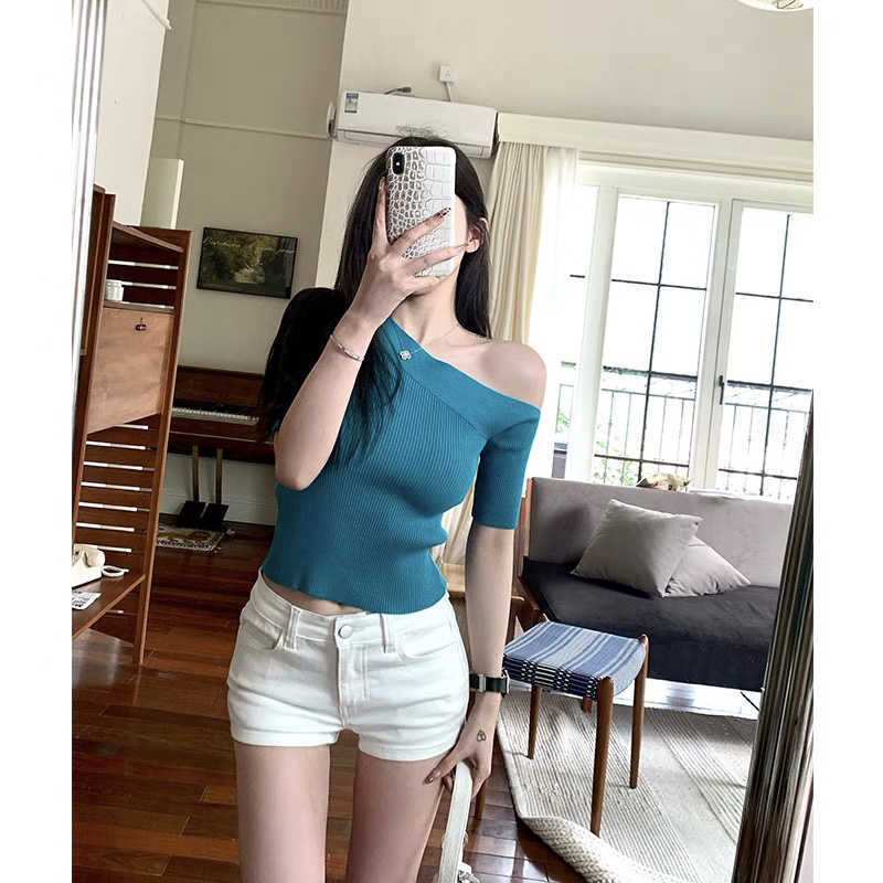 Suéter ajustado con mangas oblicuas y hombros descubiertos para mujer, disponible en stock, verano 2025.
