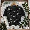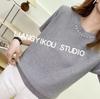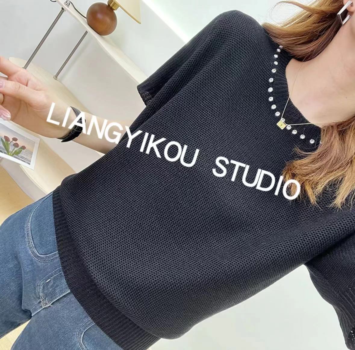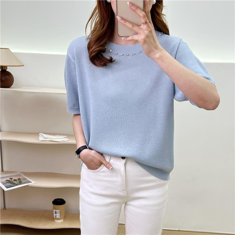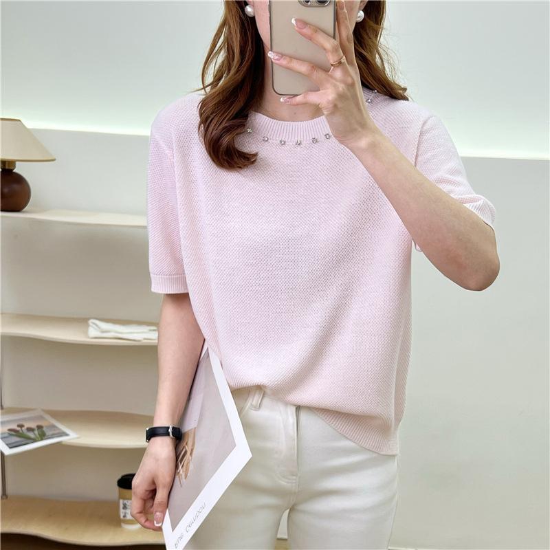 Tejido de Punto de Manga Corta para Mujer, Delgado Estilo Nuevo de Verano, Camiseta con Cuentas a la Moda, Top de Diseño Holgado y Versátil, Trendy