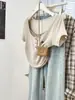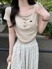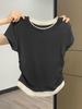 Camiseta de manga corta de dos piezas con contraste de color azul a rayas pequeñas para mujer, diseño de verano, hombros descubiertos, corte entallado.