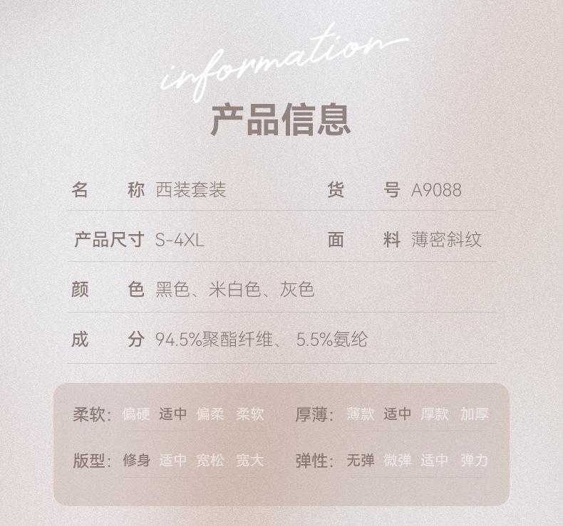 Gray one-piece suit, Off-white one-piece suit, Black one-piece suit, Gray suit + pants, Off-white suit + pants...