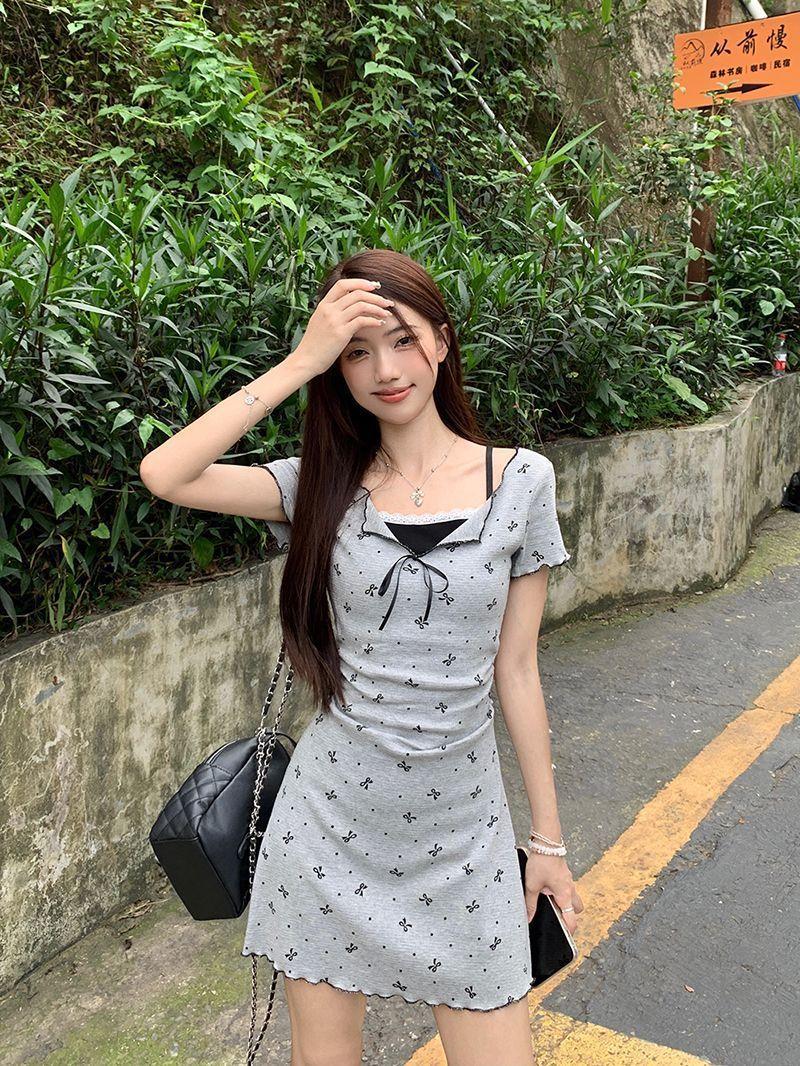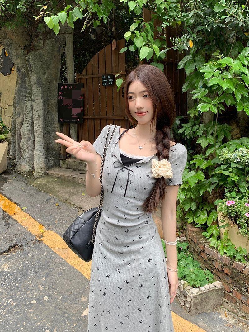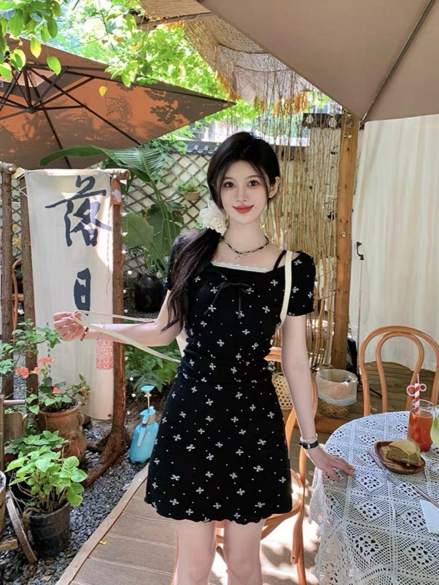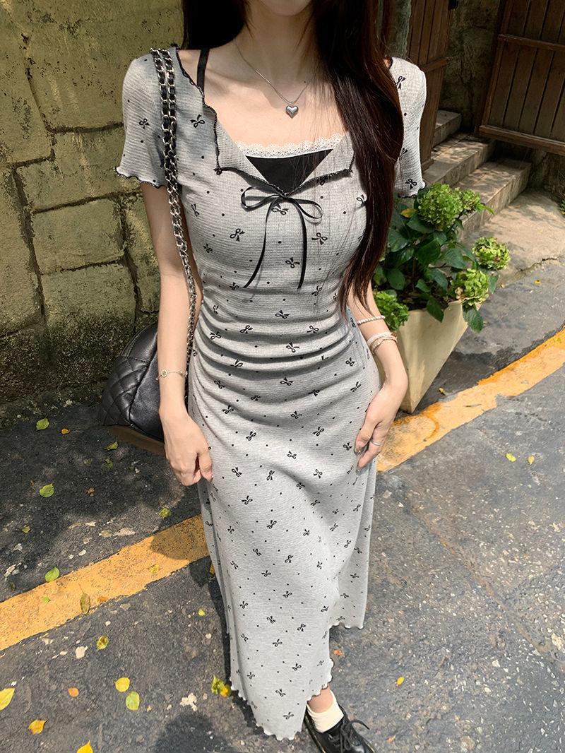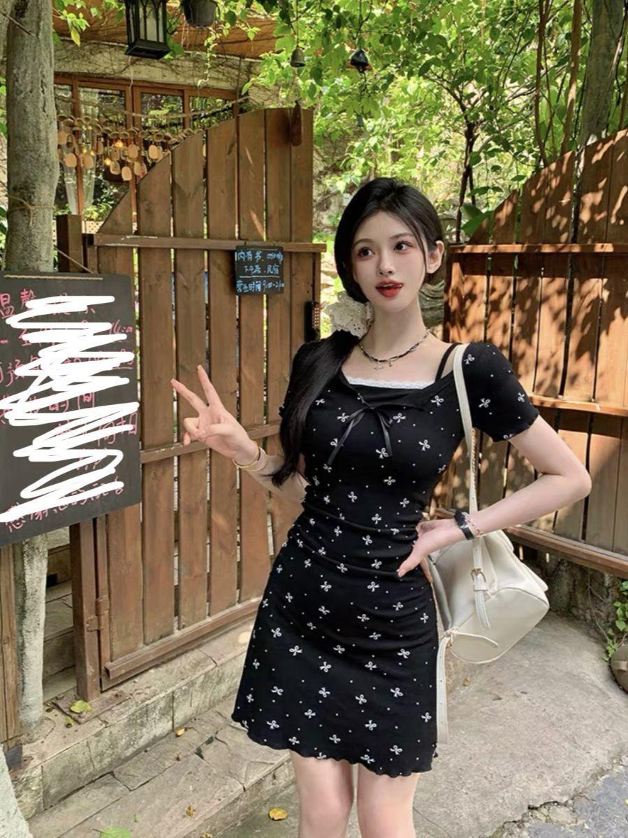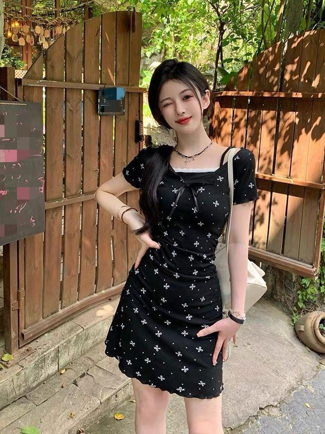 Vestido Puro de Manga Corta Estampado de Alta Gama para Mujer Verano Elegante Encaje Cintura Ajustada Falda de Cadera