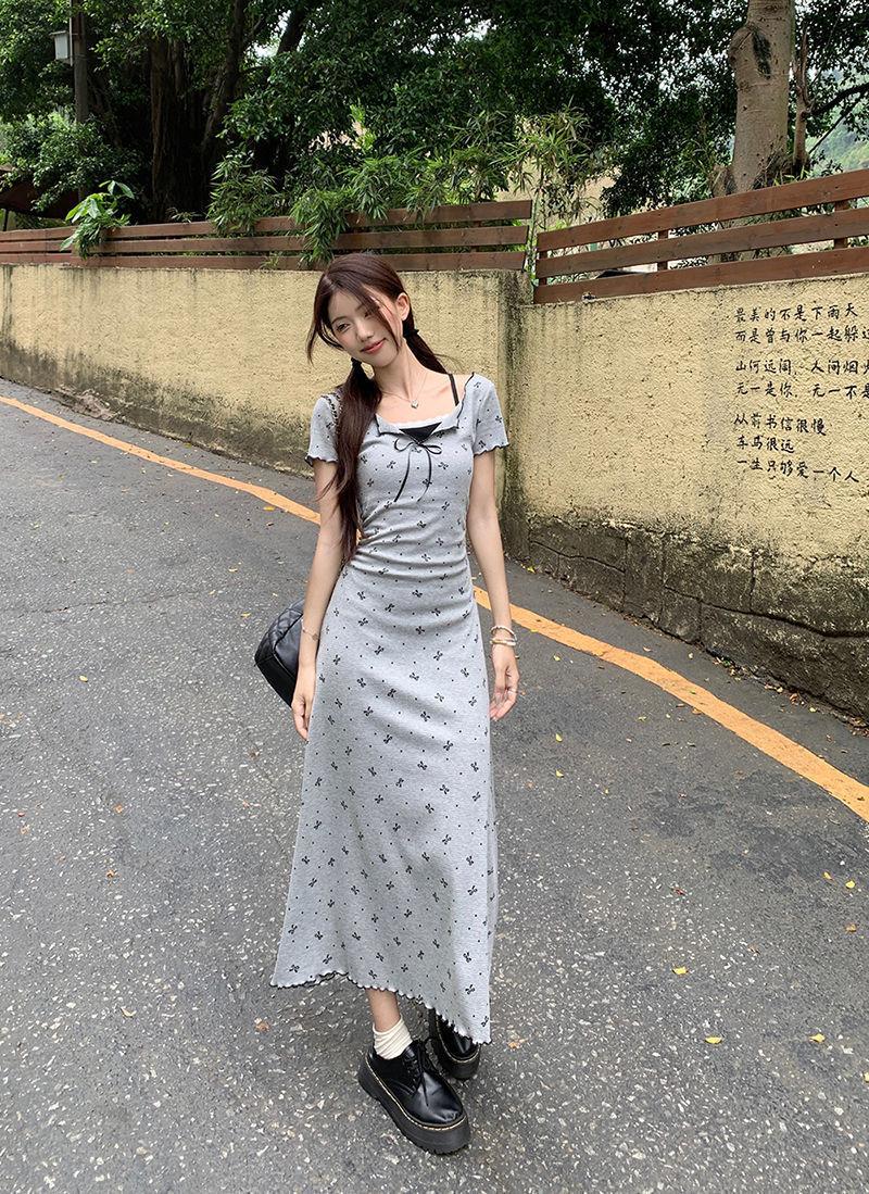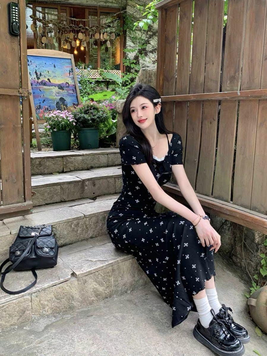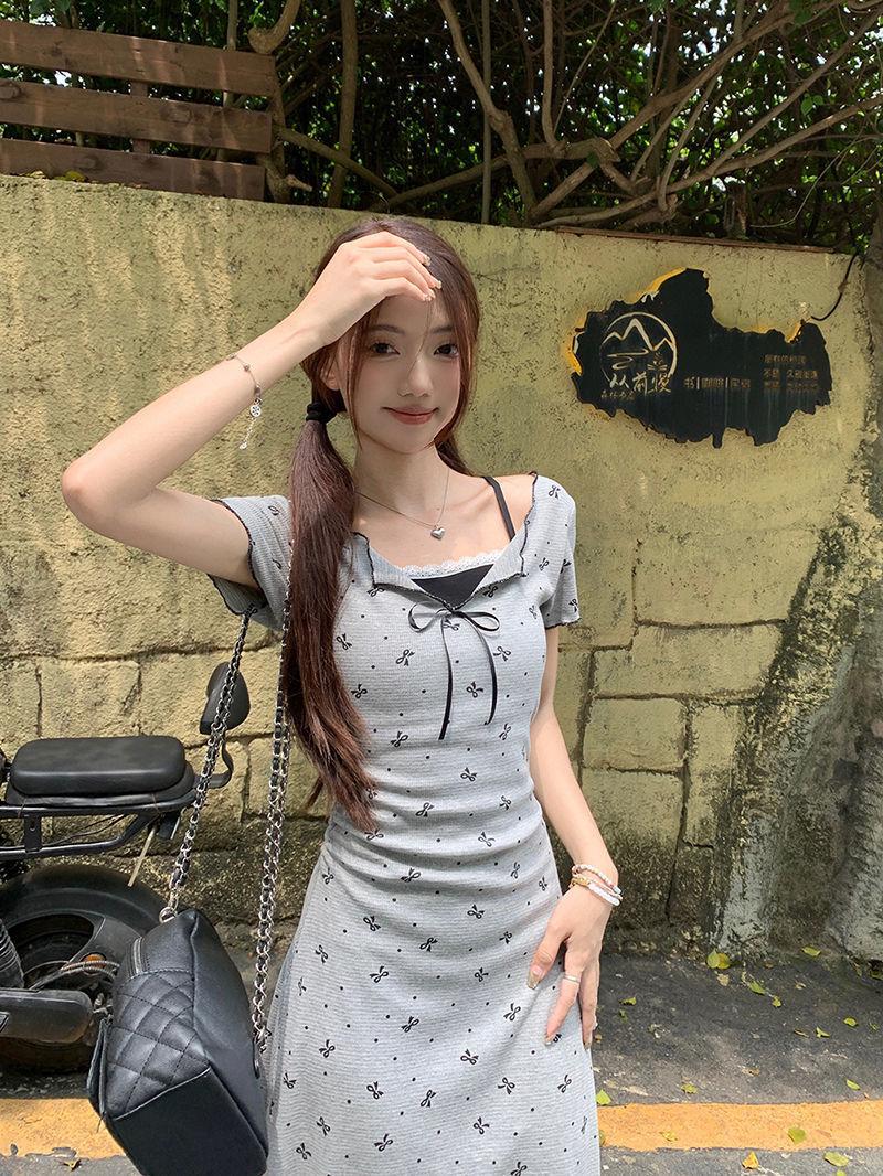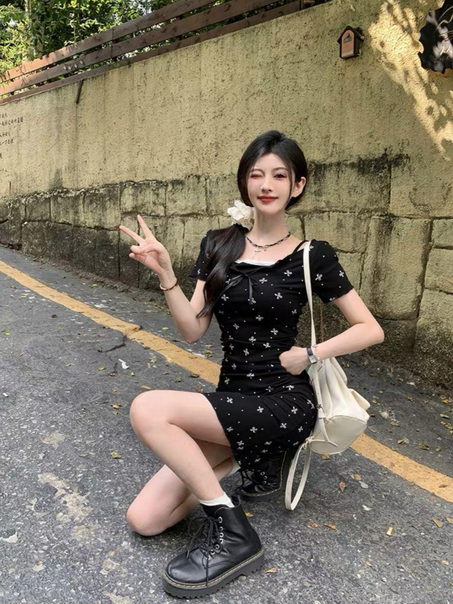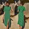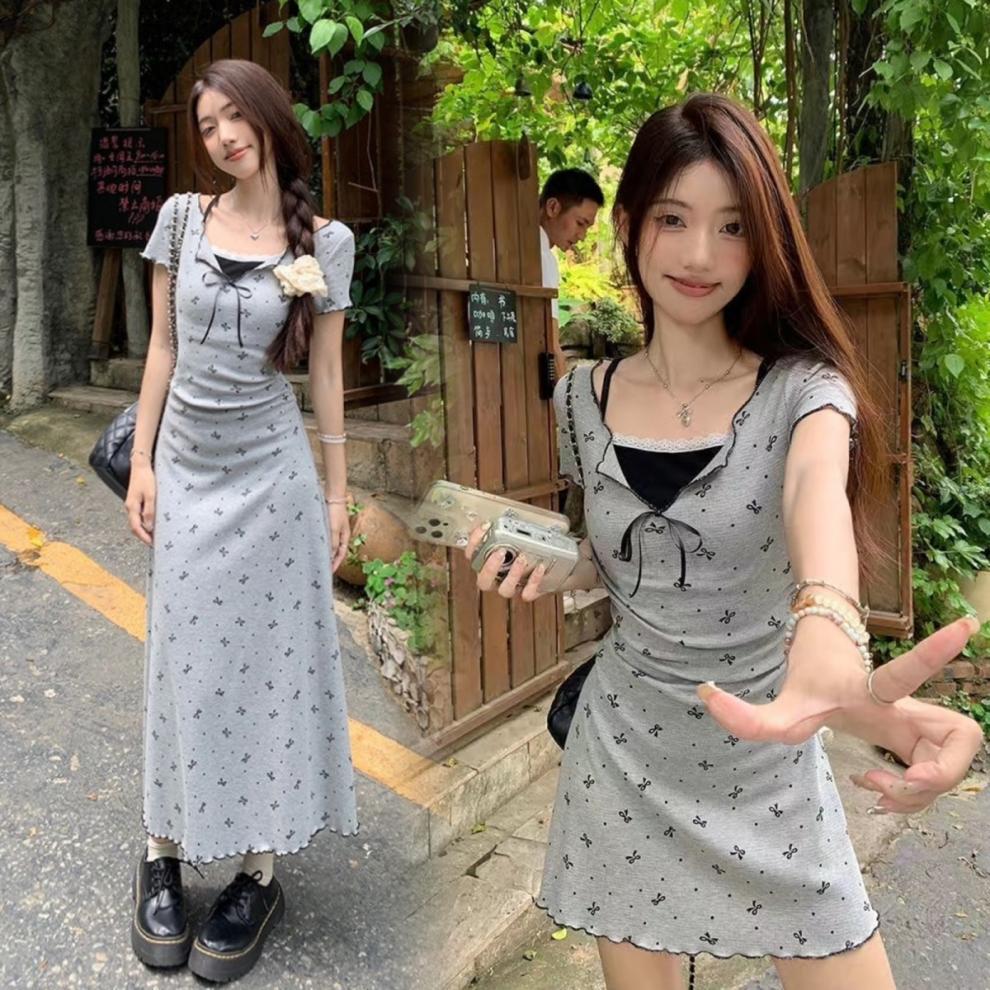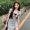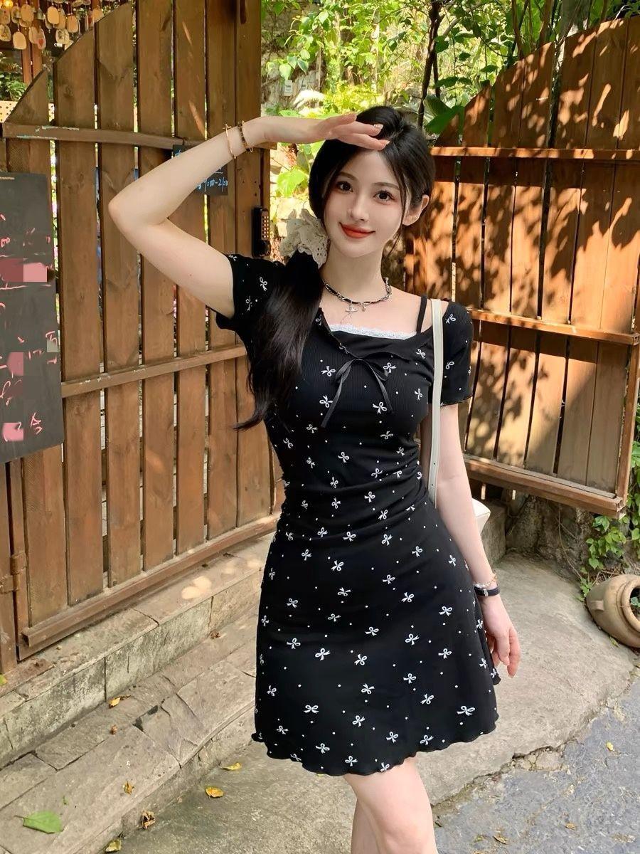 Vestido Puro de Manga Corta Estampado de Alta Gama para Mujer Verano Elegante Encaje Cintura Ajustada Falda de Cadera
