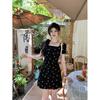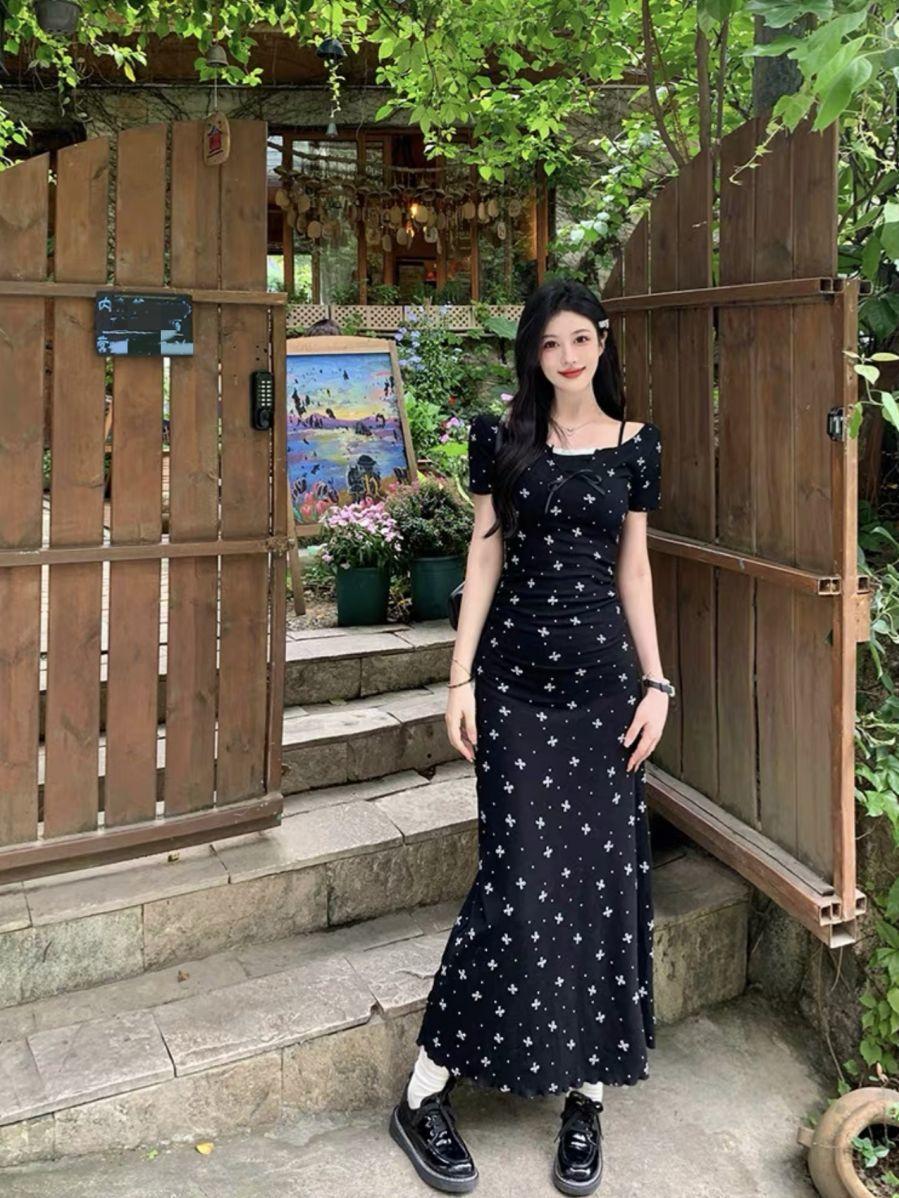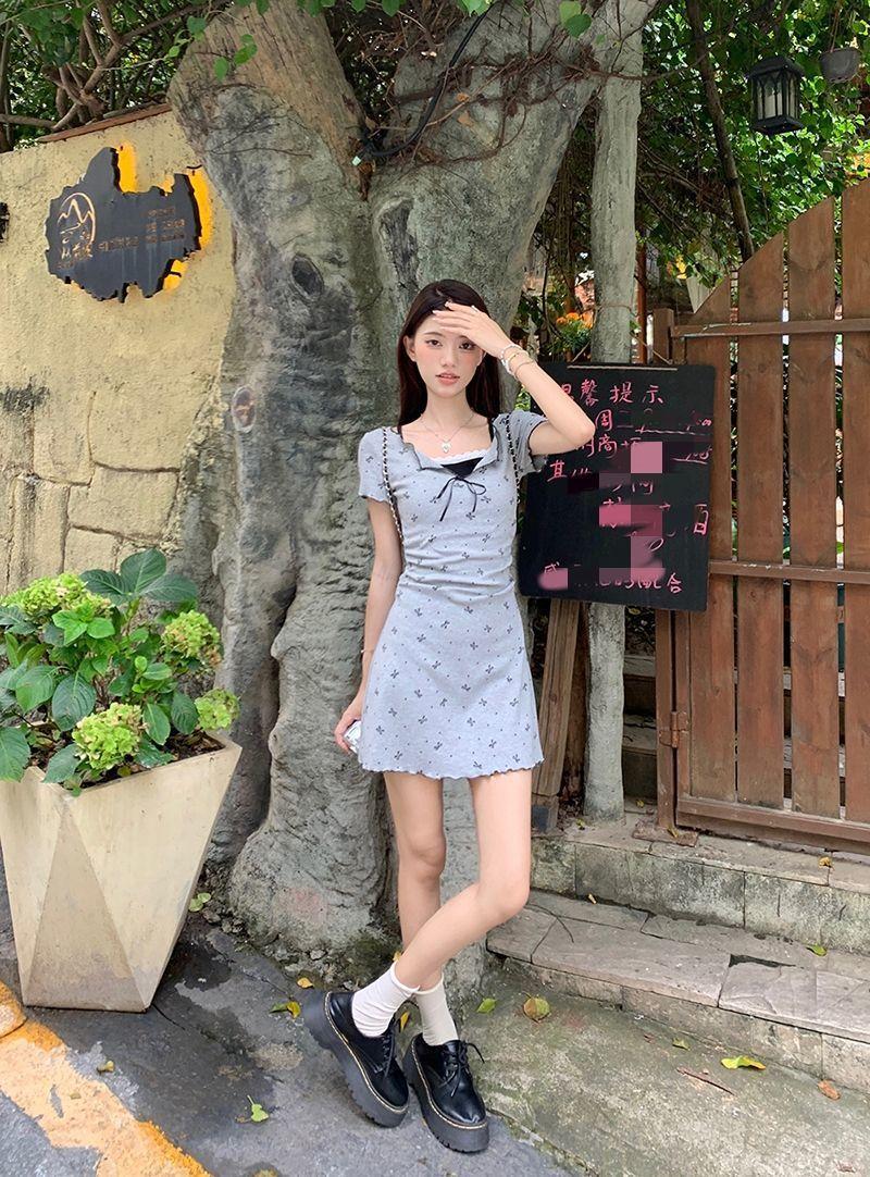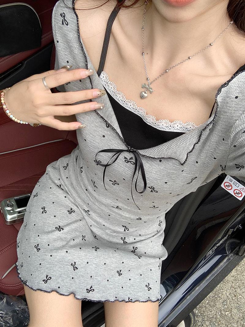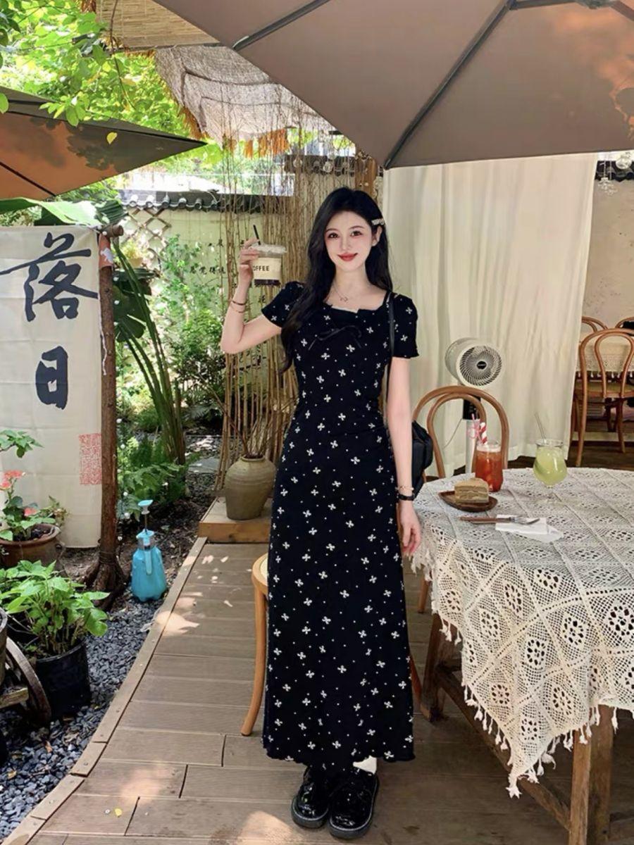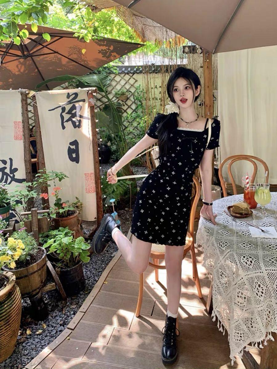 Vestido Puro de Manga Corta Estampado de Alta Gama para Mujer Verano Elegante Encaje Cintura Ajustada Falda de Cadera