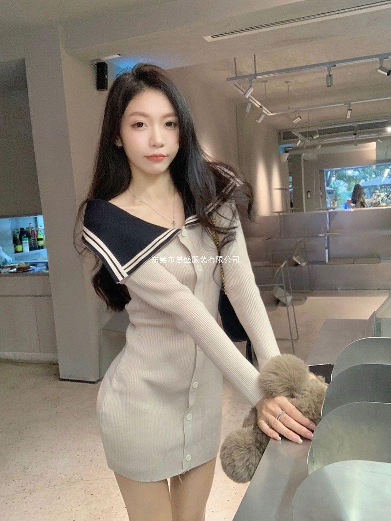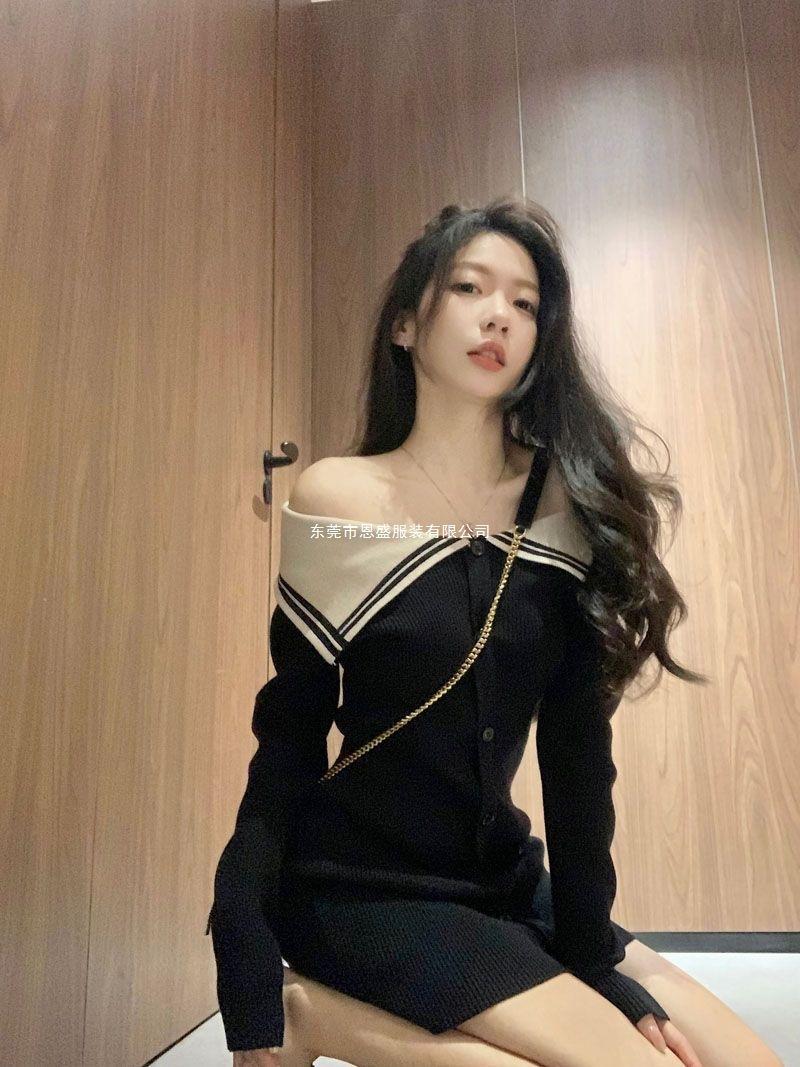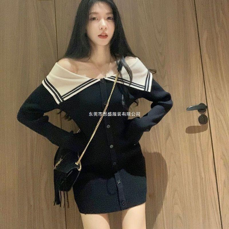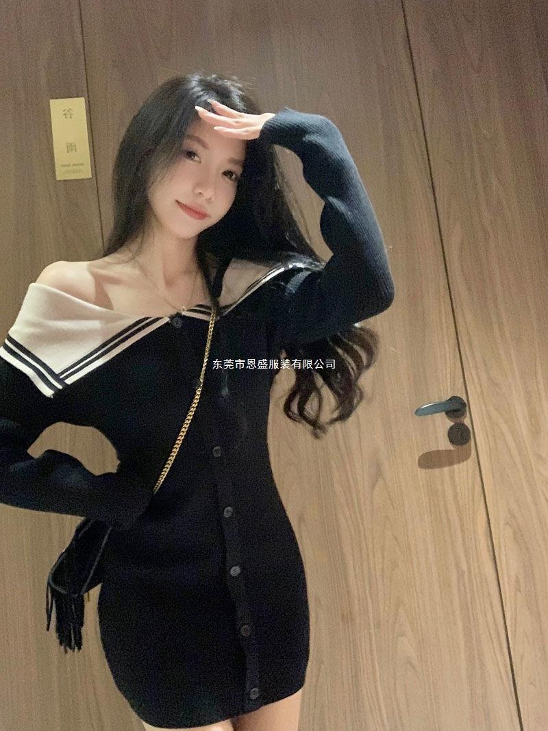 Vestido de punto de un solo hombro para mujer, sexy, con hombros descubiertos, manga larga, falda inferior, nueva falda de primavera con aspecto adelgazante.