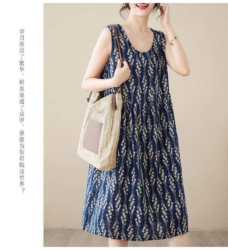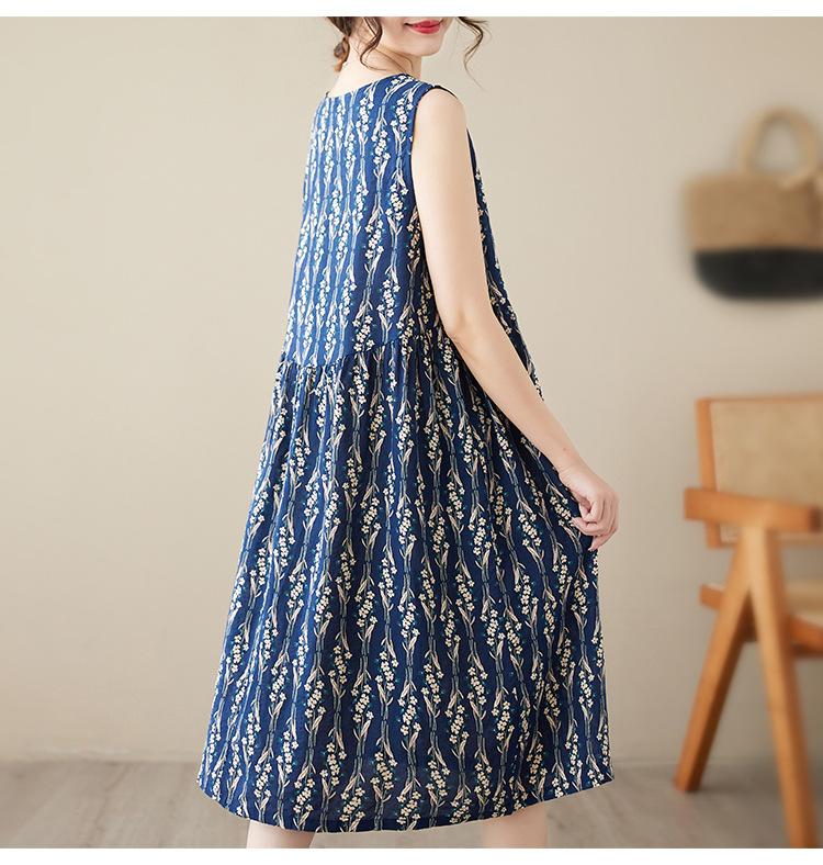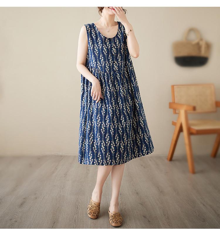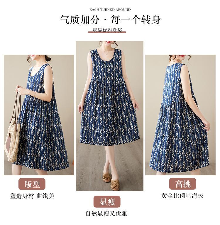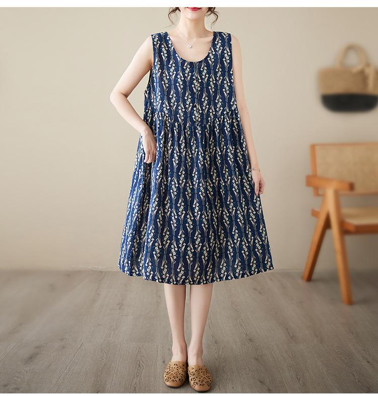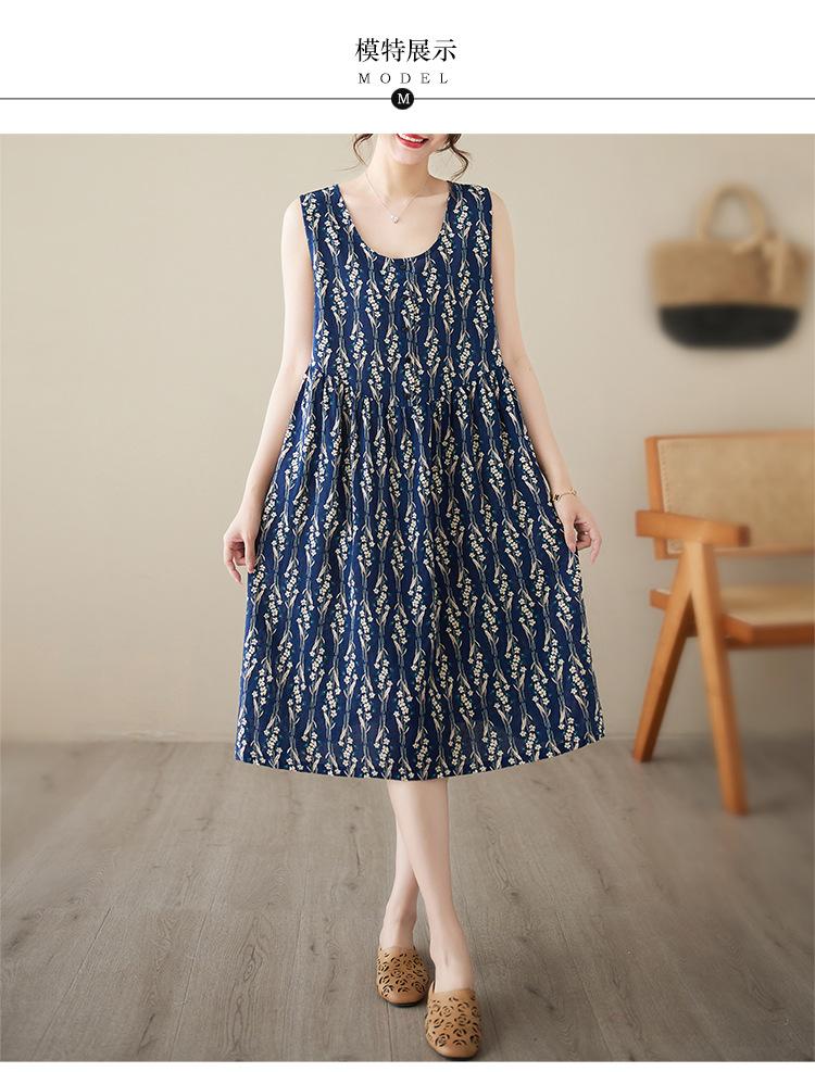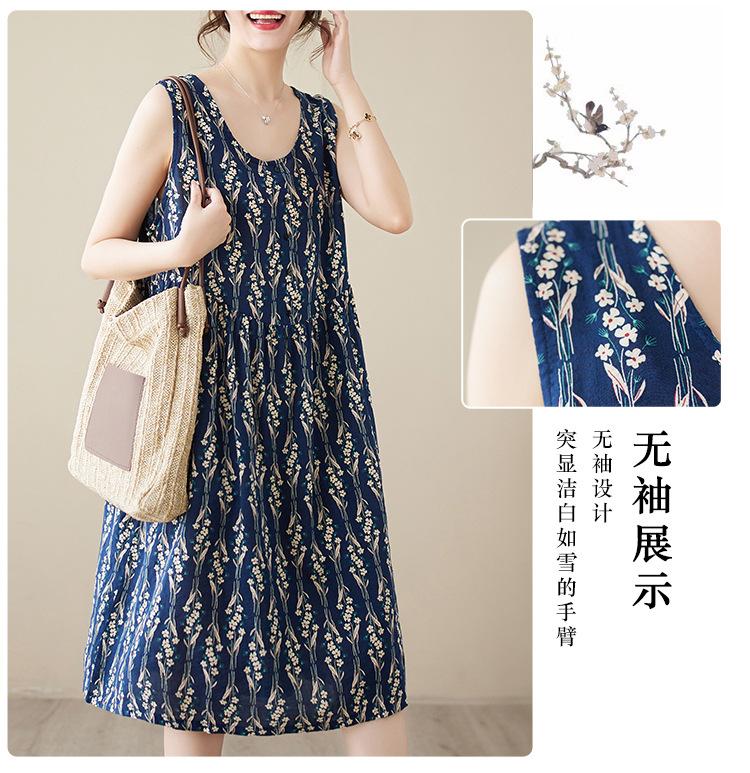 Vestido de verano 2024 con estampado de algodón y lino, estilo coreano, holgado, adelgazante, de longitud media, sin mangas y cuello redondo para mujer
