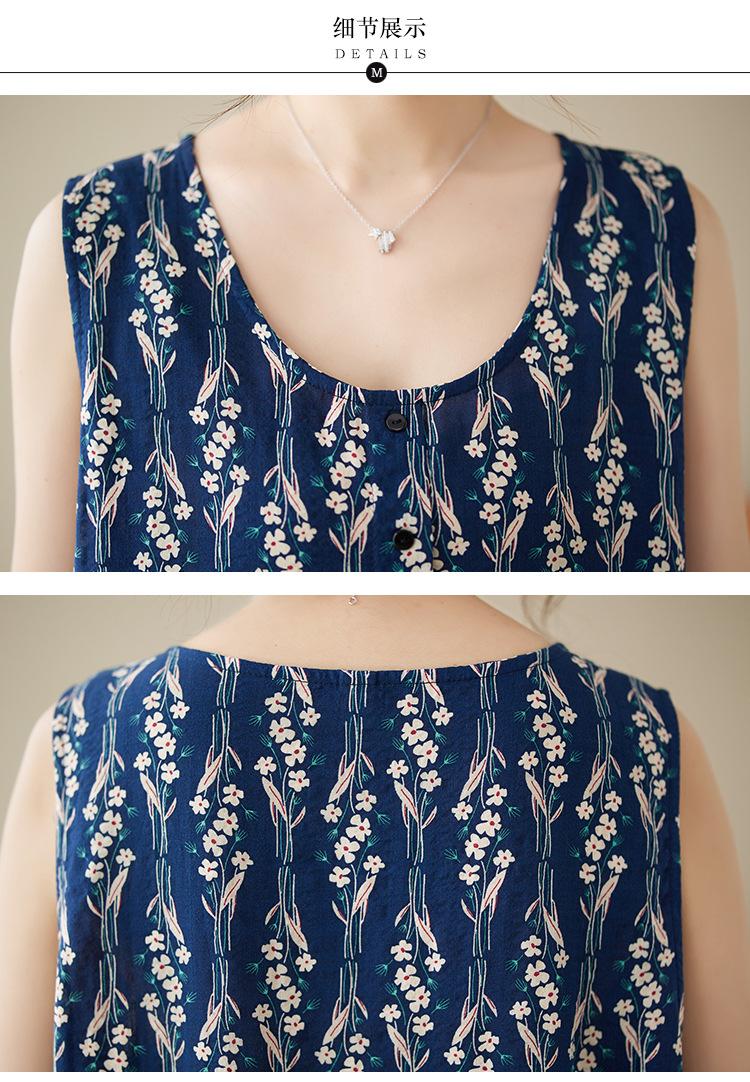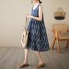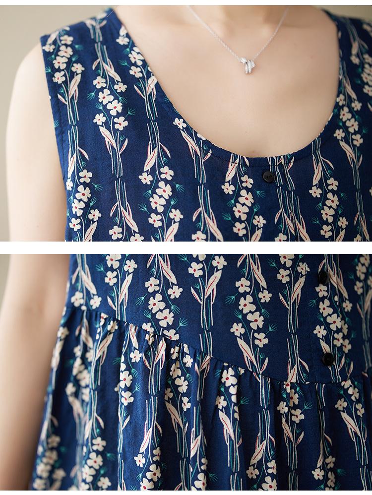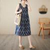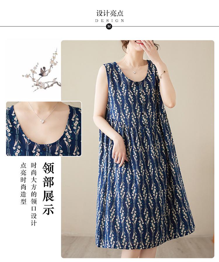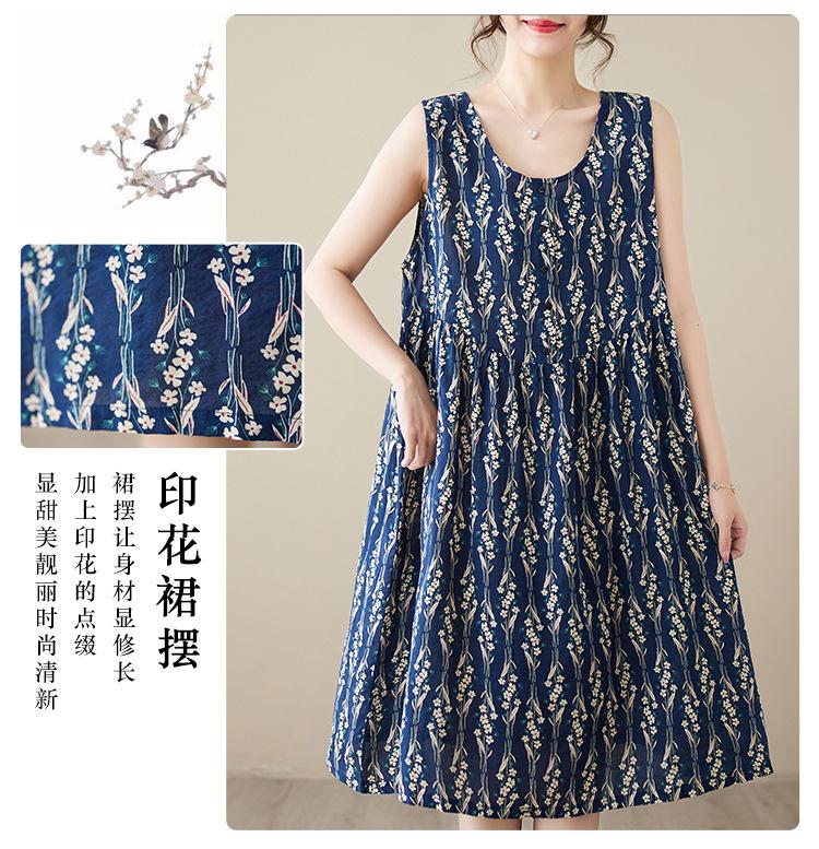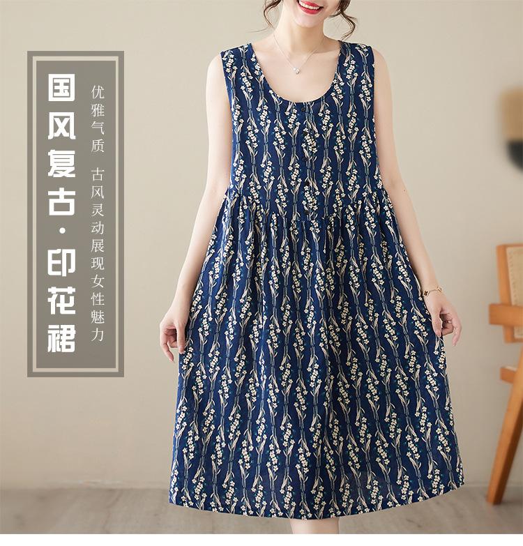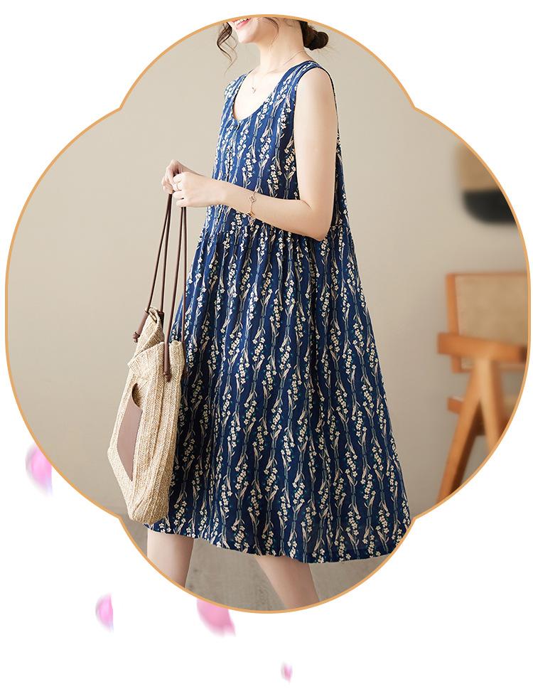 Vestido de verano 2024 con estampado de algodón y lino, estilo coreano, holgado, adelgazante, de longitud media, sin mangas y cuello redondo para mujer