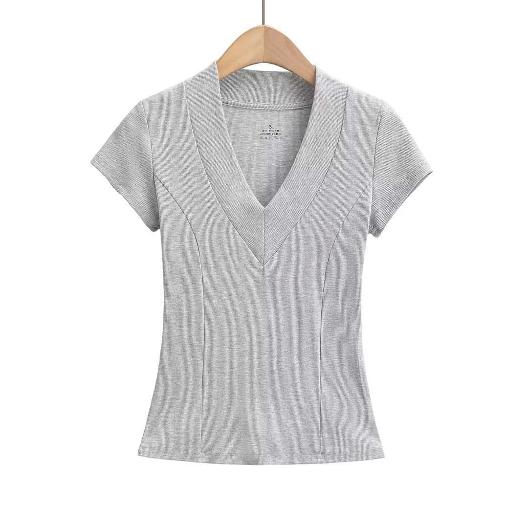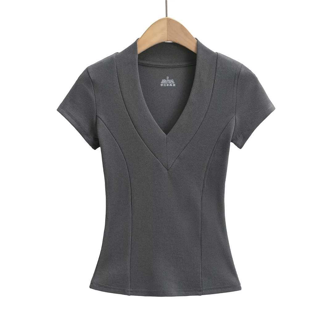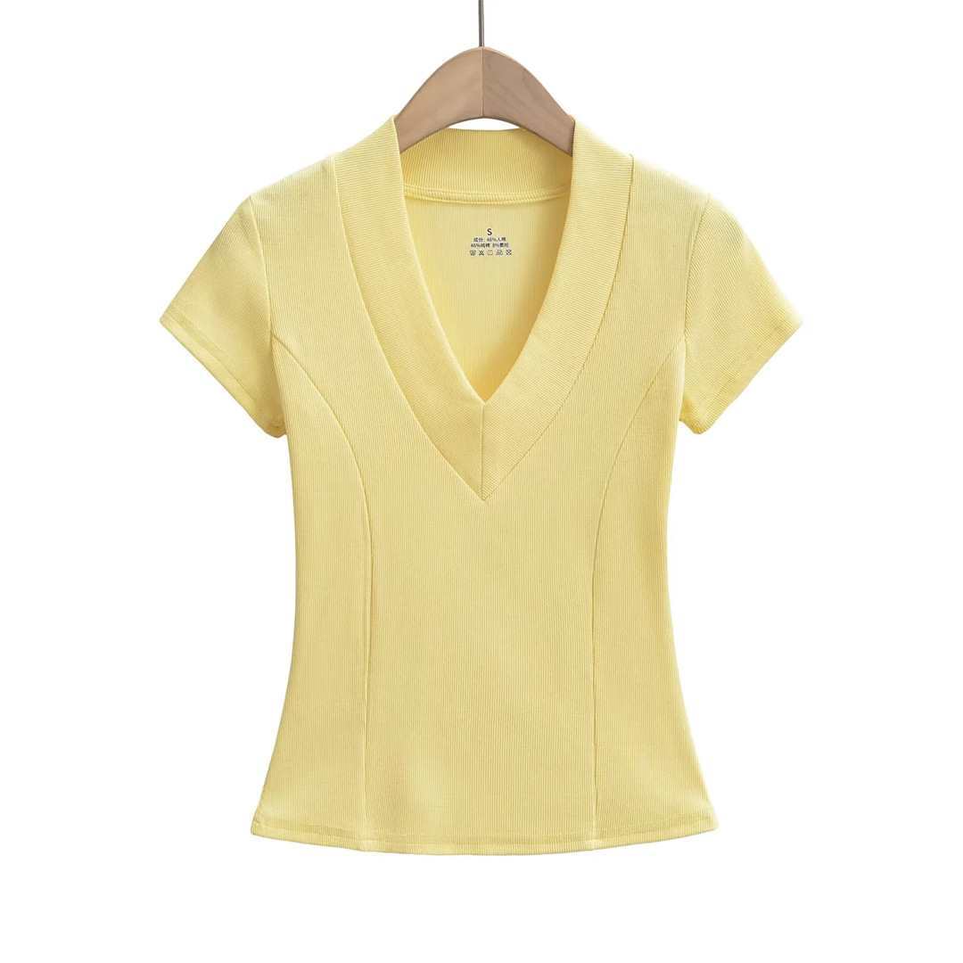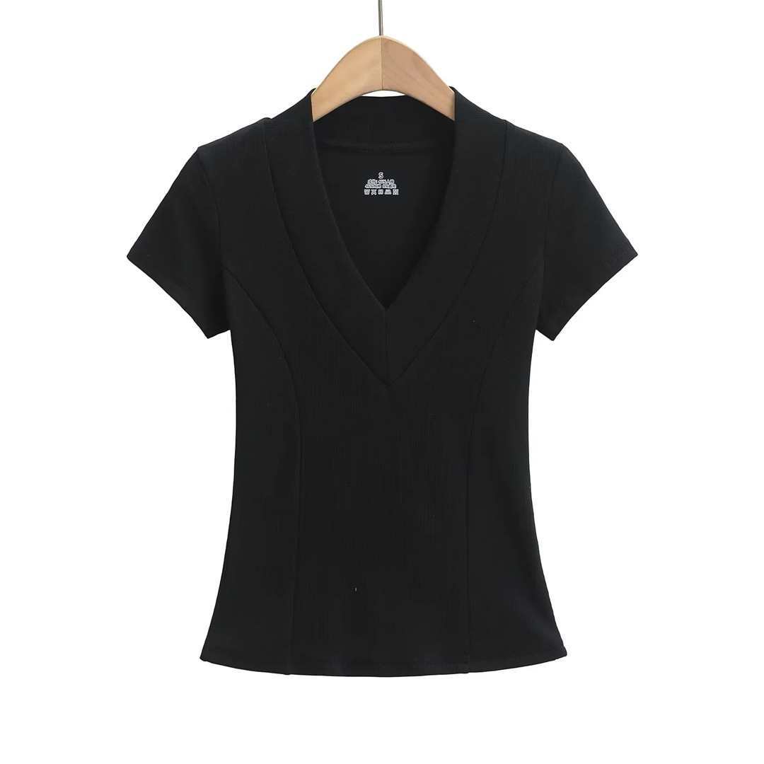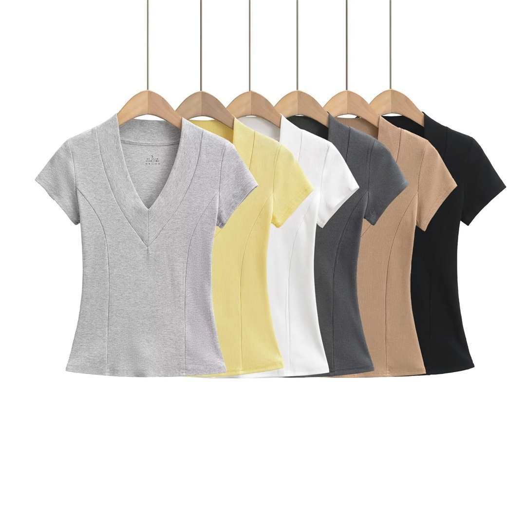 Retro Slim Cuello Profundo Color Sólido Elástico para Mujer Sexy Americano Verano Camisa Nicho Hombro Derecho Top Manga Corta Chica Caliente