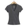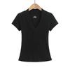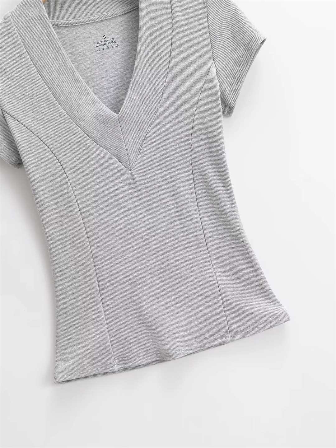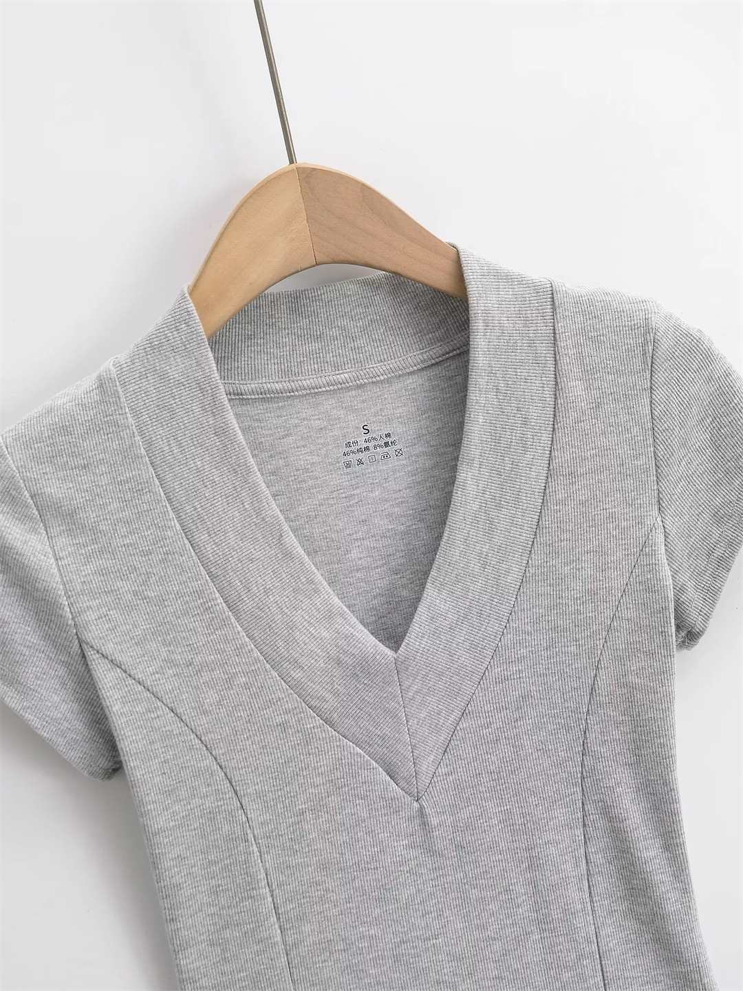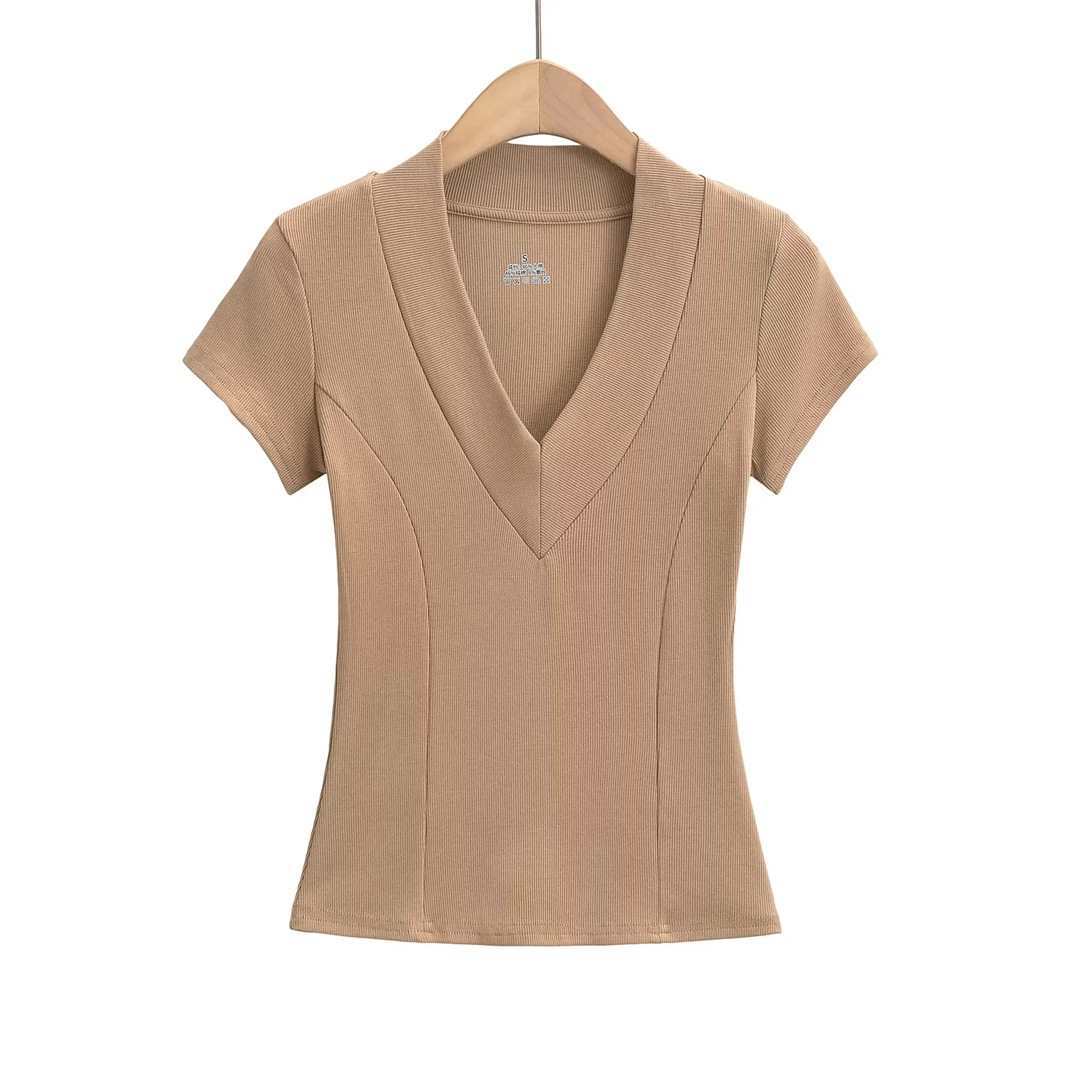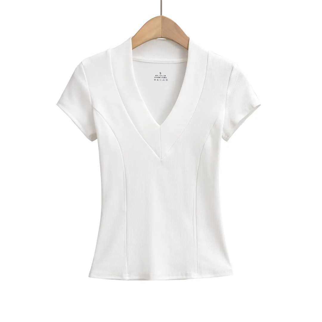 Retro Slim Cuello Profundo Color Sólido Elástico para Mujer Sexy Americano Verano Camisa Nicho Hombro Derecho Top Manga Corta Chica Caliente