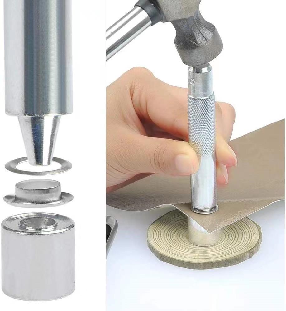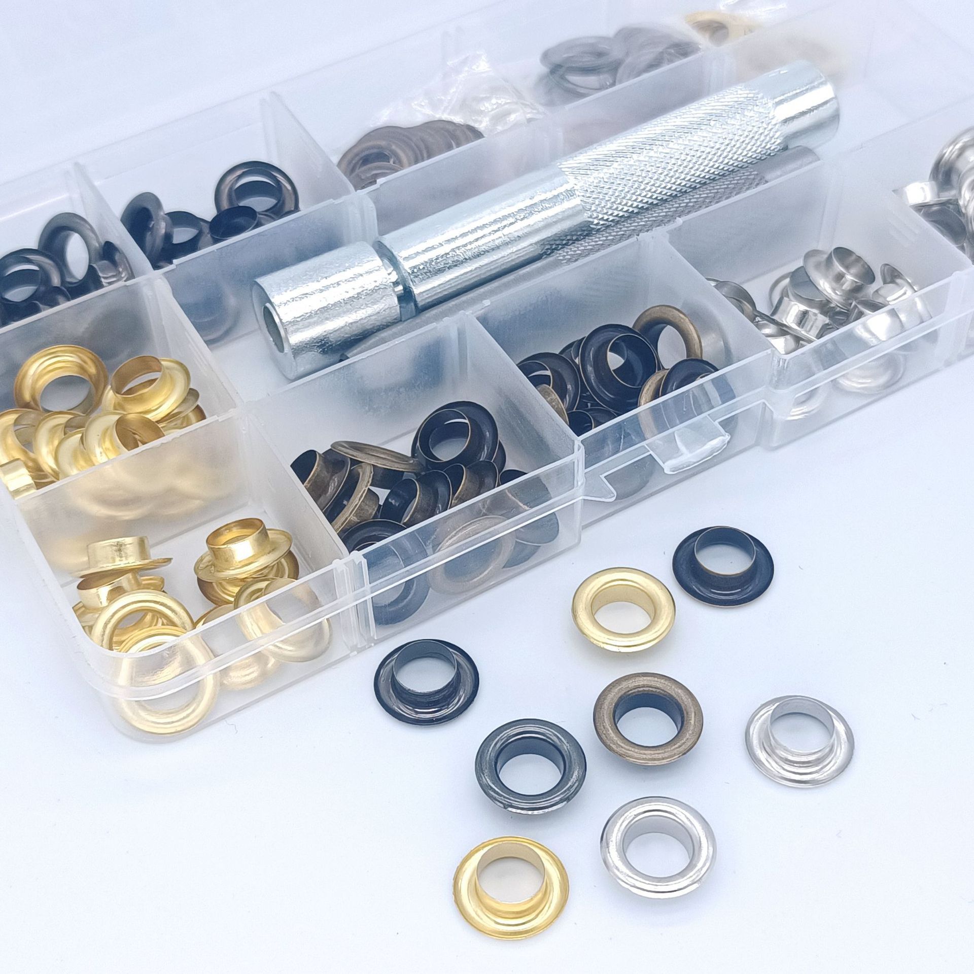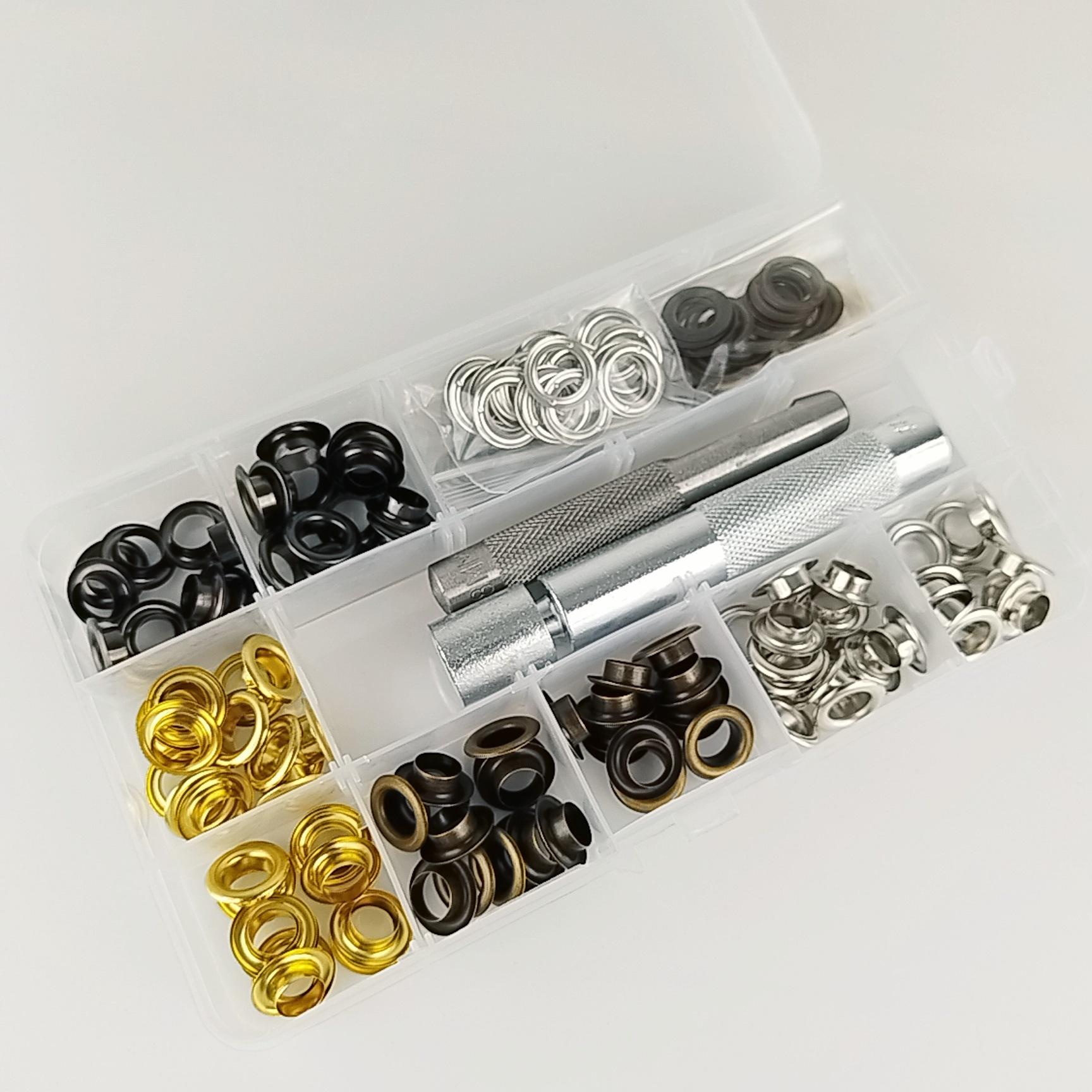 Especificaciones: 100 juegos de ojales de 8 mm (4 colores) en una caja con accesorios de herramientas