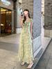Vestido midi ajustado de verano para mujer, estilo vintage, con cuello cuadrado francés, estampado floral azul y cintura ajustada, famoso en Internet.