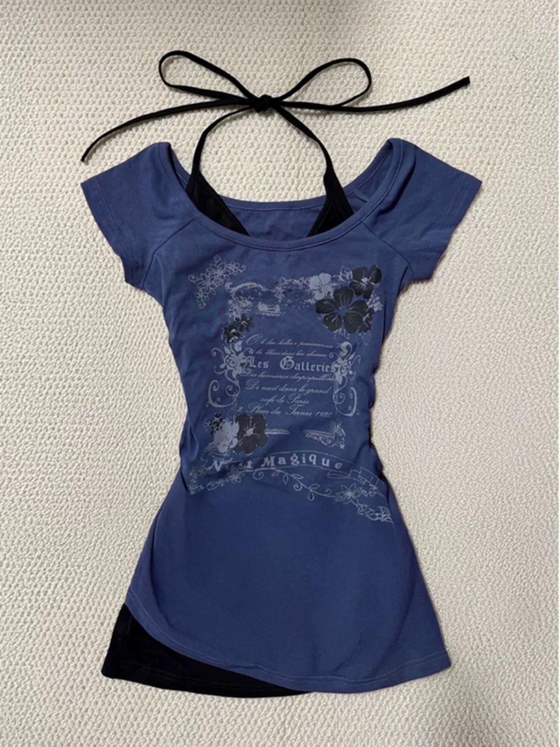 Vestido de verano para mujer de estilo retro americano azul transfronterizo de dos piezas falsas con cuello, falda ajustada a la cadera, venta al por mayor