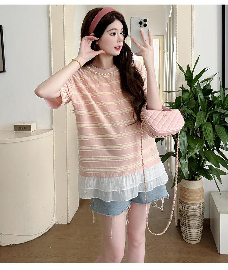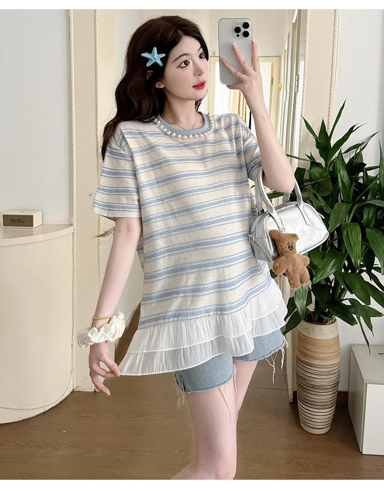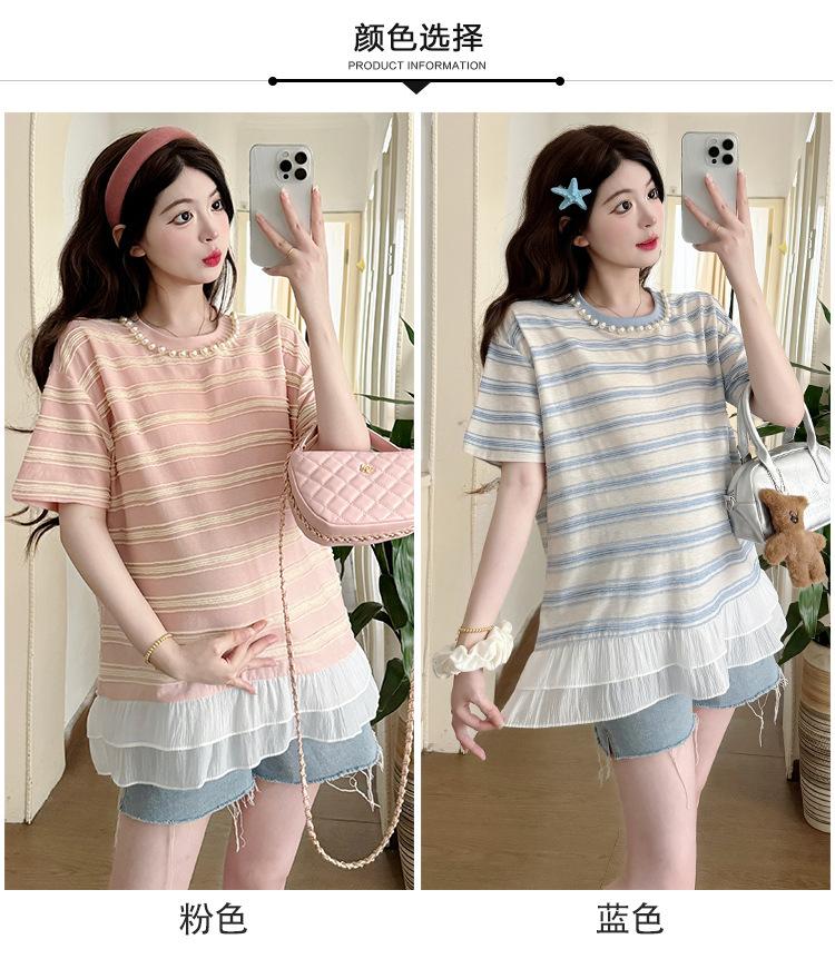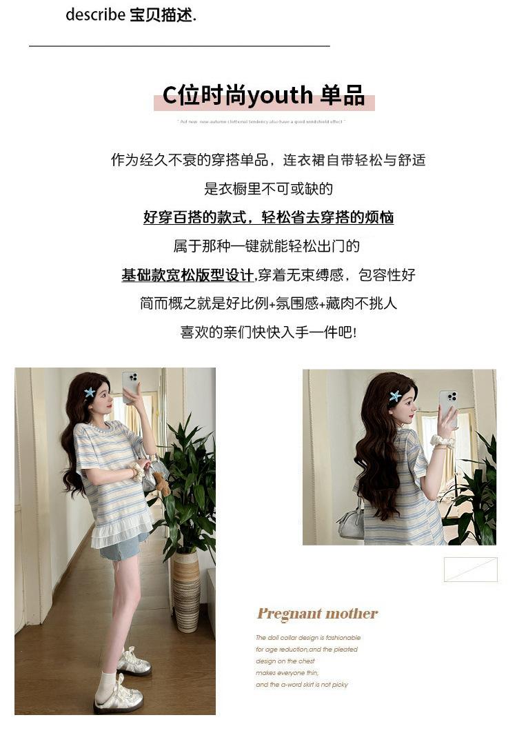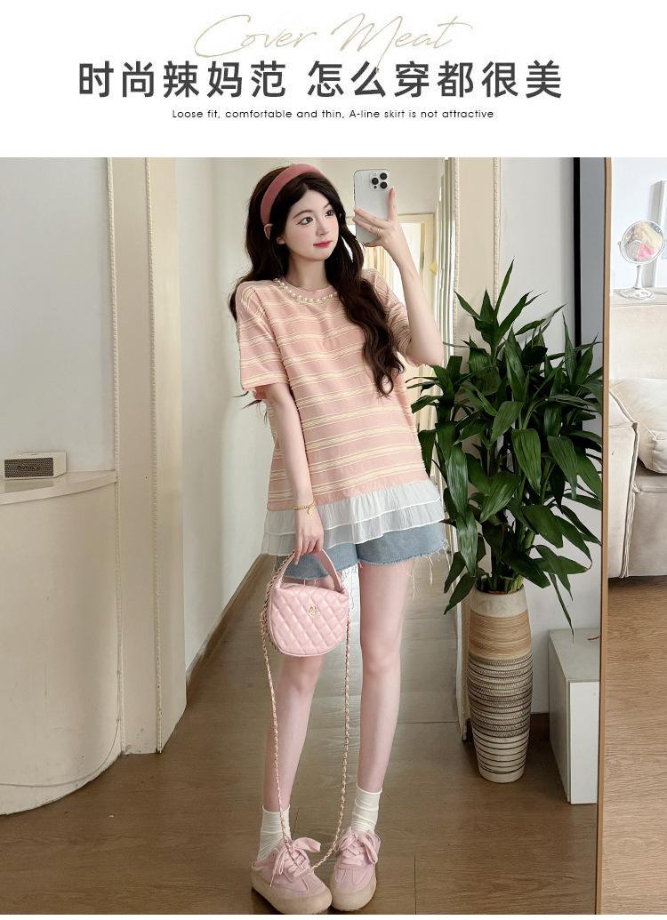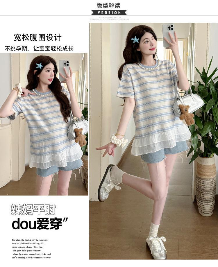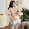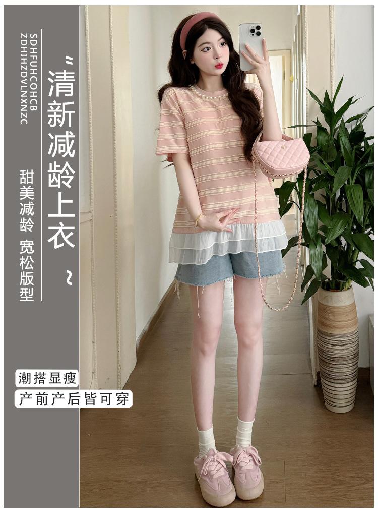 En stock 2025 Verano Nuevas Mujeres Embarazadas T Coreano Dulce Rayado Costura Gasa Suelta Mujeres Embarazadas Top