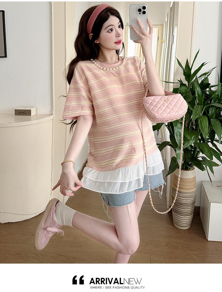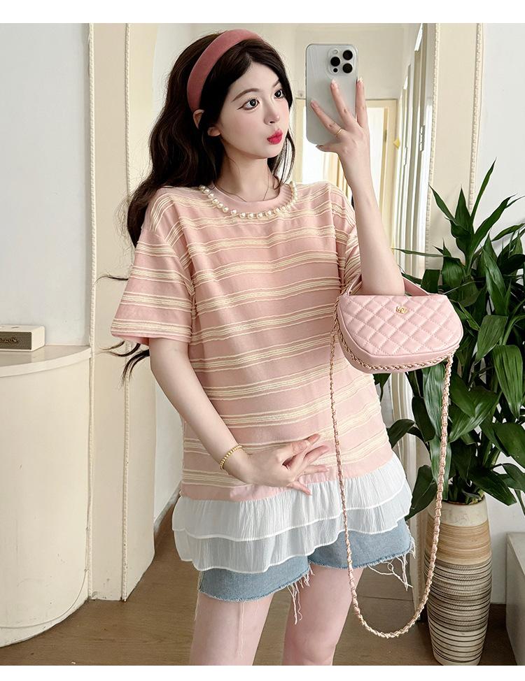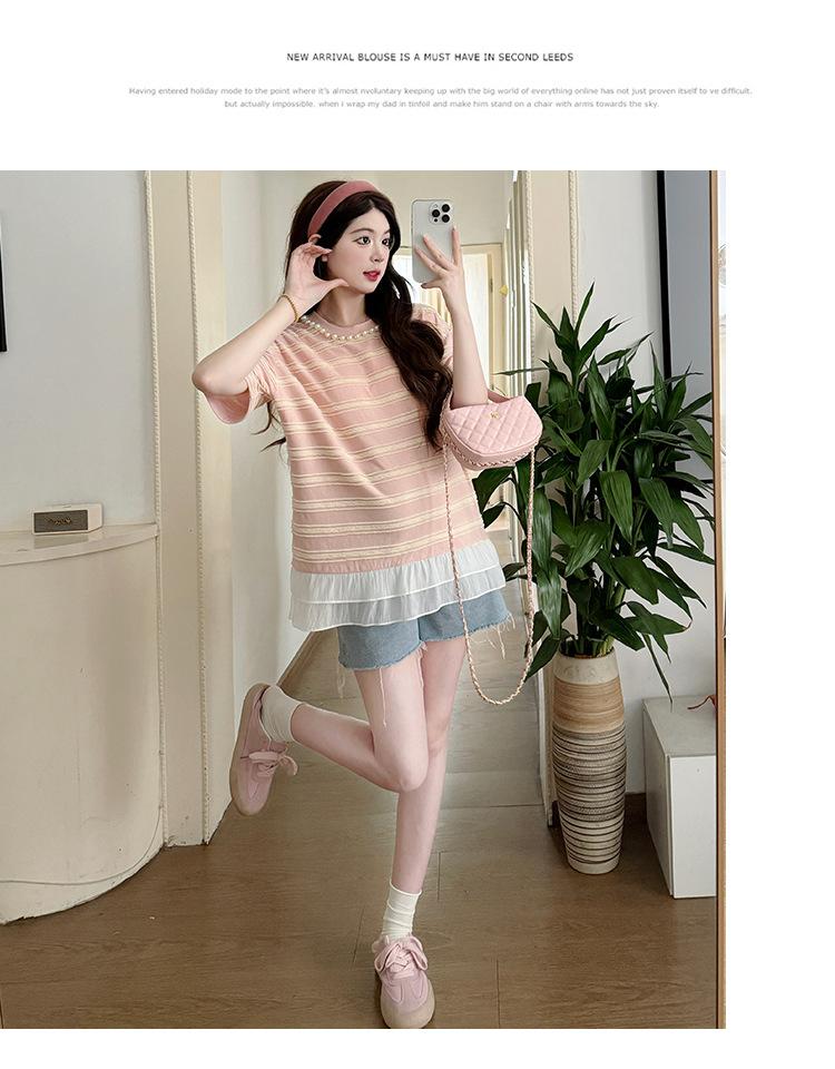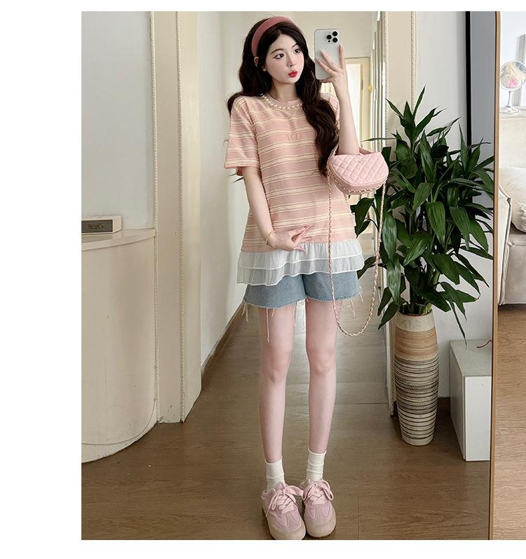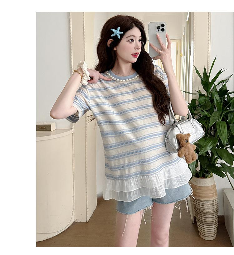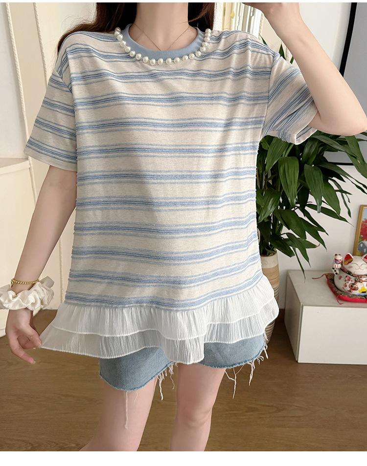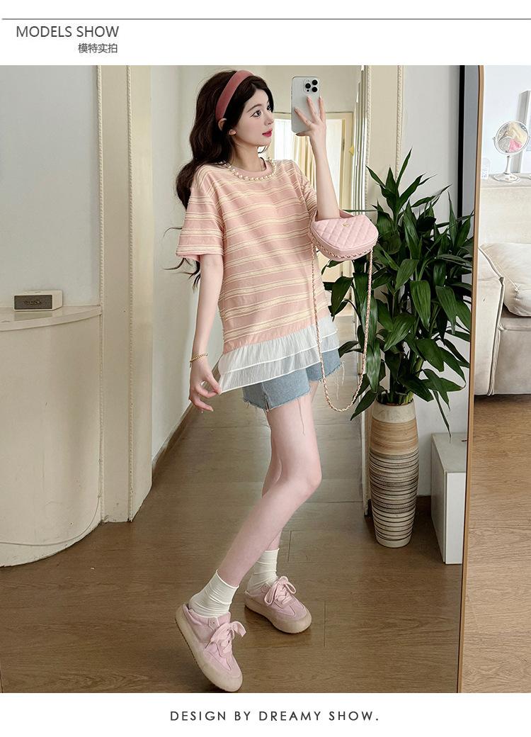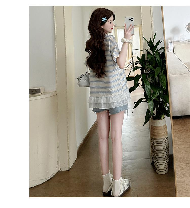 En stock 2025 Verano Nuevas Mujeres Embarazadas T Coreano Dulce Rayado Costura Gasa Suelta Mujeres Embarazadas Top