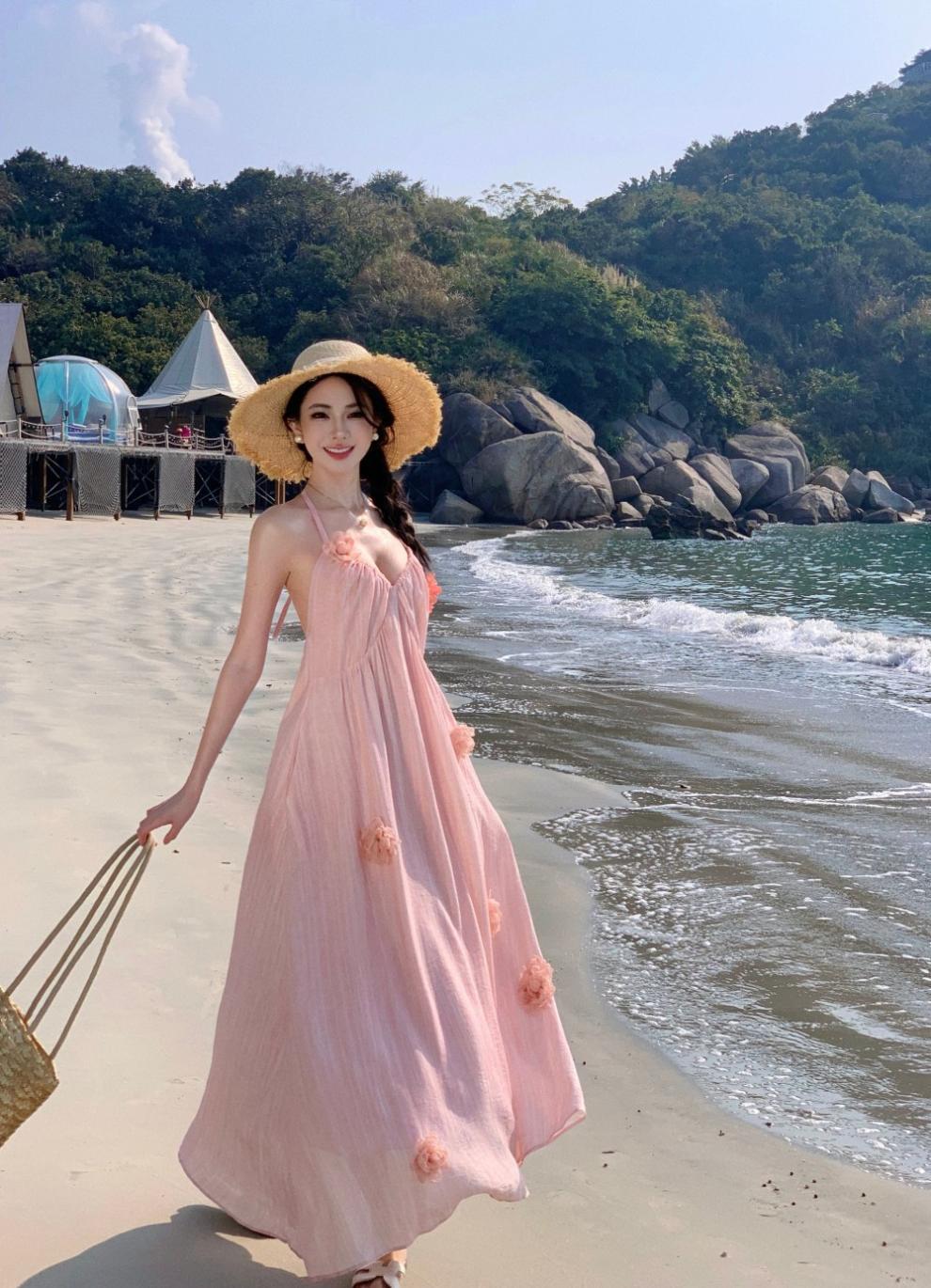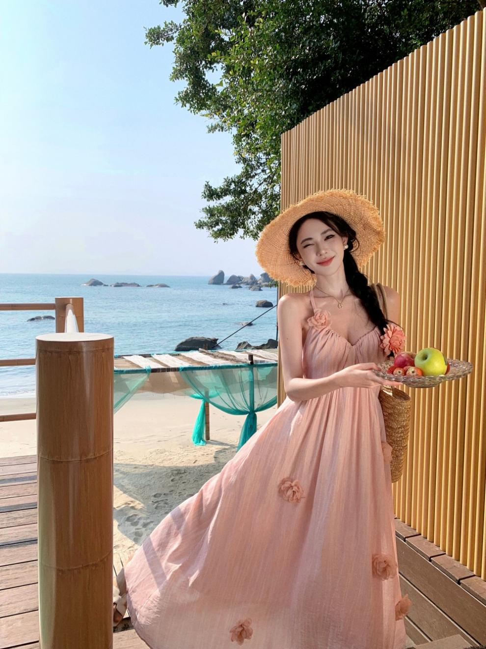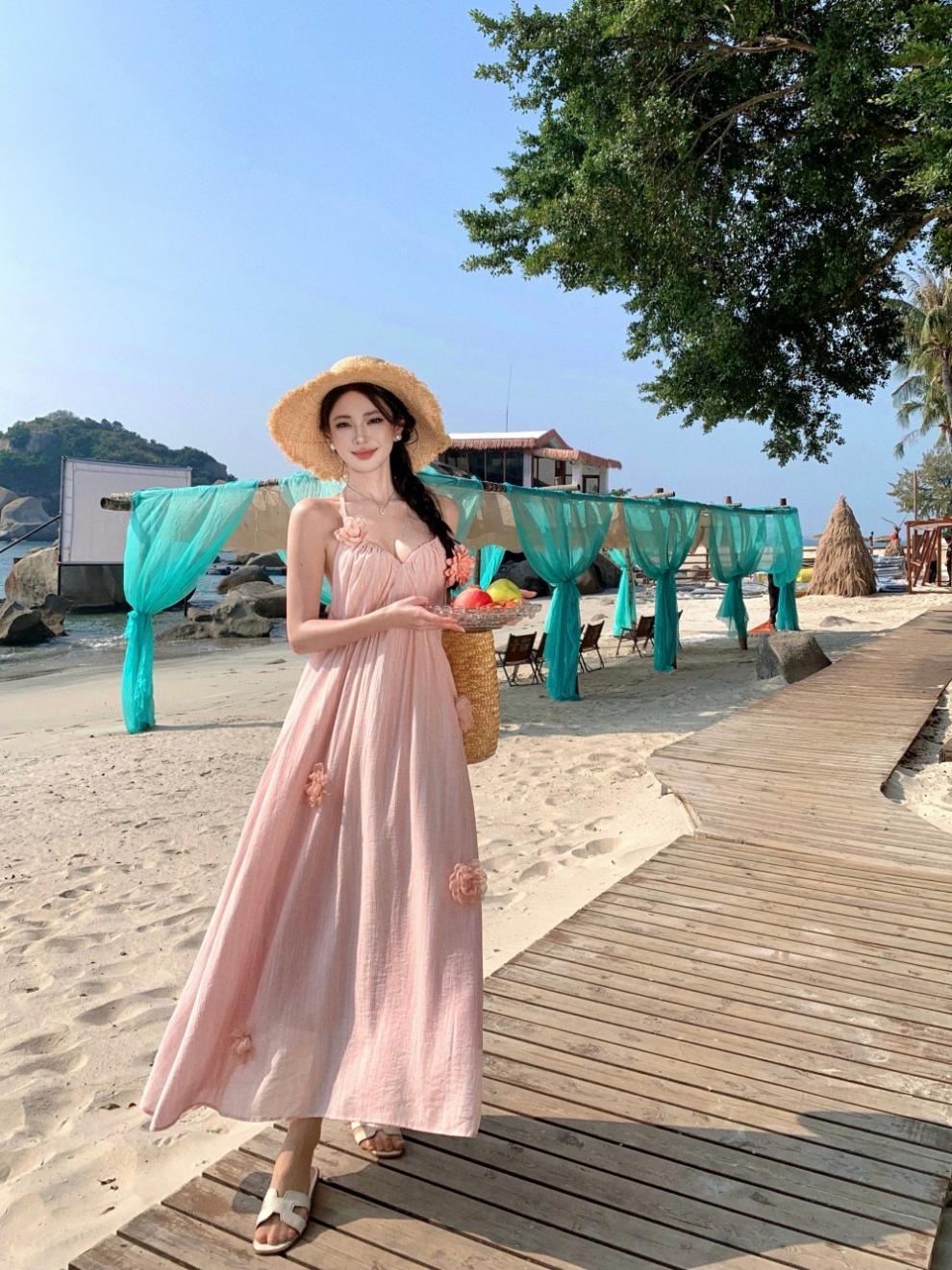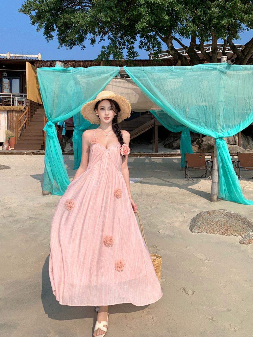 Vestido colgante de cuello estilo festivo de flor rosa pat real Vestido de playa de alta gama de hada dulce y gentil