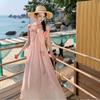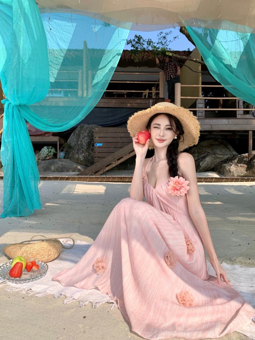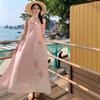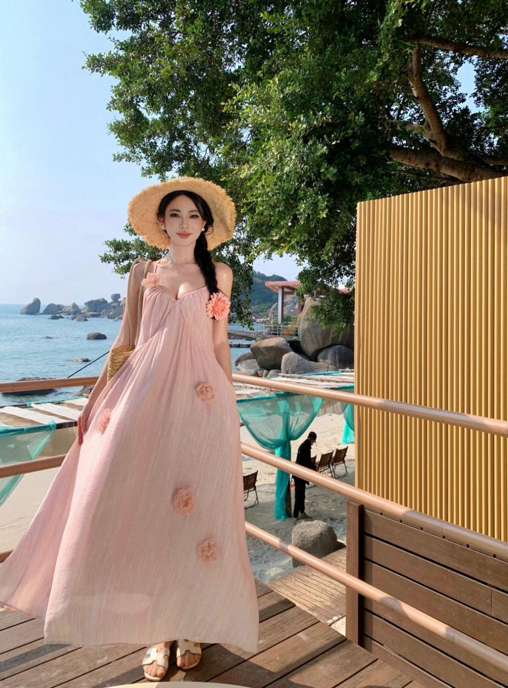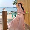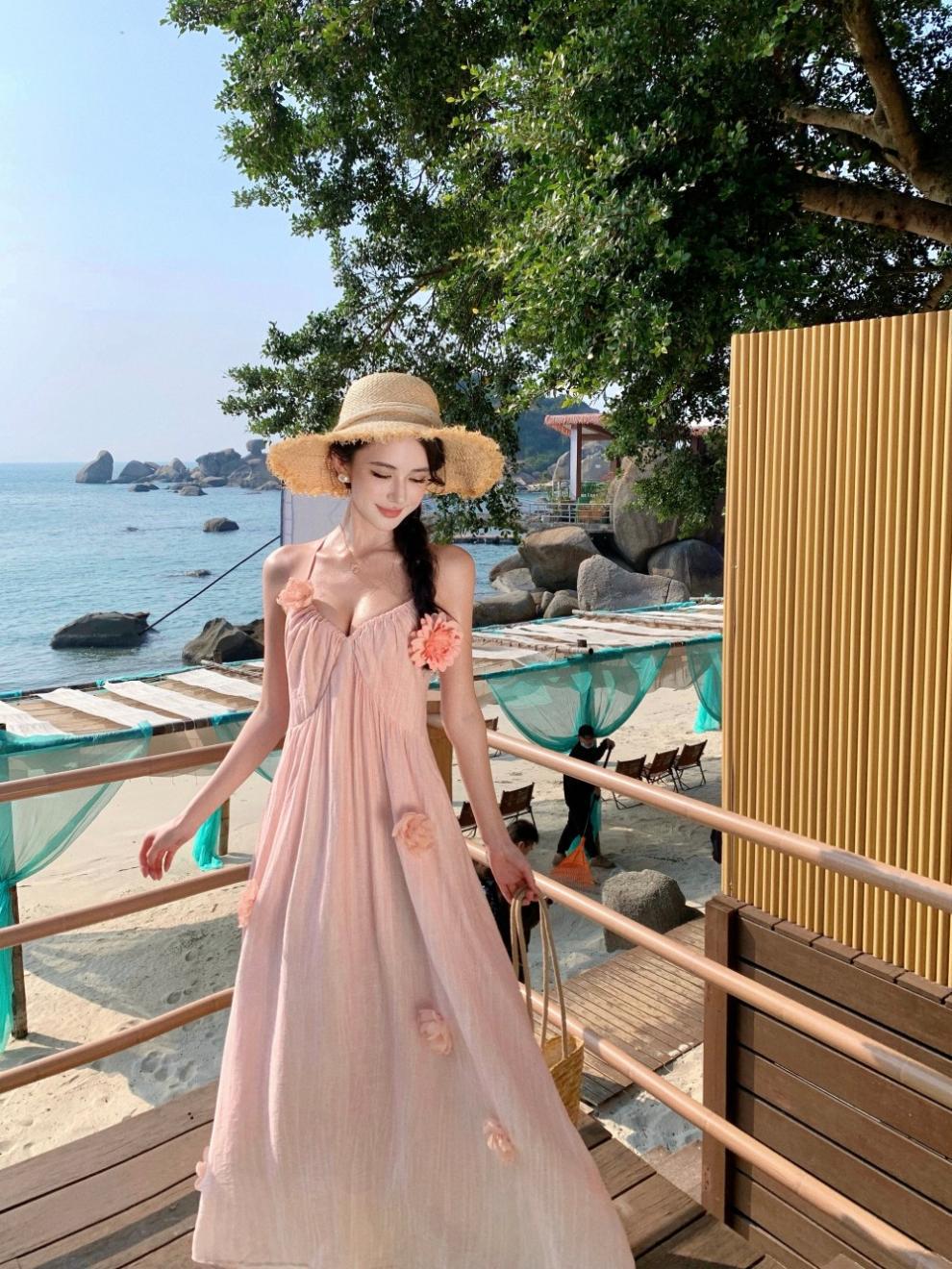 Vestido colgante de cuello estilo festivo de flor rosa pat real Vestido de playa de alta gama de hada dulce y gentil