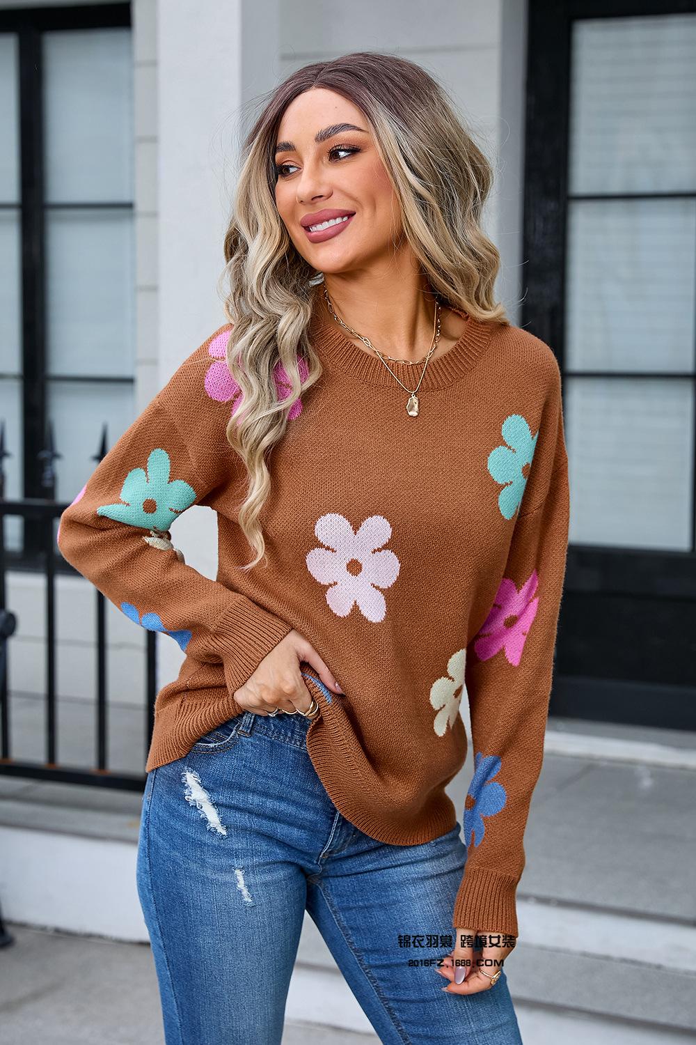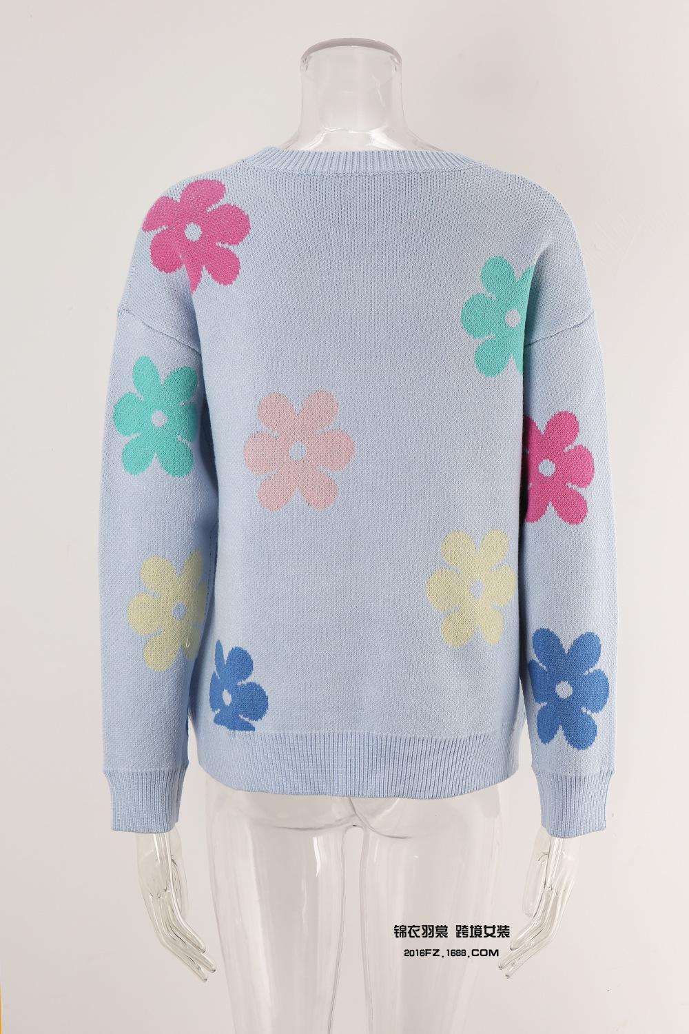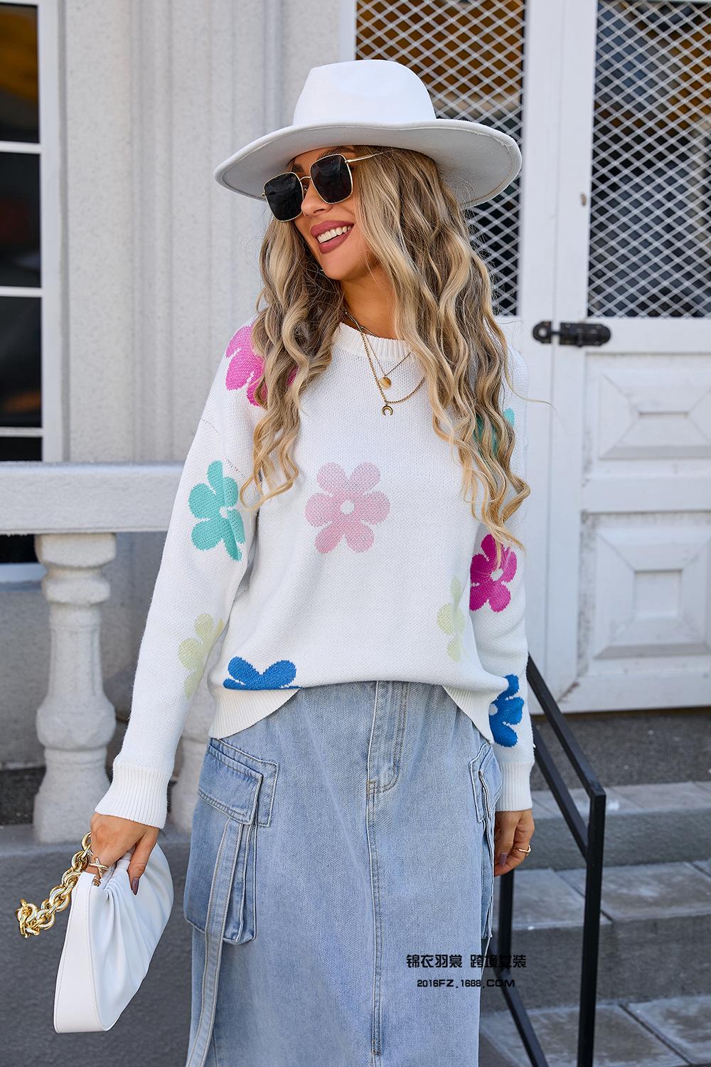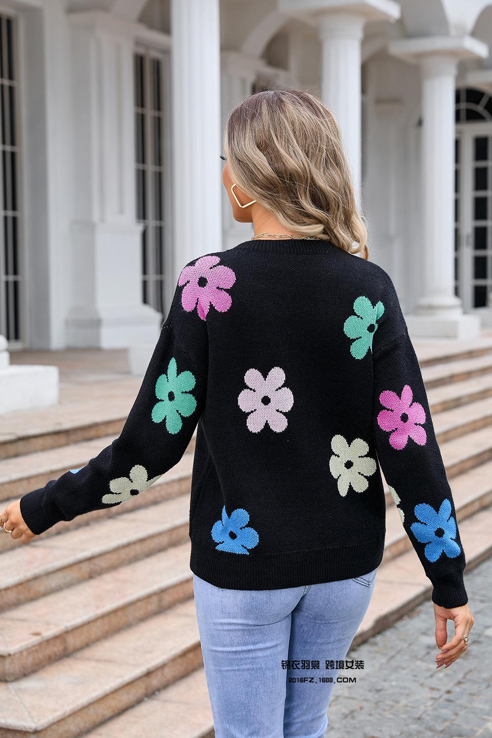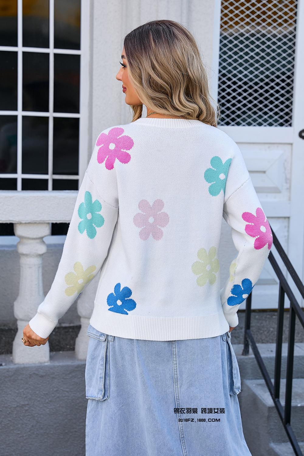 Ropa de Primavera 2025 Exportación Europea y Americana Nueva Prendas de Punto Transfronterizas Amazon Popular Bloque de Color Floral Cuello Redondo Prendas de Punto Versátiles