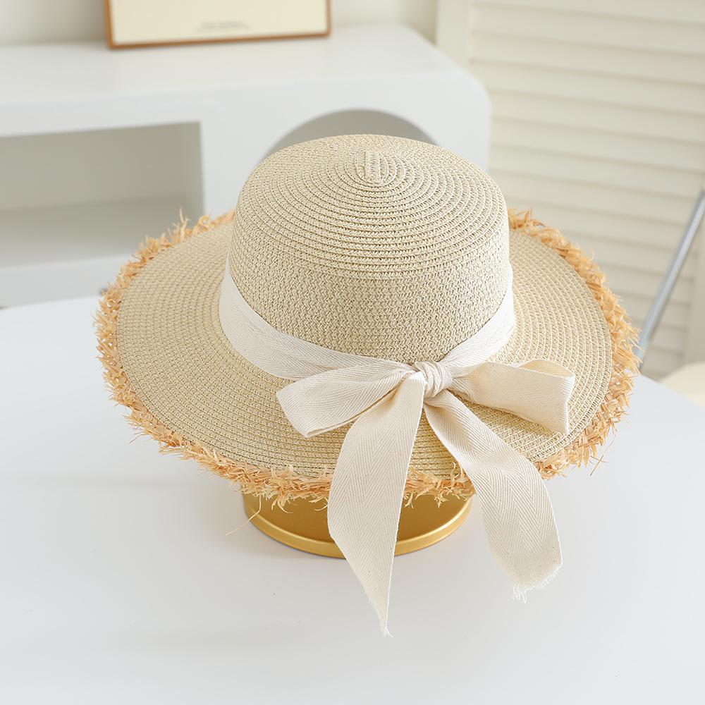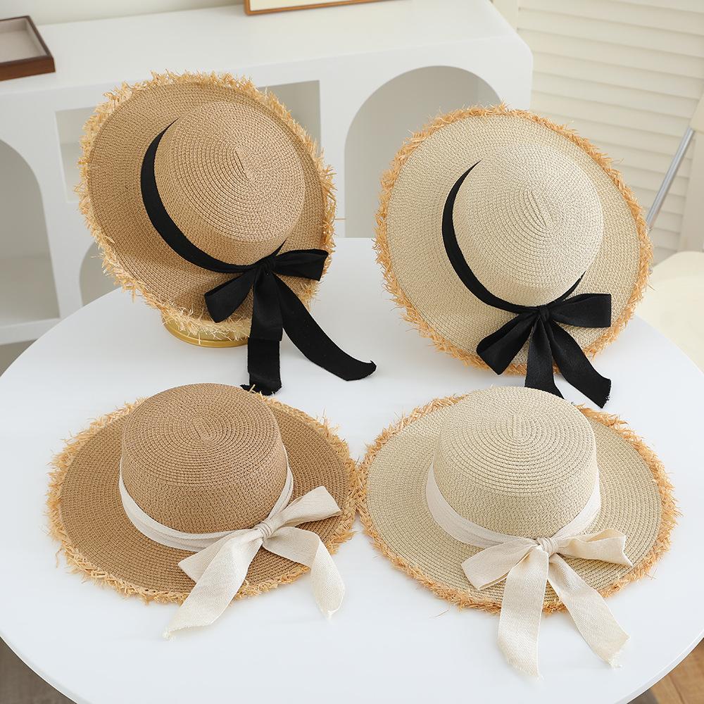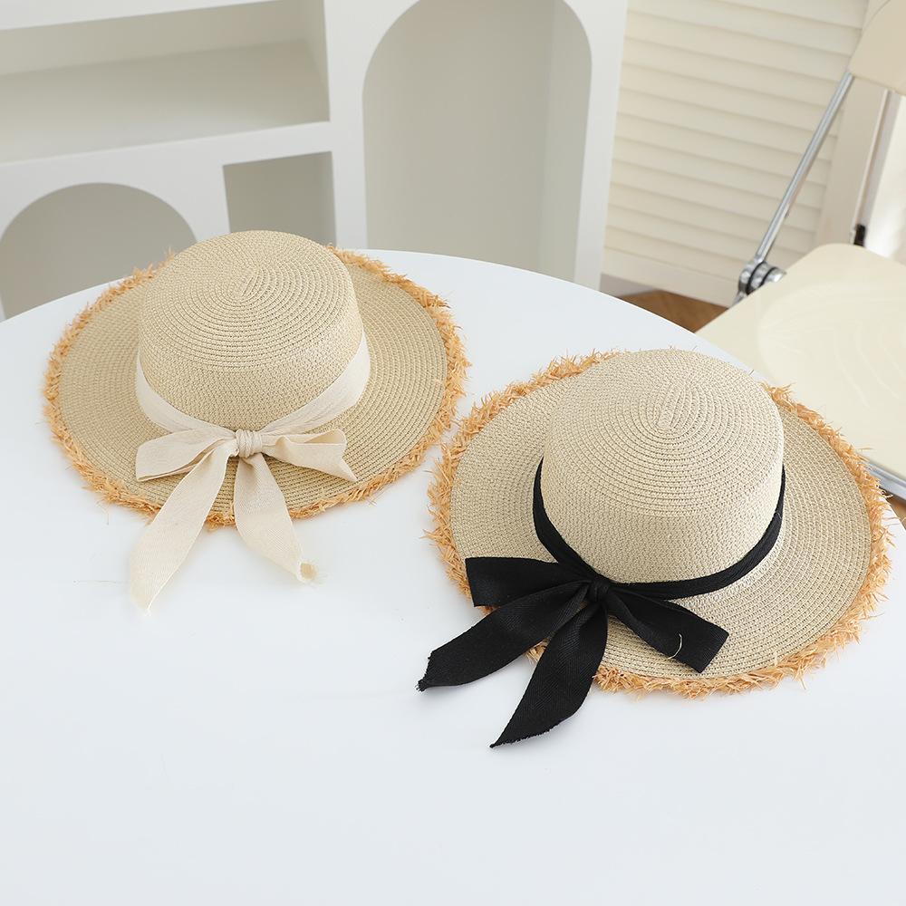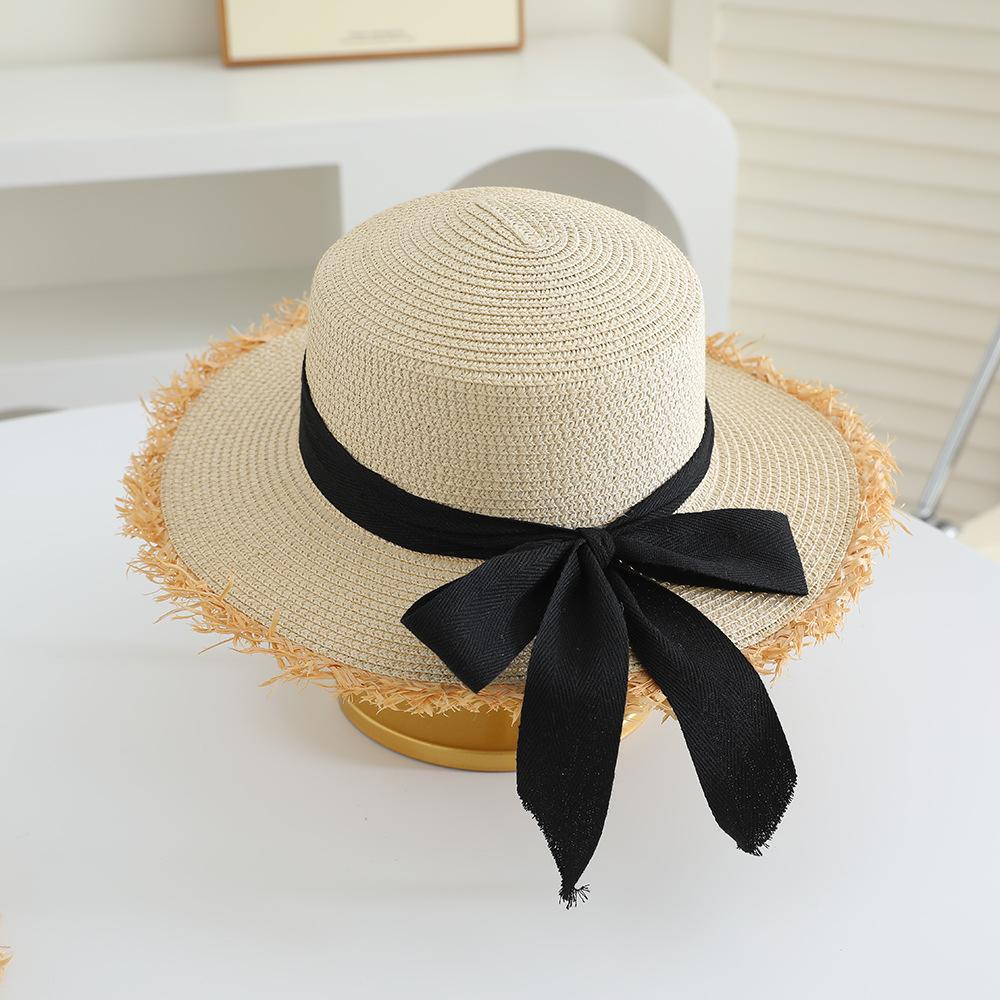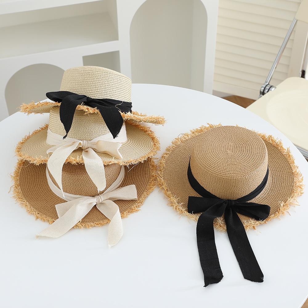 Sombrero Primavera y Verano Moda Mujer Sombrero de Paja Sombrero de Playa para Vacaciones Marítimas Sombrero de Sol de Rafia con Copa Plana y Lazo de Cinta