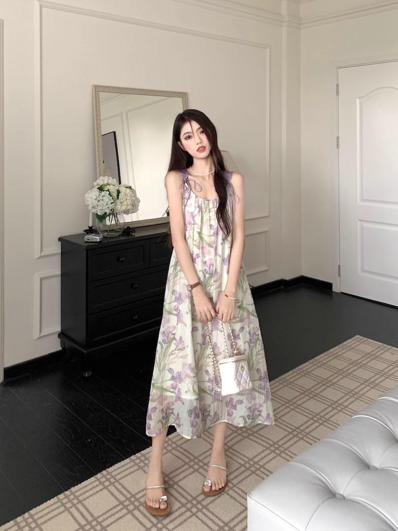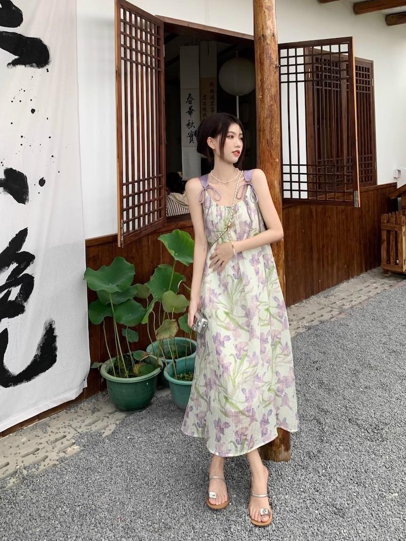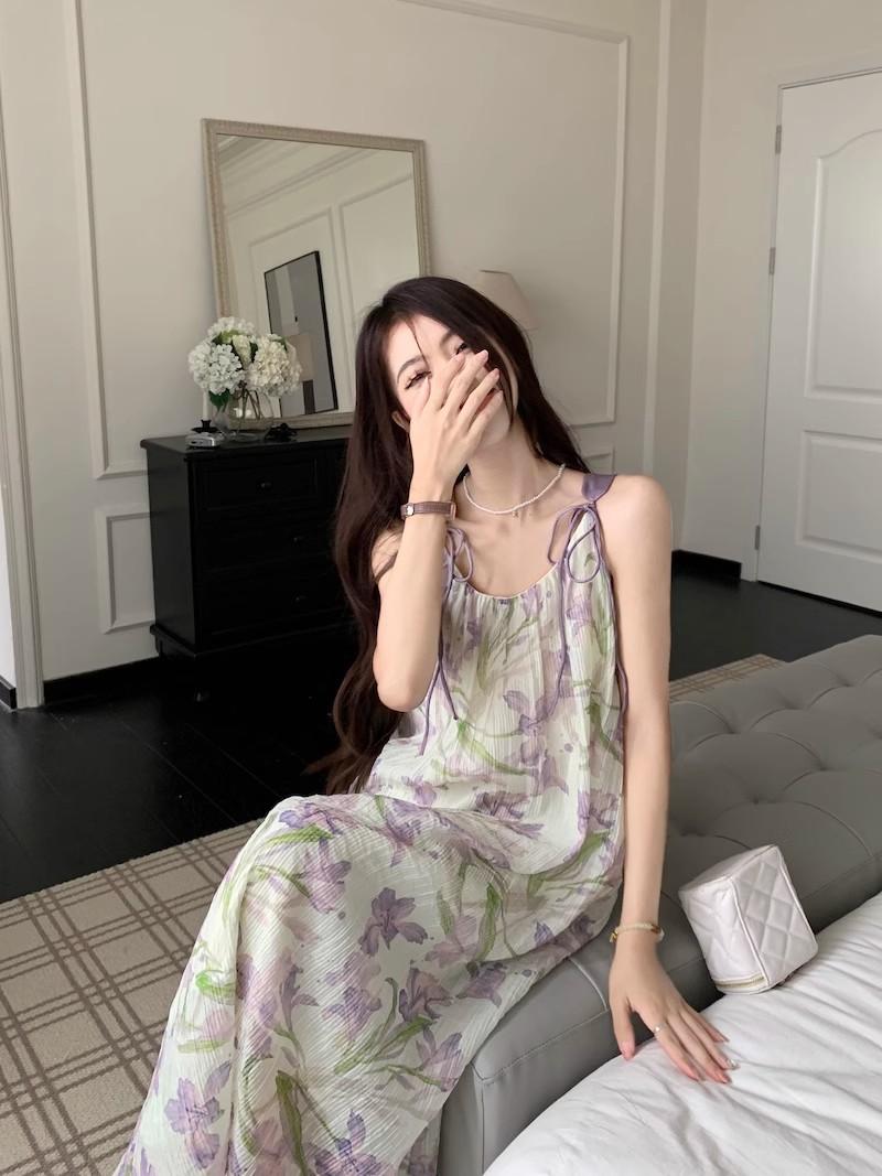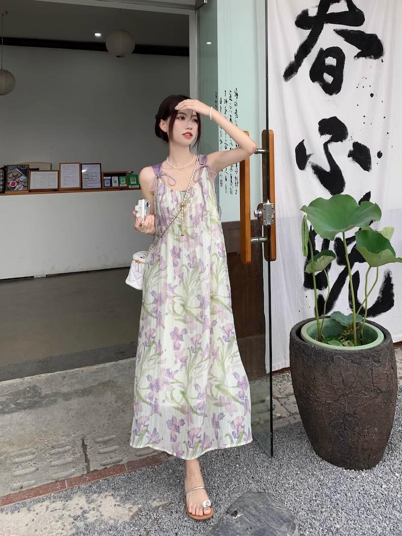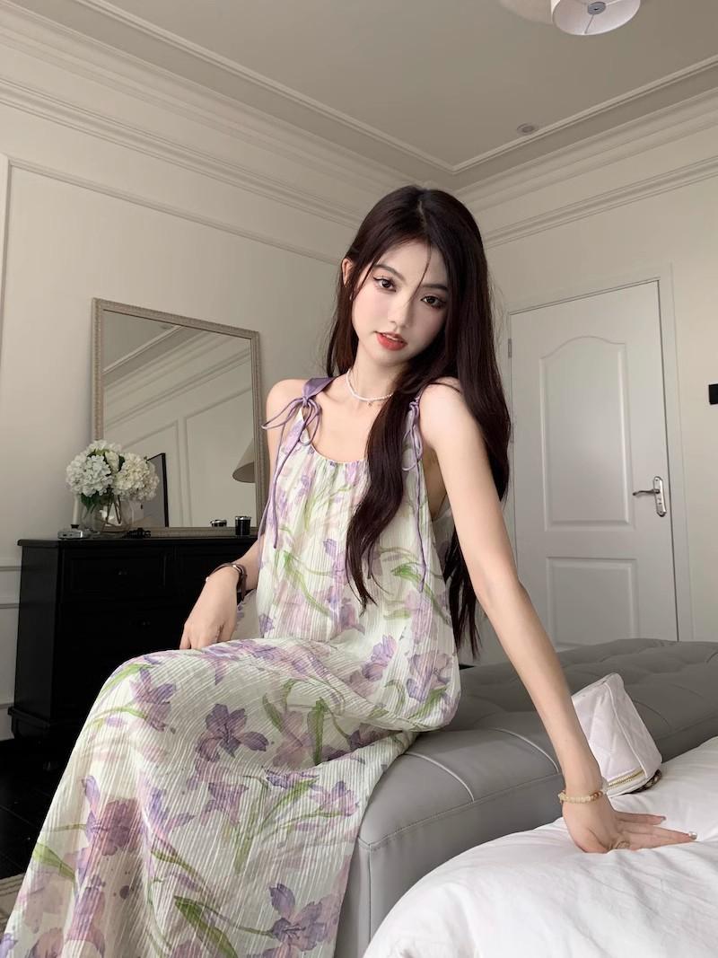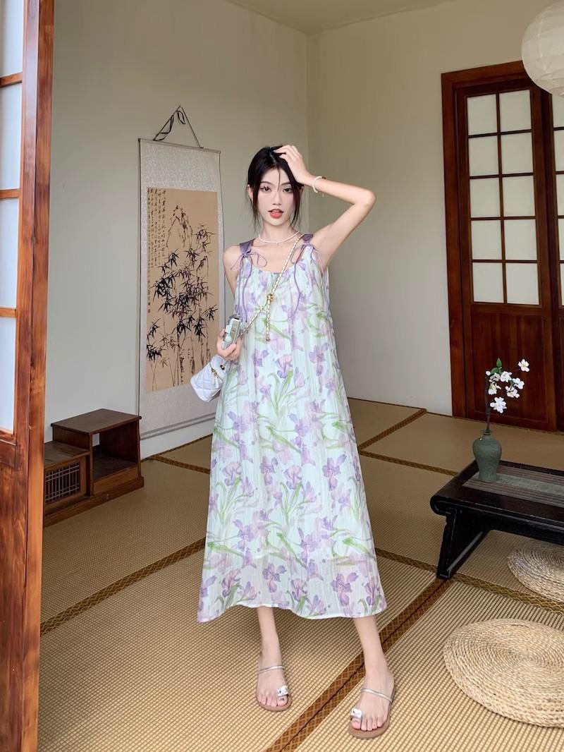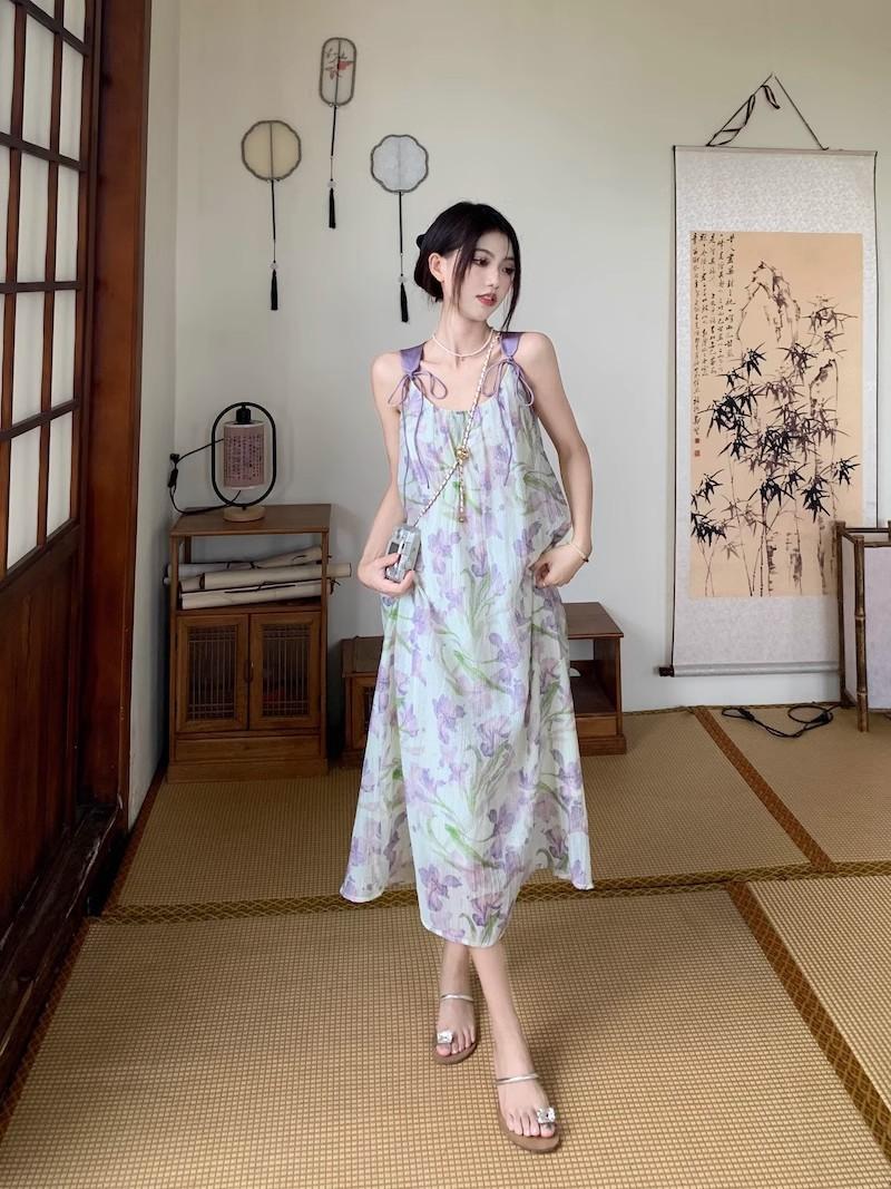 (con interior) Vestido largo elegante de verano con tirantes finos y estampado floral morado para mujer, estilo festivo y suave.